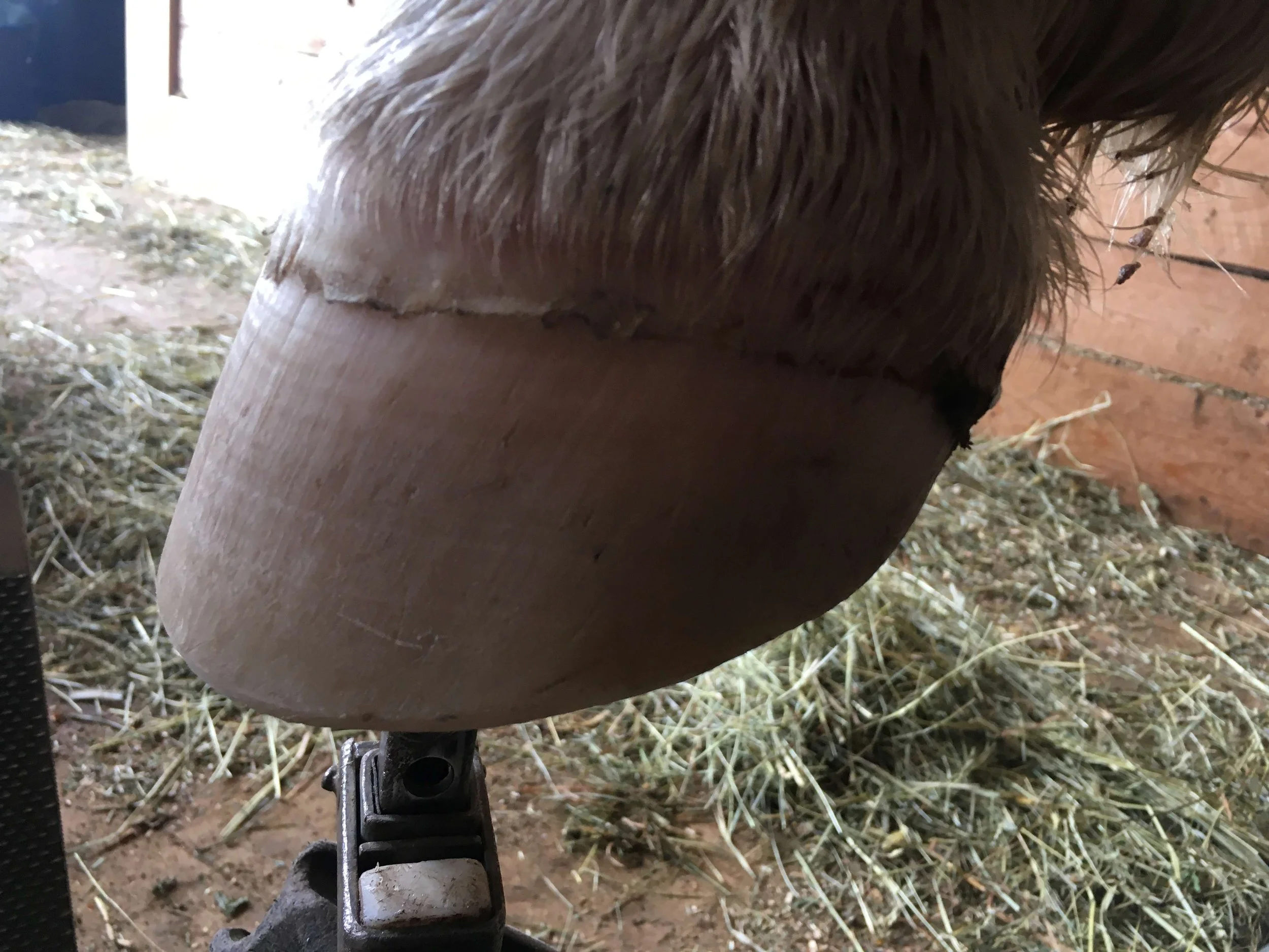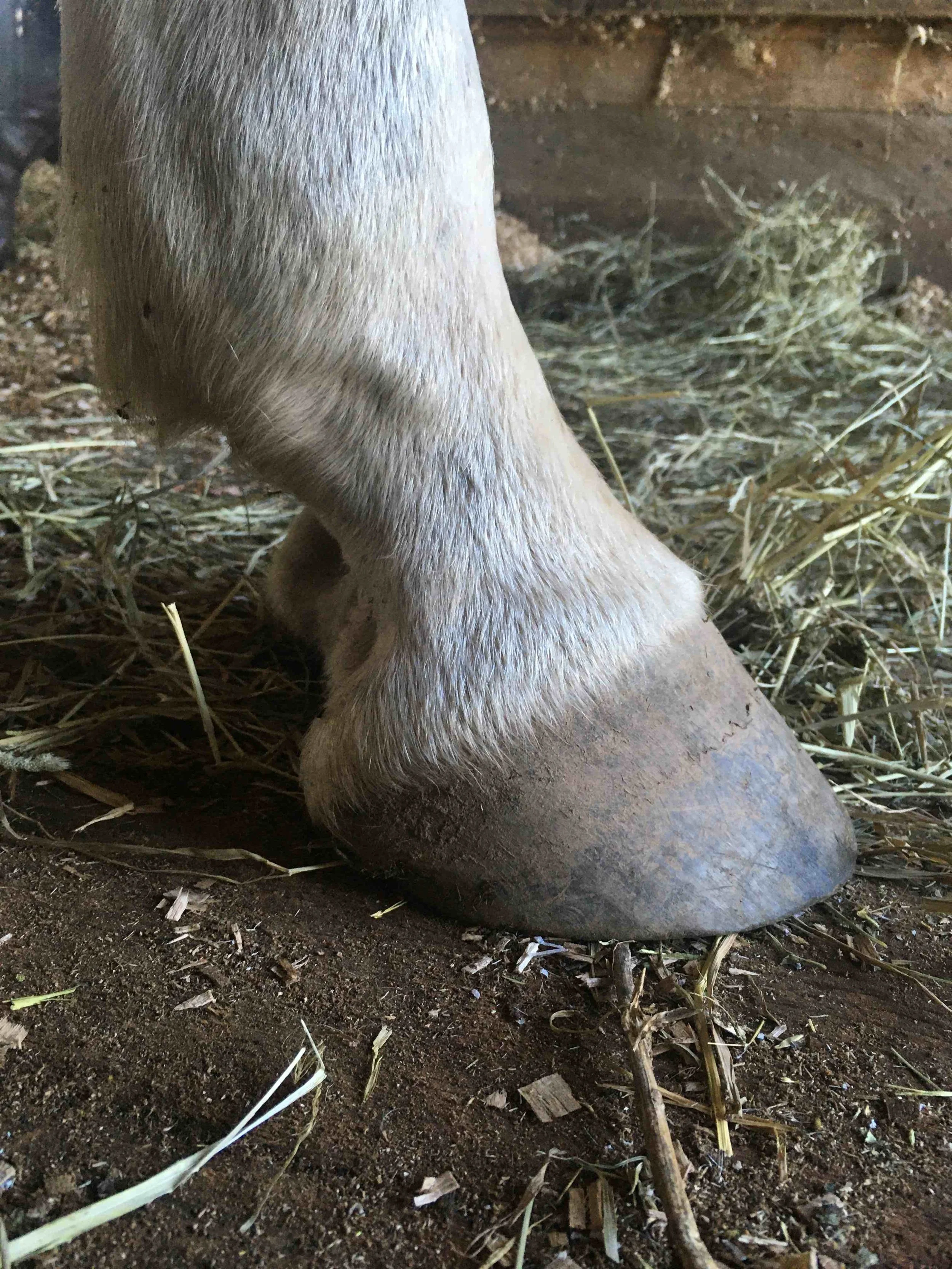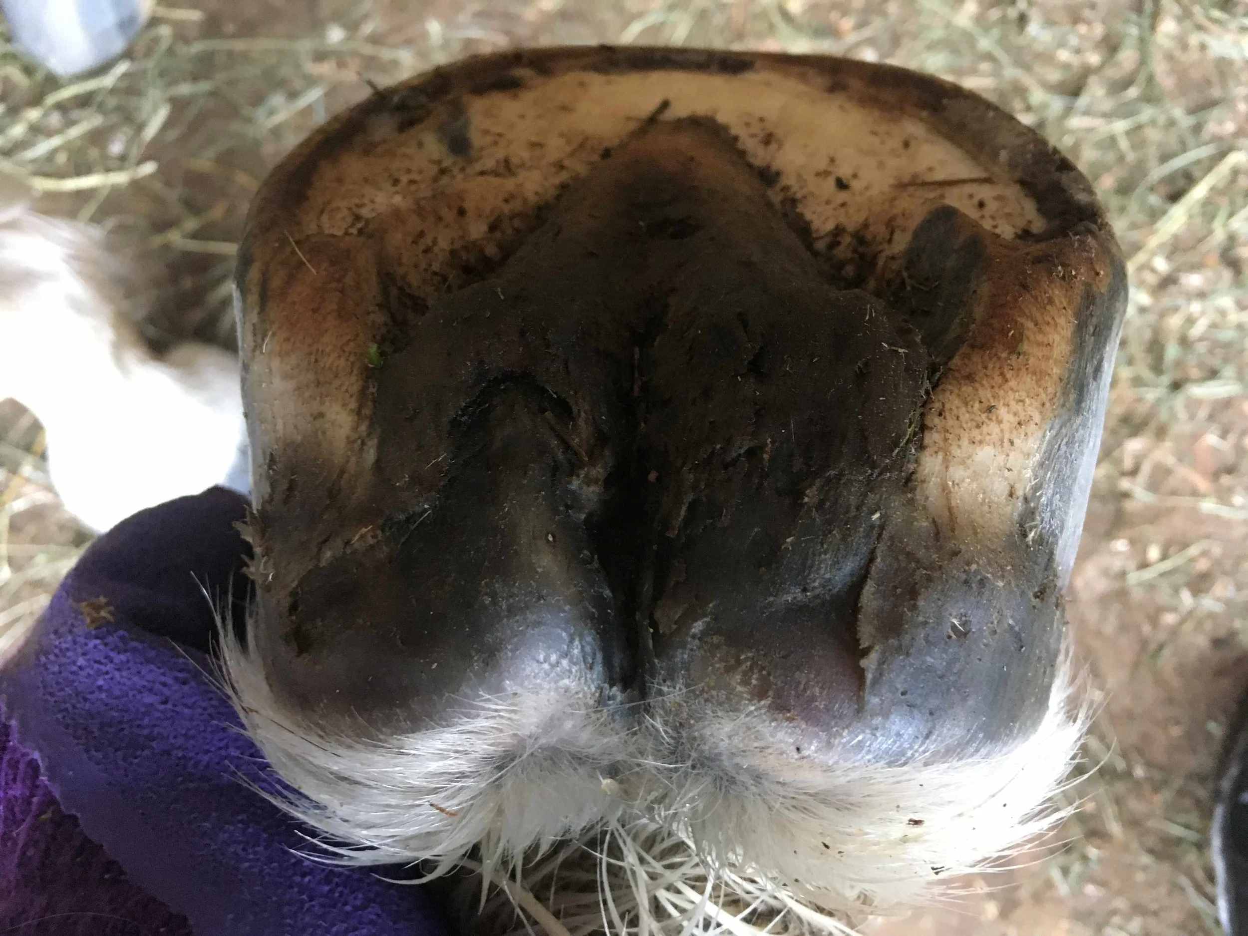 Based on Brune's stance (both pair of legs were standing under) it was very difficult to pick up his hooves and to actually trim. Time and patience brought us along. The atrophy of the back of his hooves was hidden well. The frog material was thick and fleshy but very strange to my eyes. At some point the bulbs opened up and began to fill out. The hooves shifted under the bone column of the legs more and more. Brune got out of the mountain-goat-stance. He transitioned out of the fault of standing under which was not his conformation.