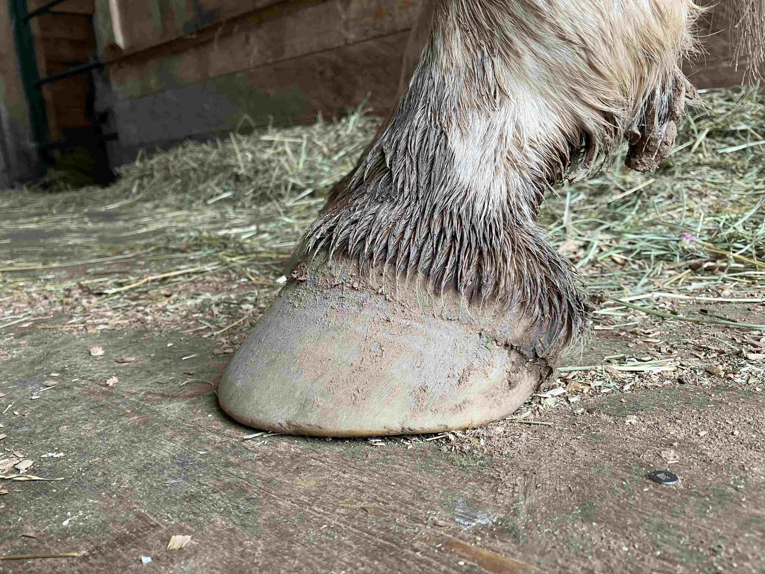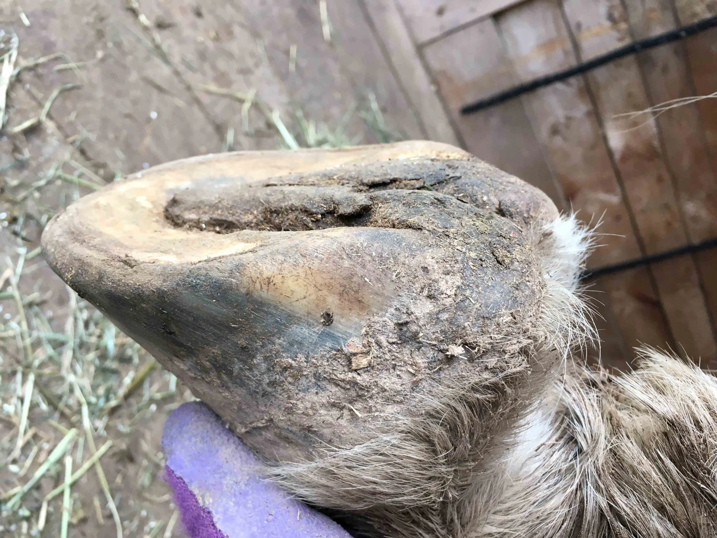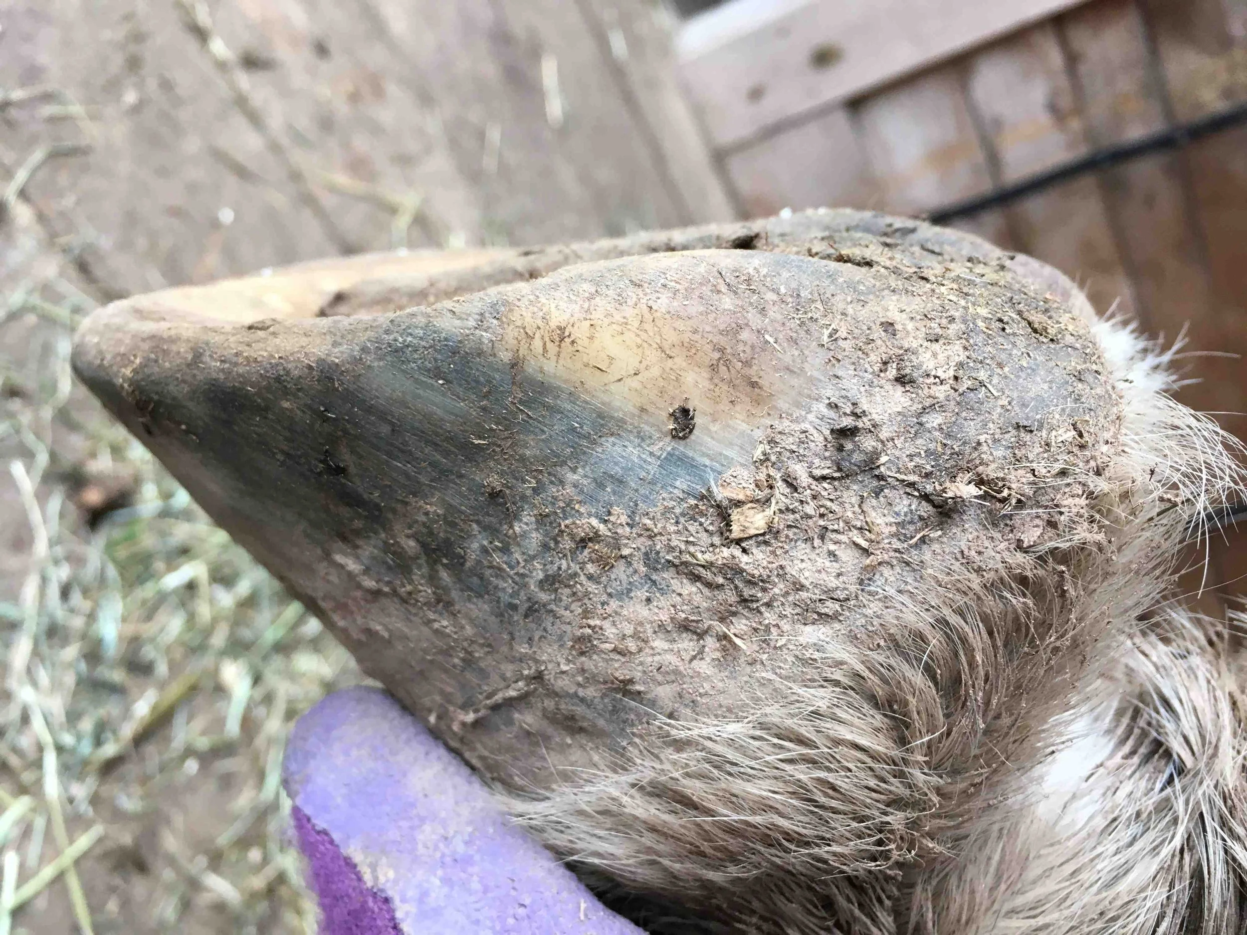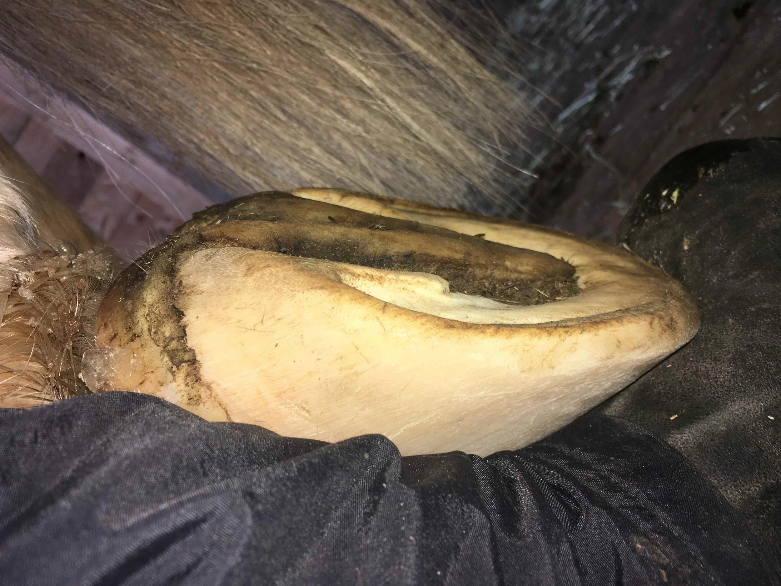 Based on Brune's stance (both pair of legs were standing under) it was very difficult to pick up his hooves and to actually trim. Time and patience brought us along. The atrophy of the back of his hooves was hidden well. The frog material was thick and fleshy but very strange to my eyes. At some point the bulbs opened up and began to fill out. The hooves shifted under the bone column of the legs more and more. Brune got out of the mountain-goat-stance. He transitioned out of the fault of standing under which was not his conformation.
