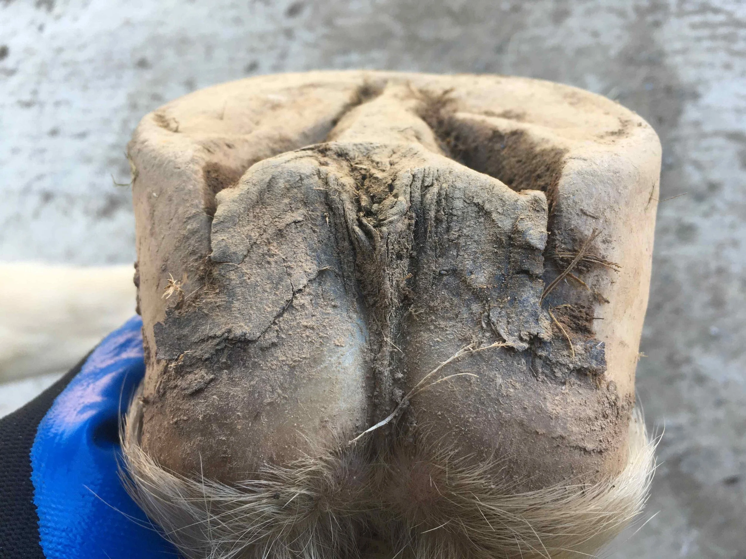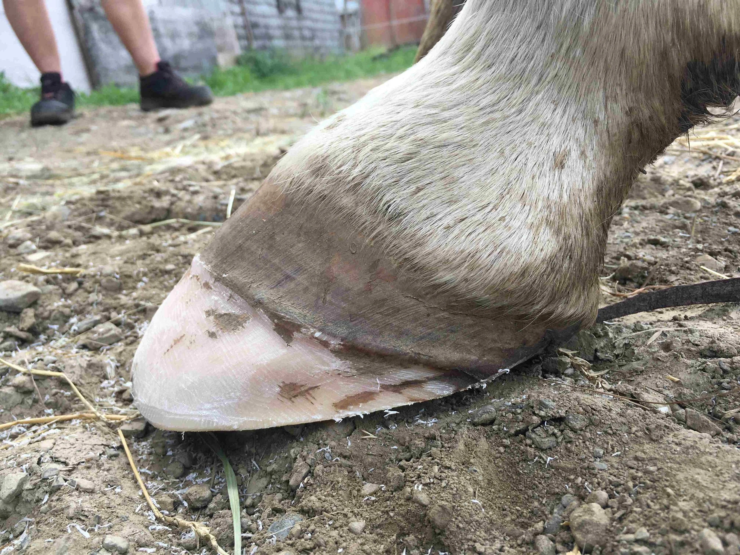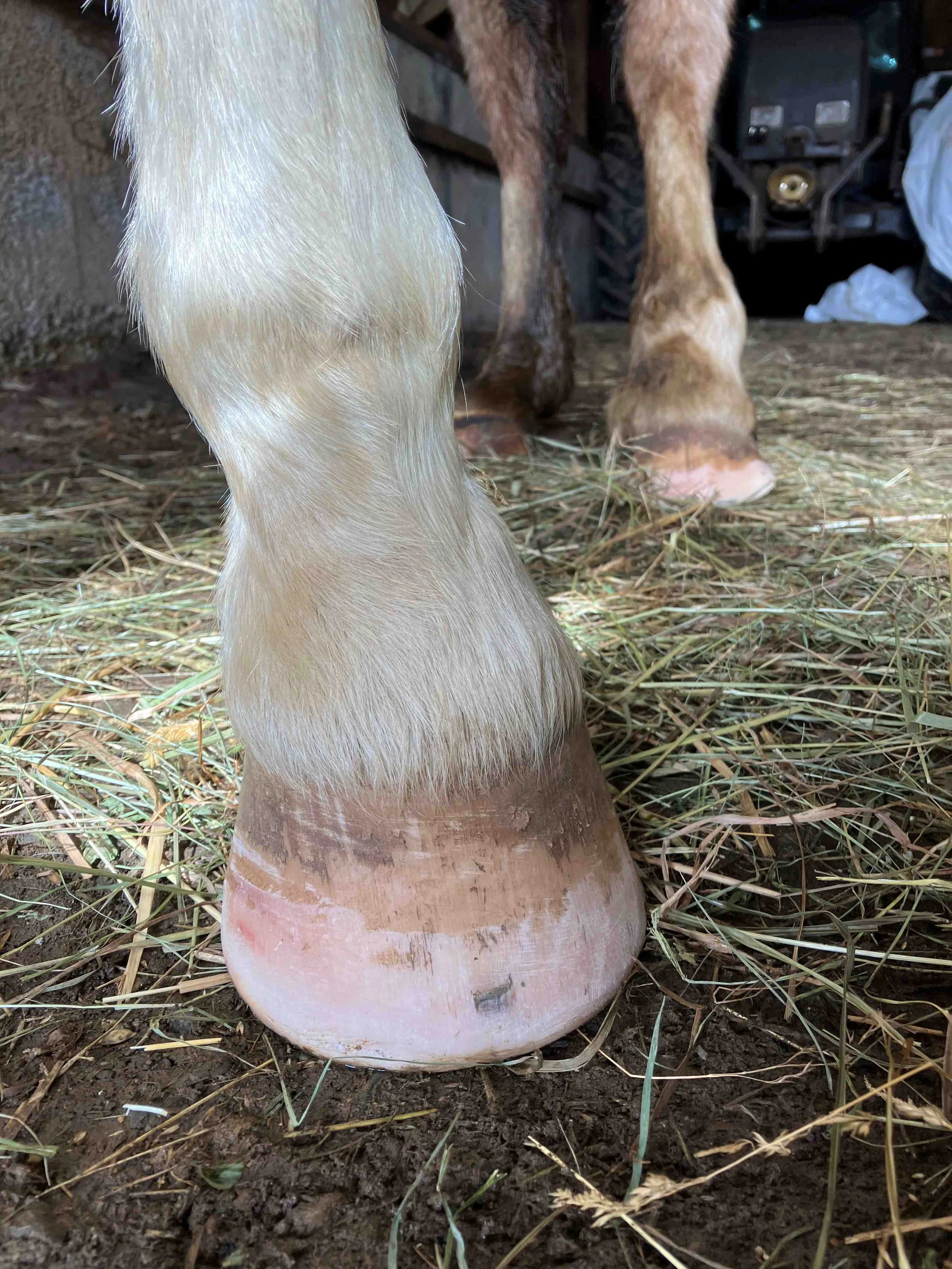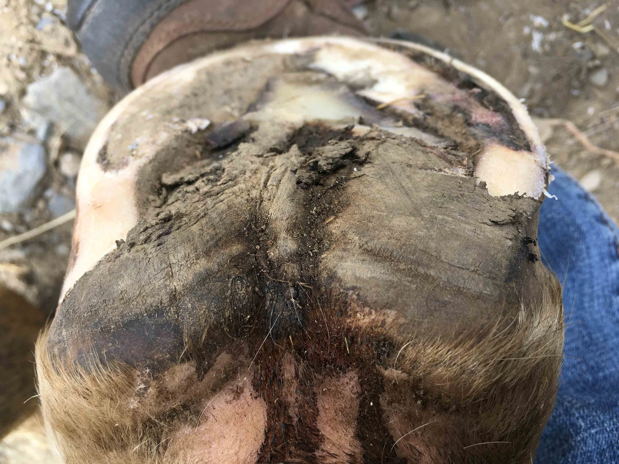 The soles of Mo's hooves were protected by a layer of hard horn. Months into the healing the hooves began to shed the protective layer.
