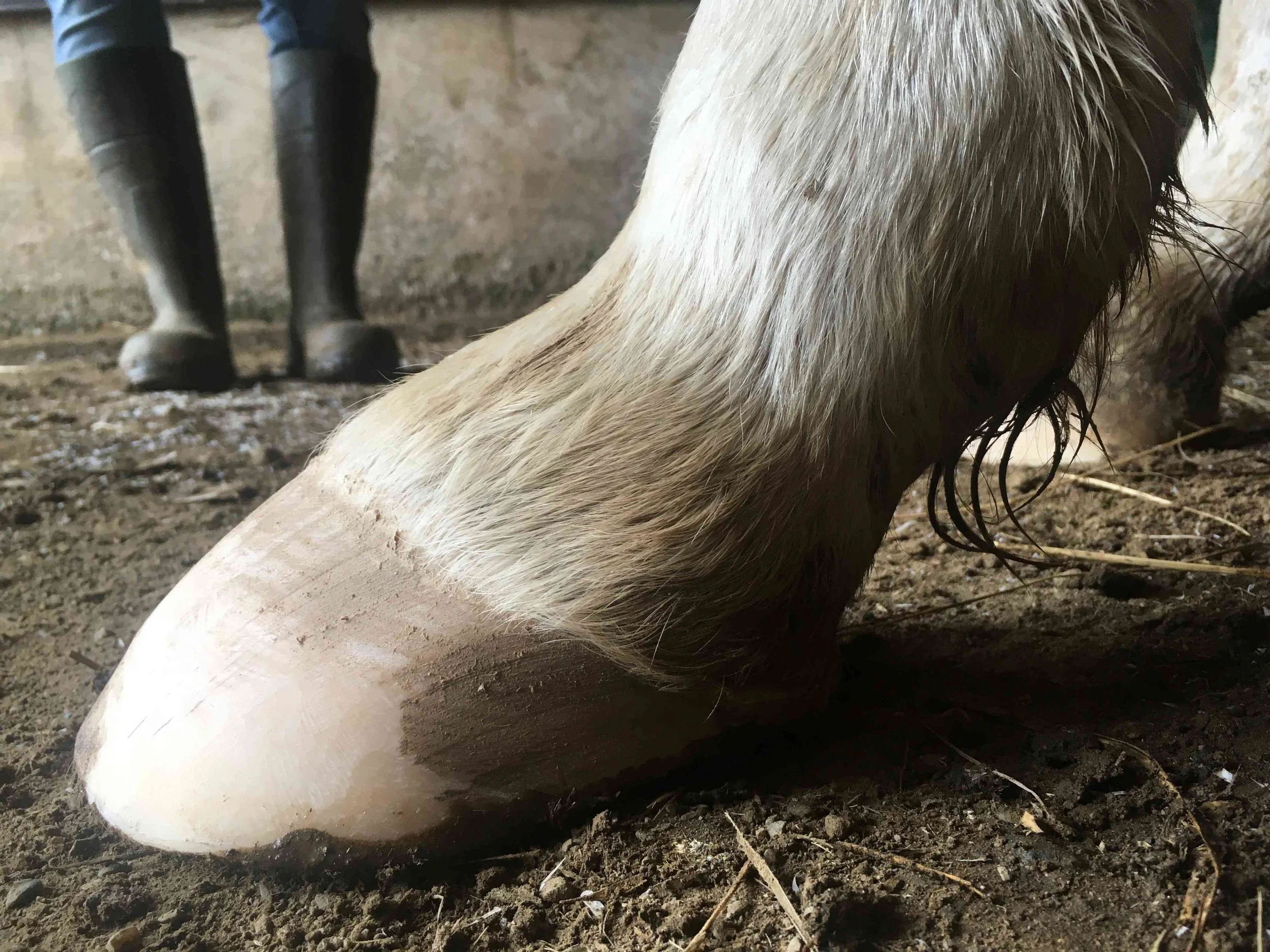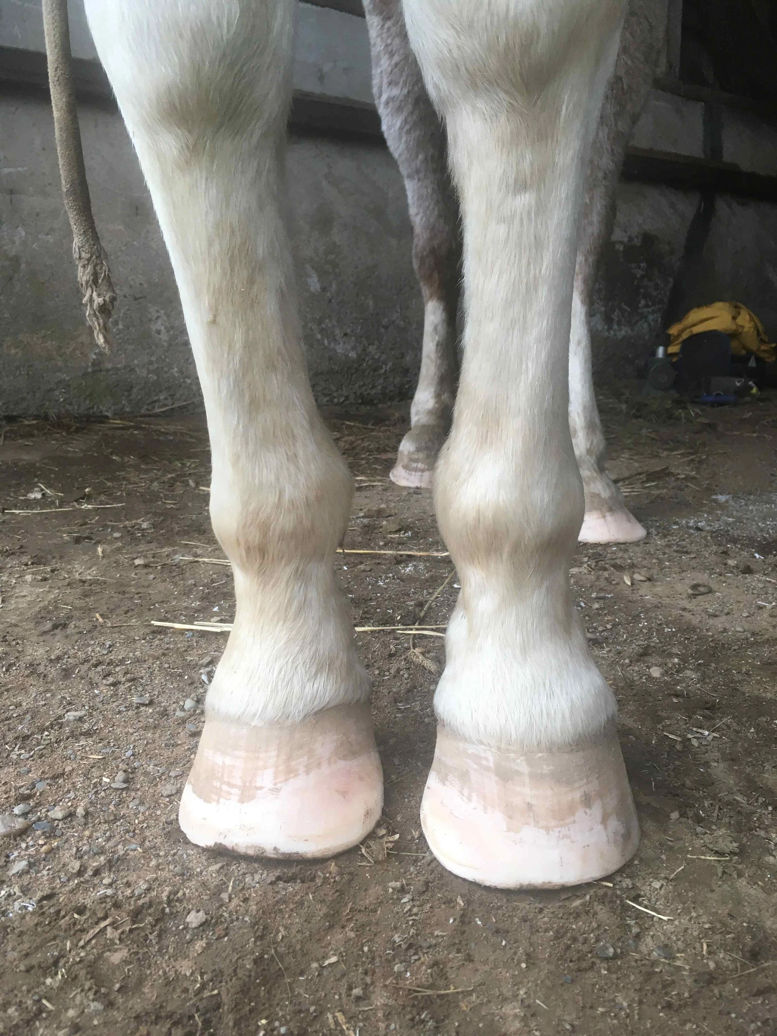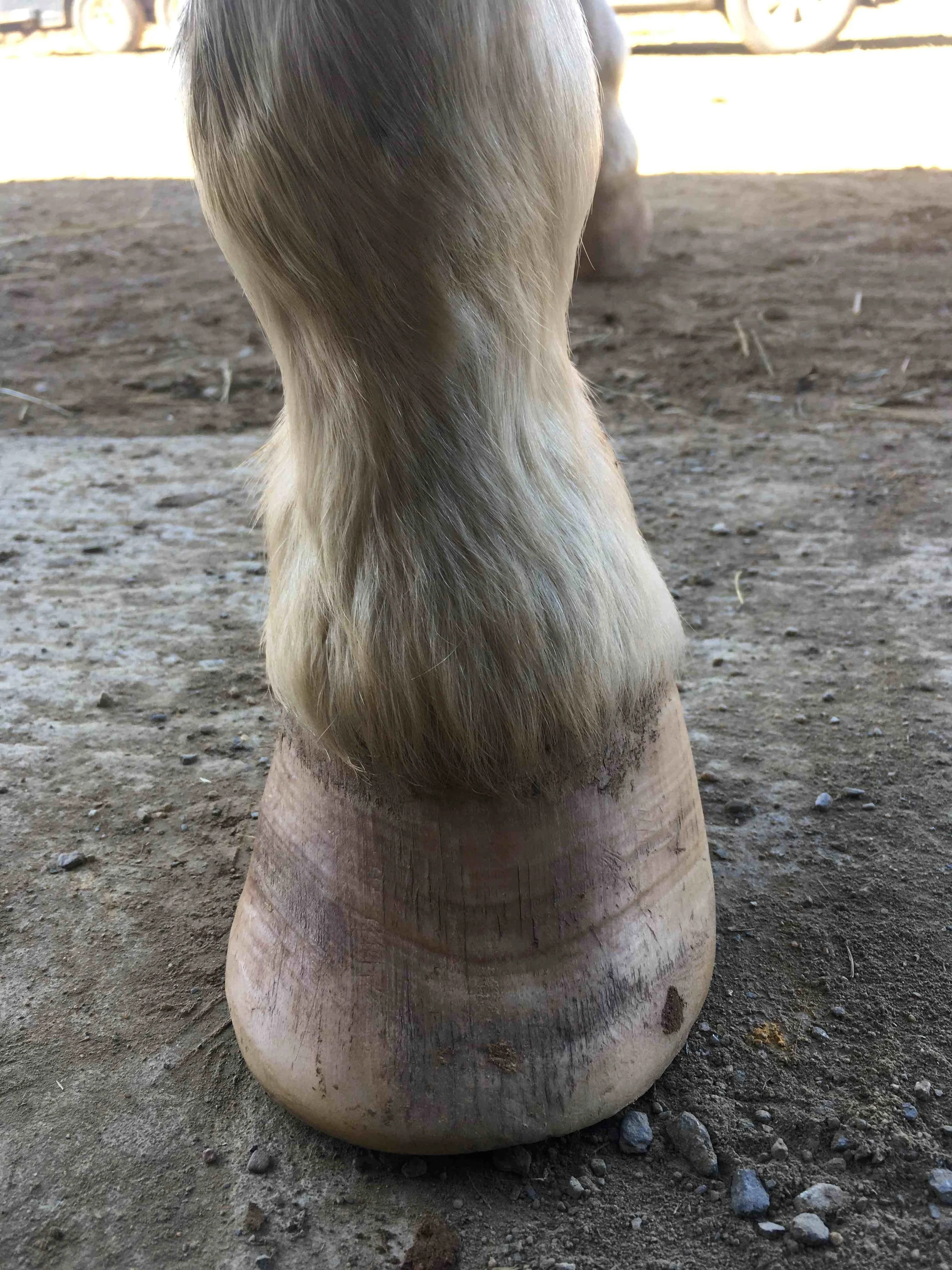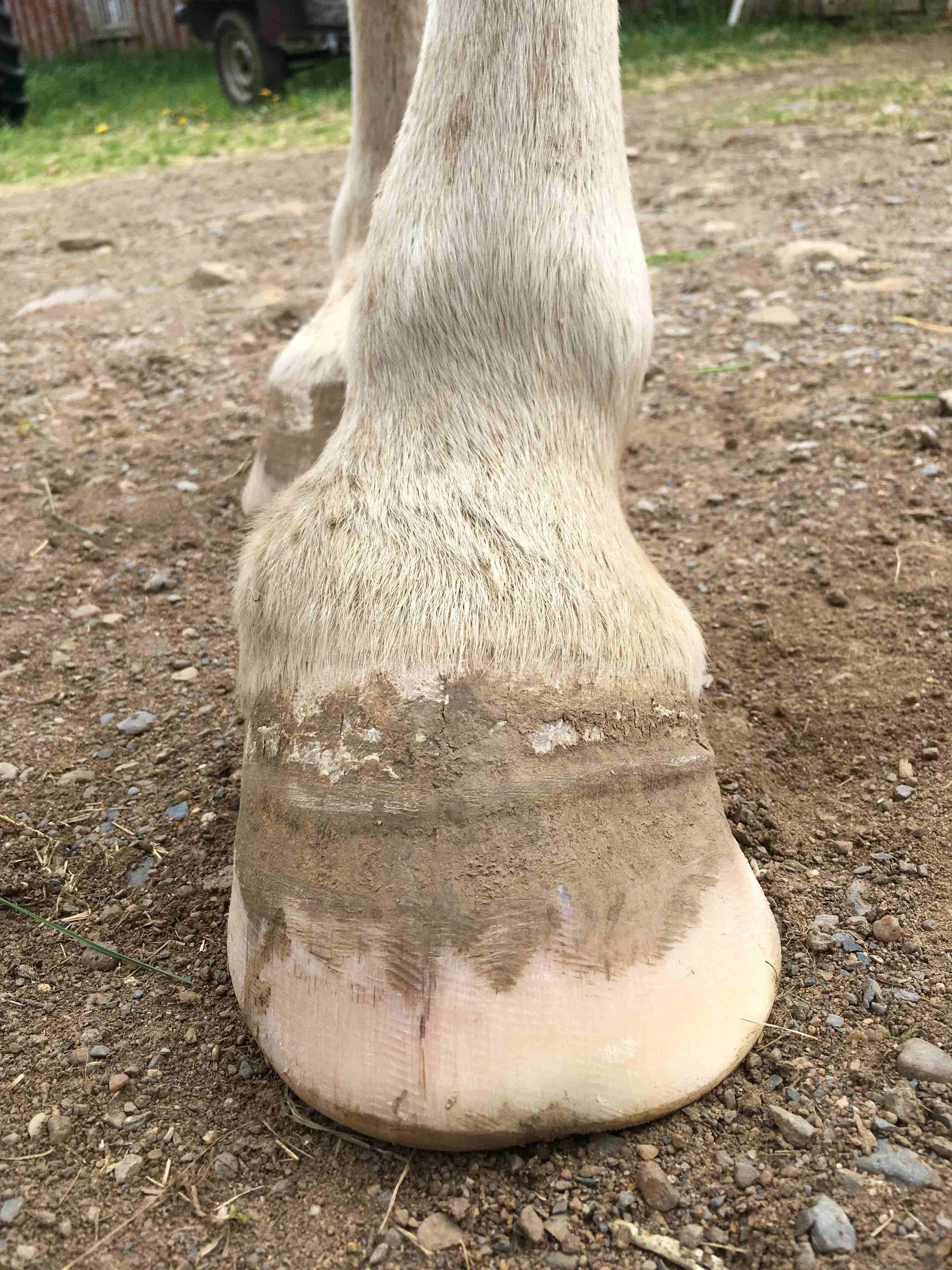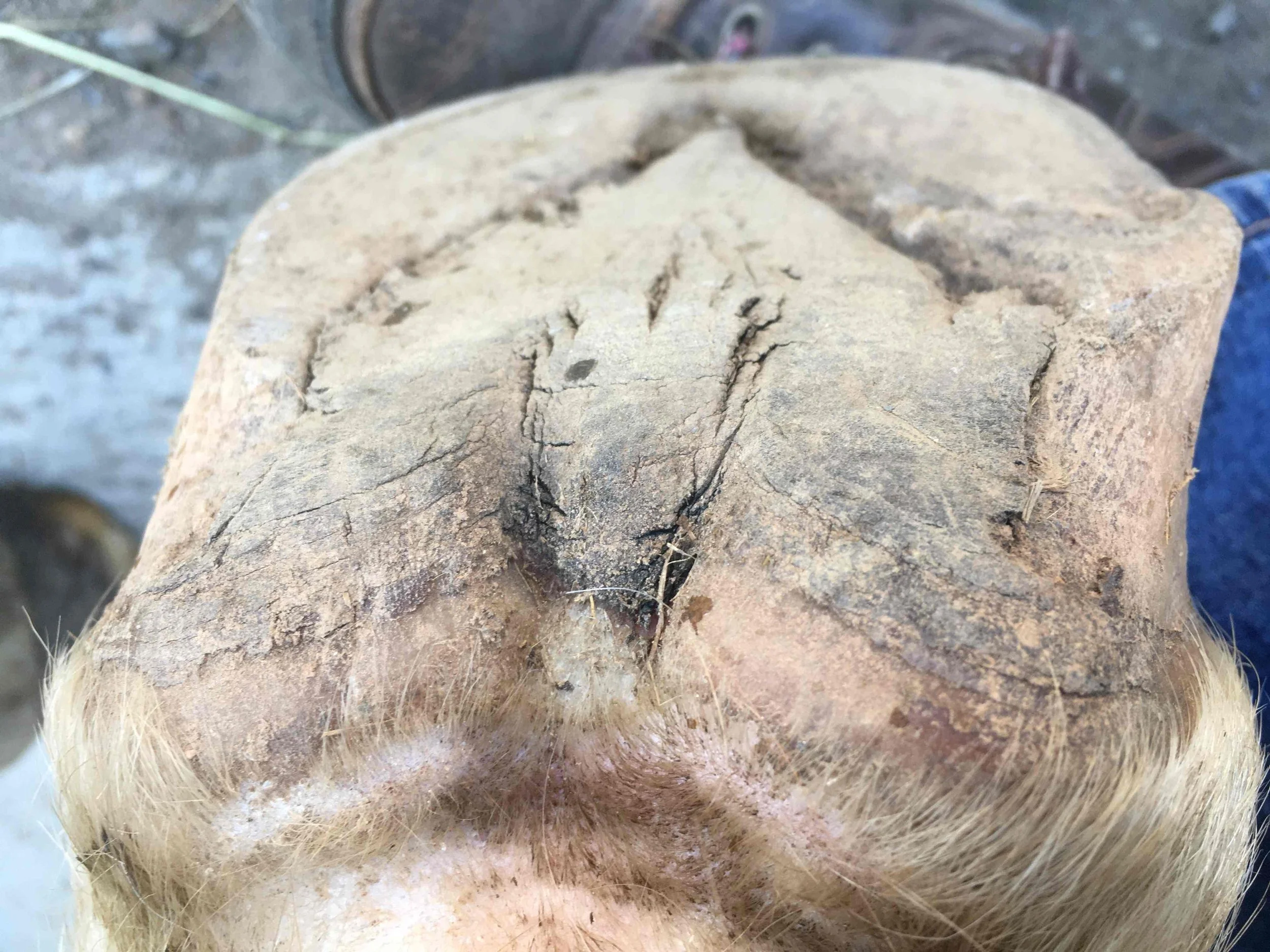 The soles of Mo's hooves were protected by a layer of hard horn. Months into the healing the hooves began to shed the protective layer.