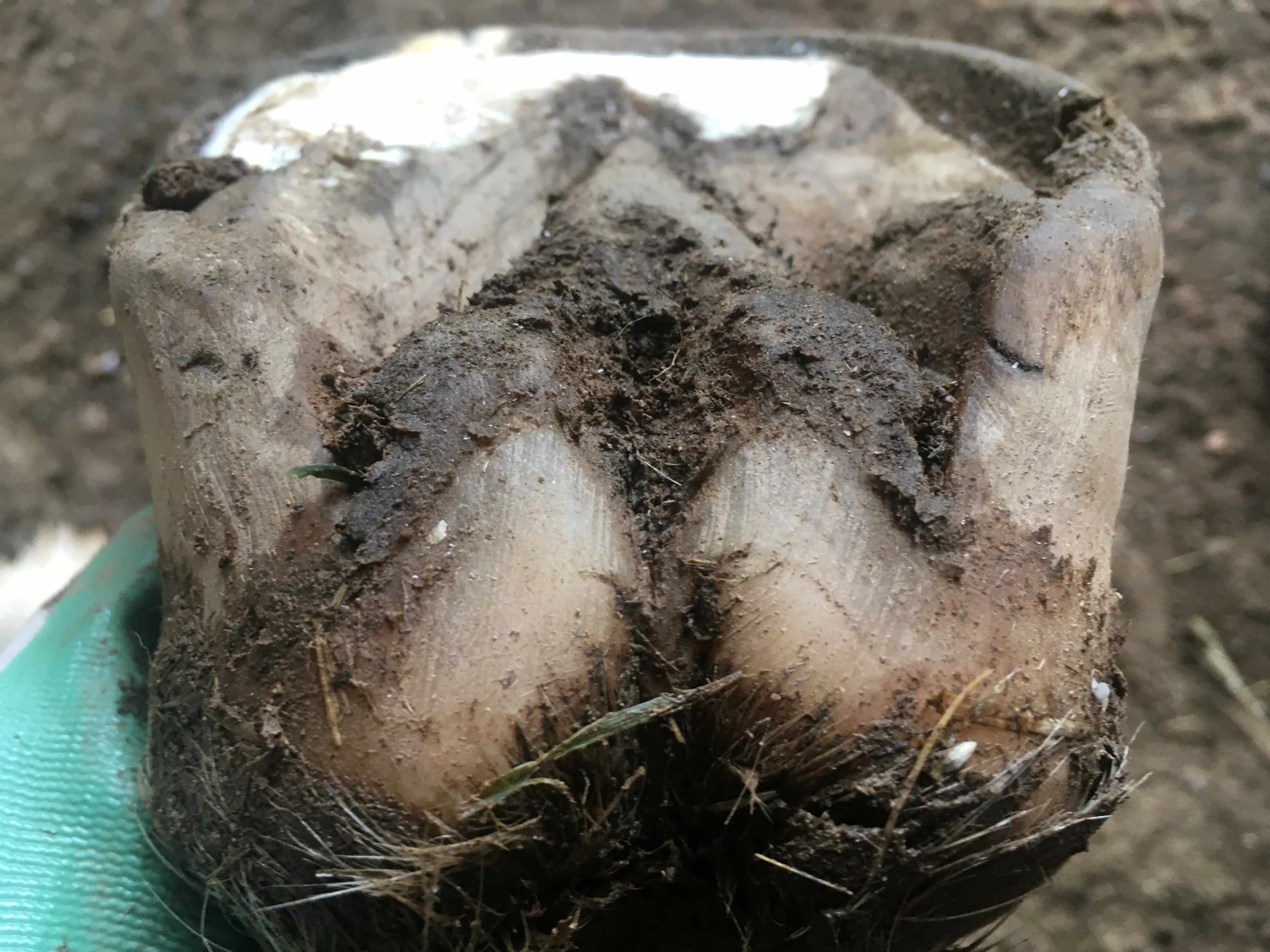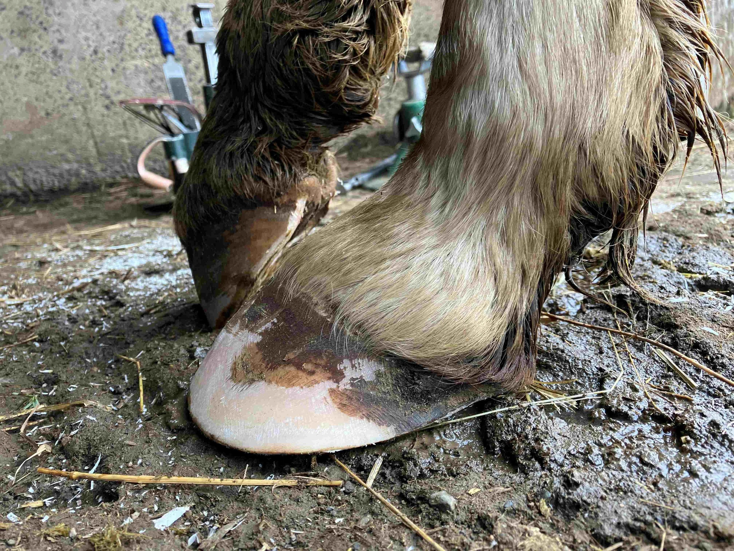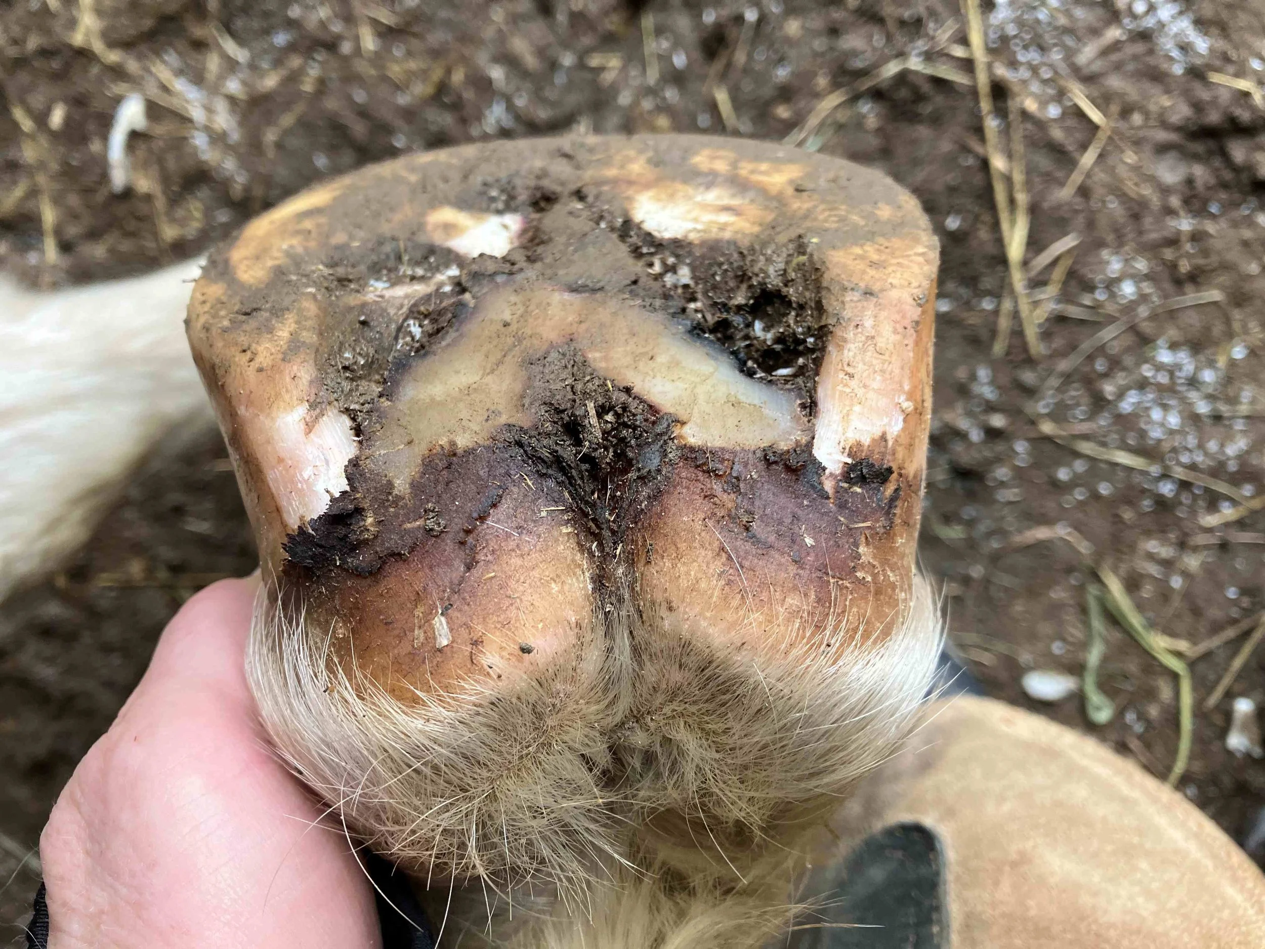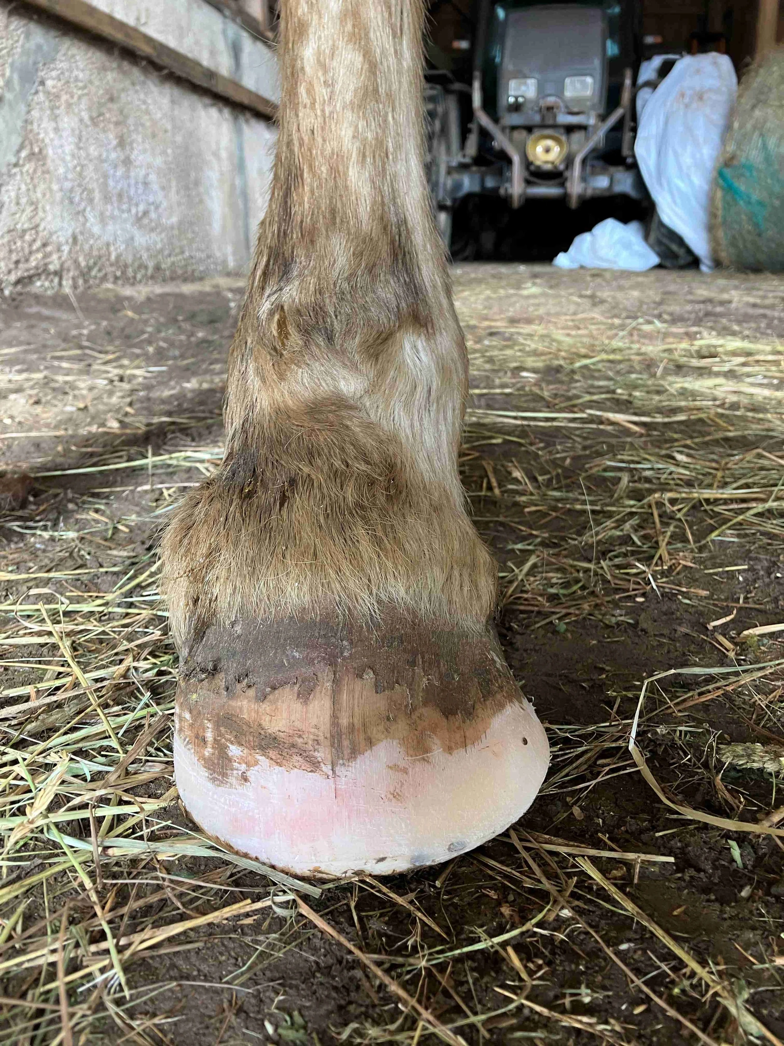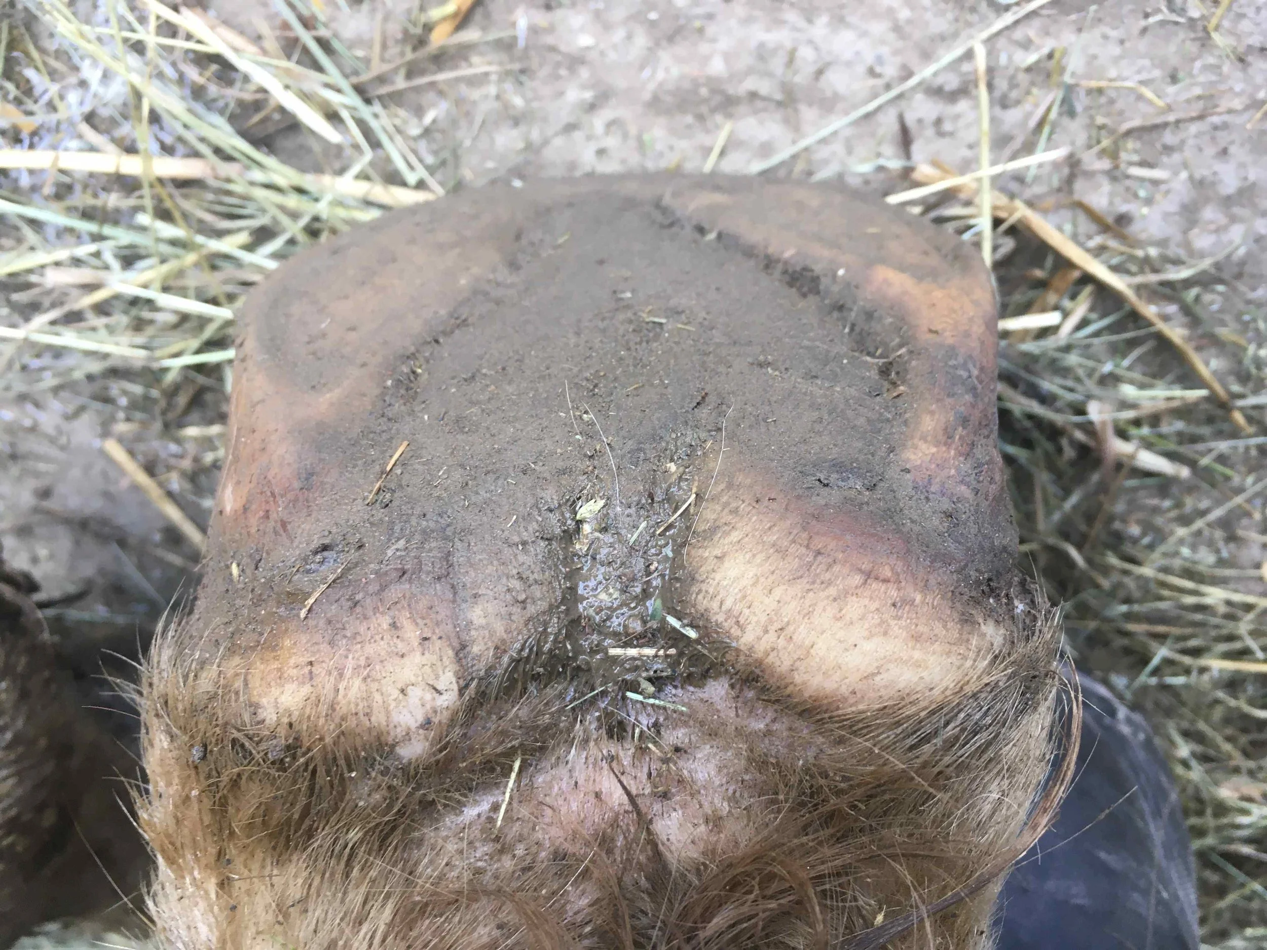 Left hind post-trim July 2021 — the sole is shedding — a big bruise on the lateral side is coming to the light