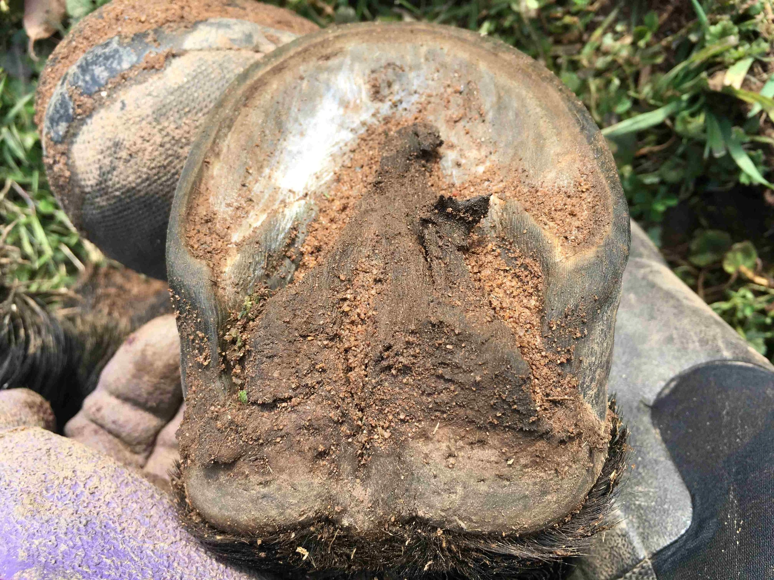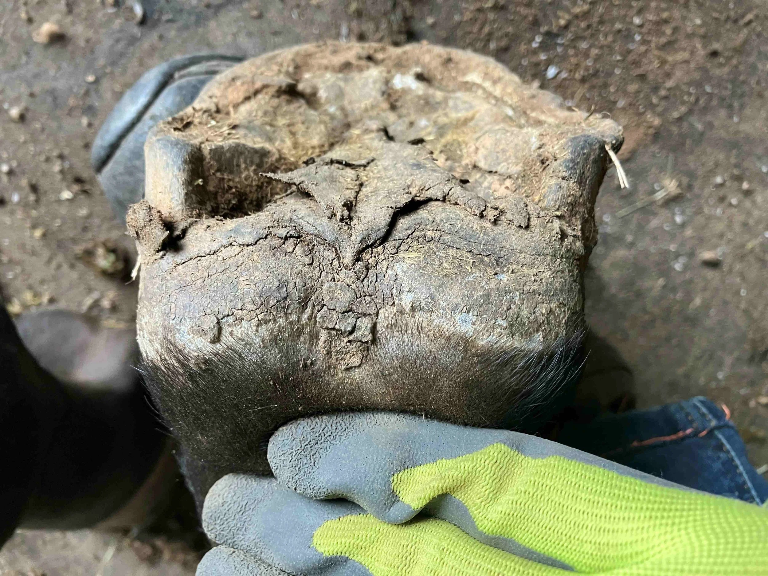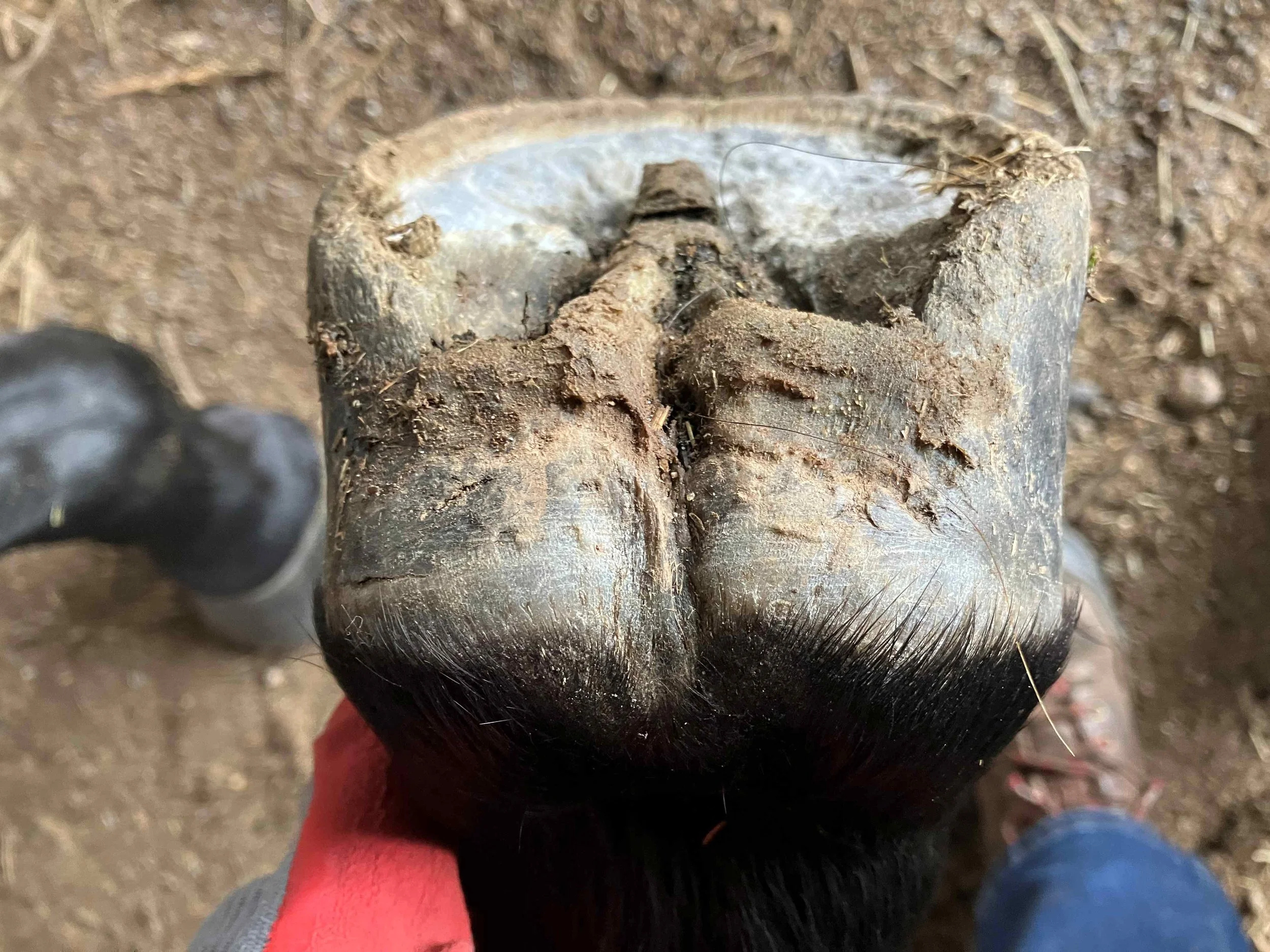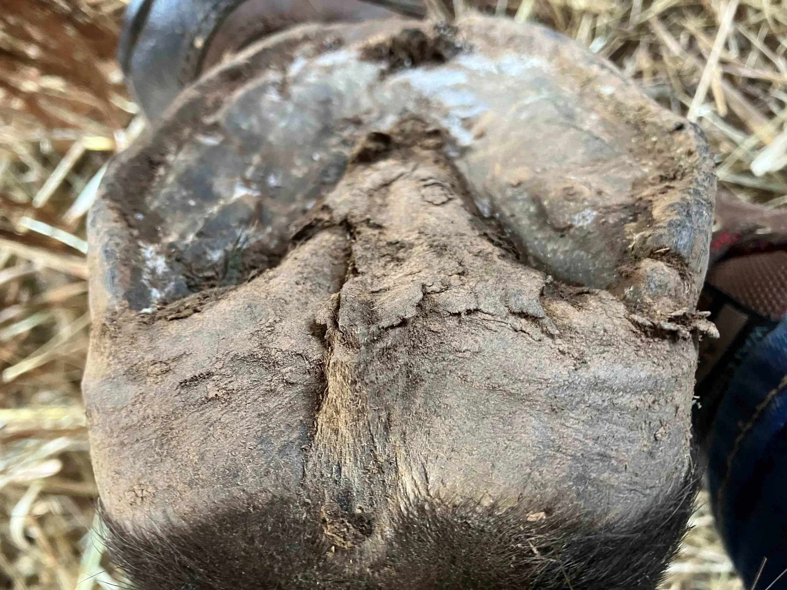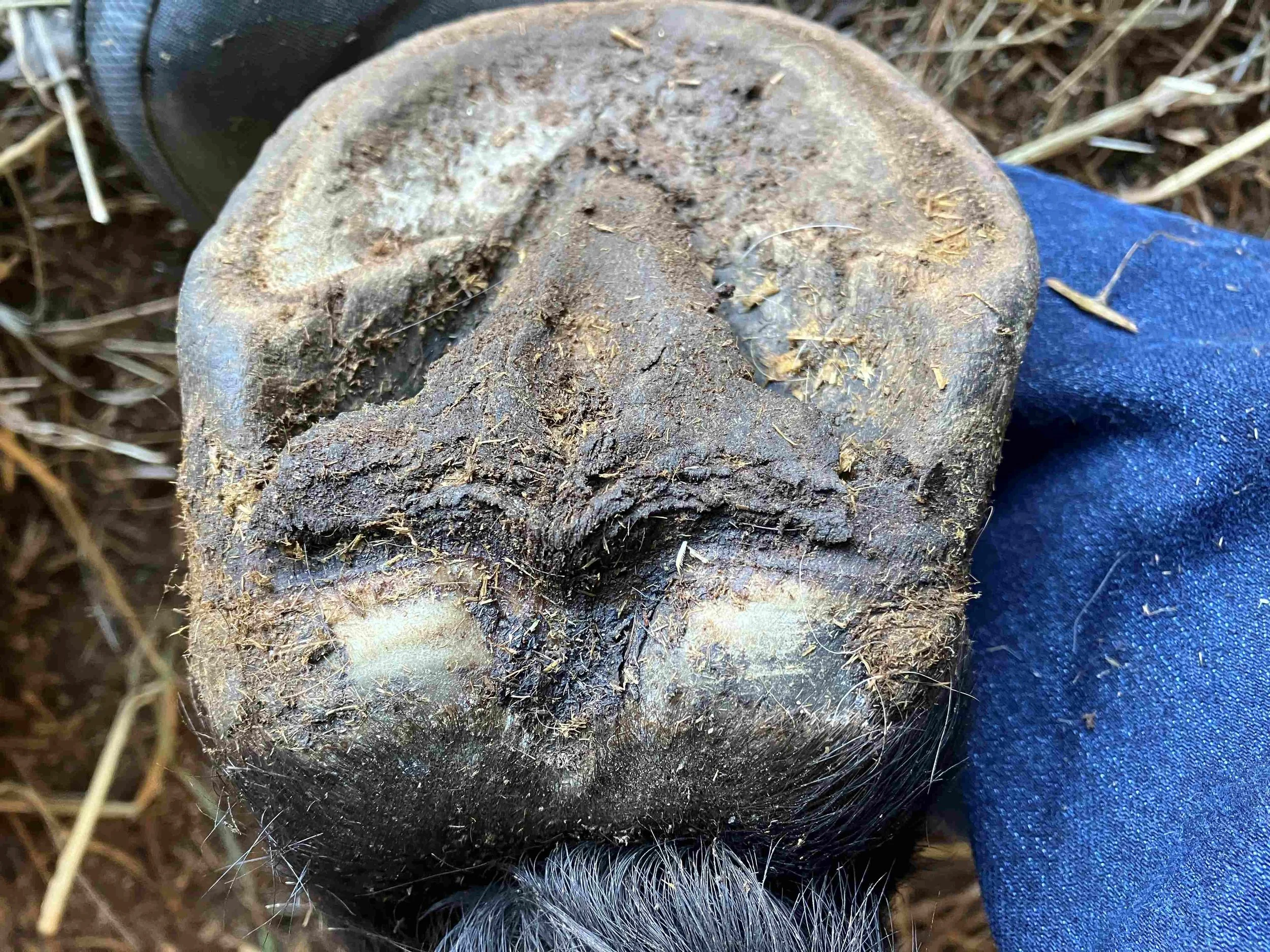 Left hind pre-trim of my first trim November 2021 — the heel/bar triangle on the medial side is interrupted, frog and bulbs are atrophied
