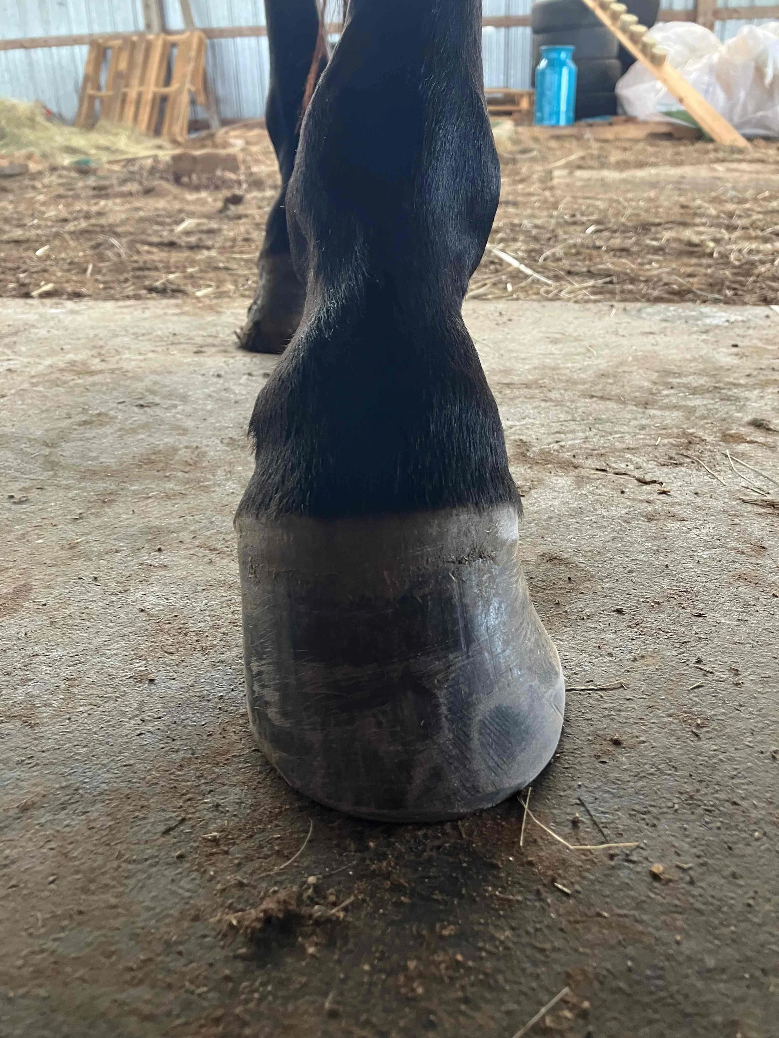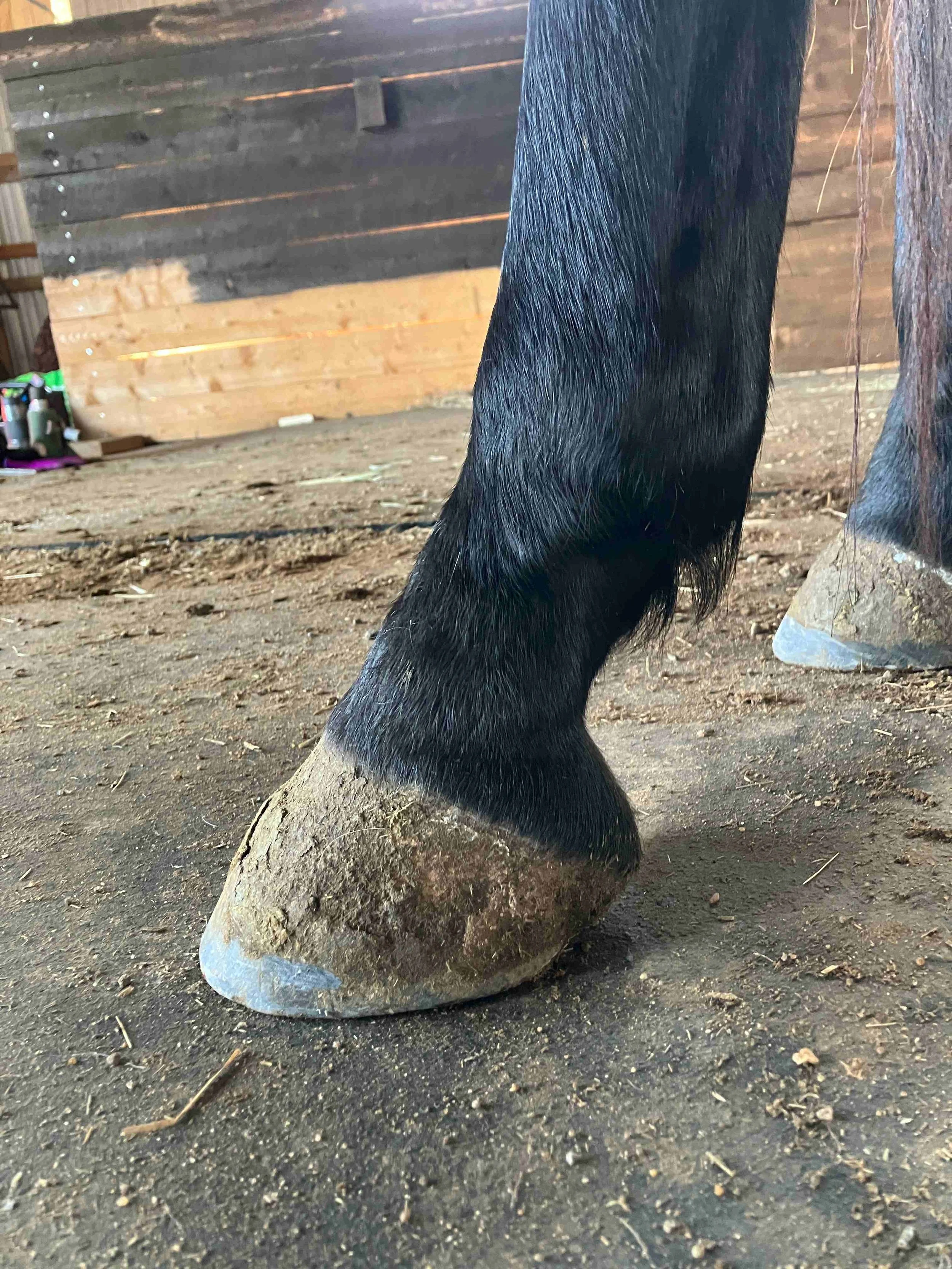 Left hind post-trim July 2024 — a divergent hoof is half way in increasing horn on the medial side (4th dimensional healing changes). This is placing the hoof more in line with the leg and showing how much off the previous hoof actually was. (Note: the hoof is NOT flaring out. The new hoof is growing inside the old. The new hoof does not take the old location with it. With the next trims I can safely remove the excess horn on the lateral side.