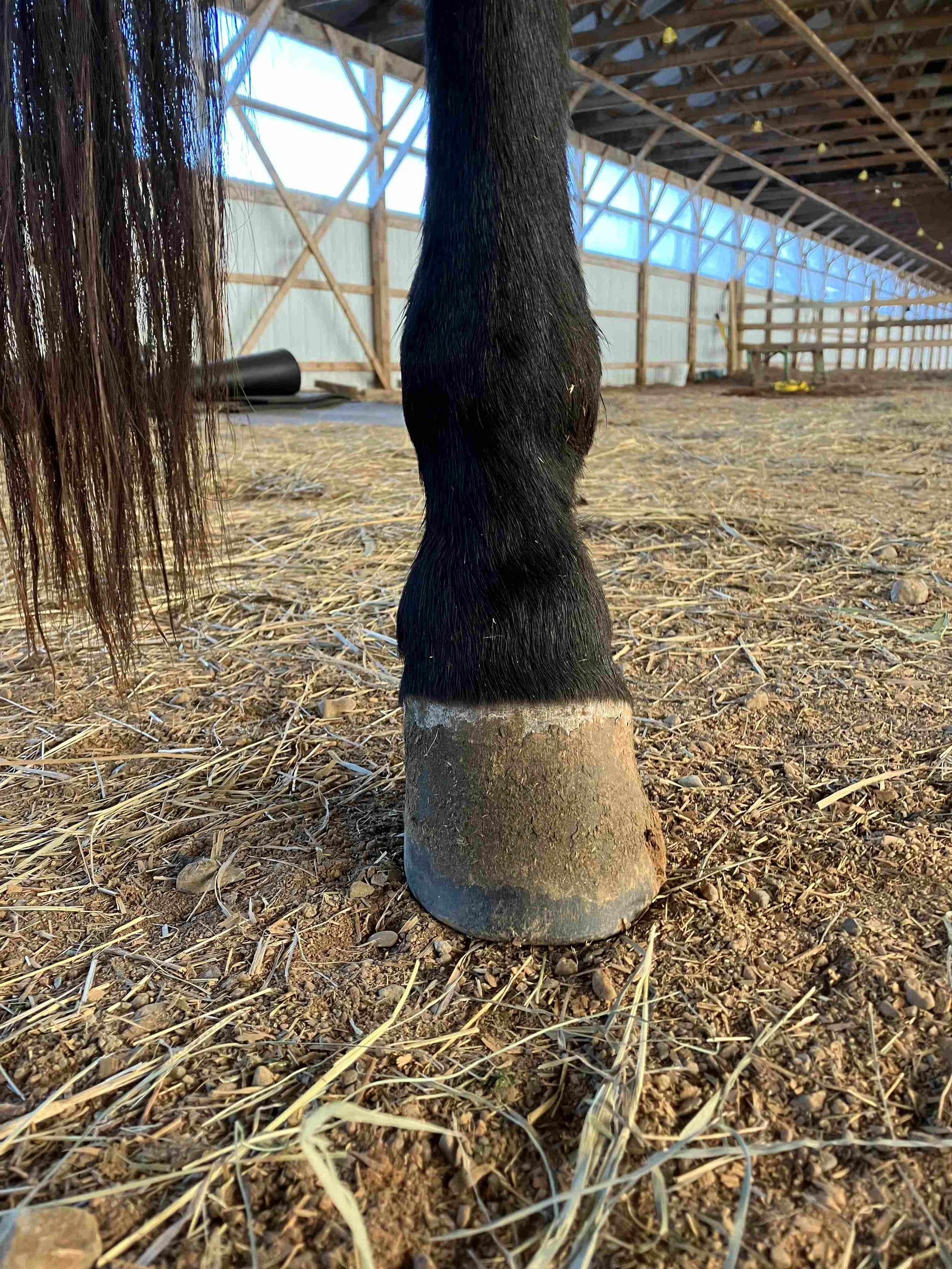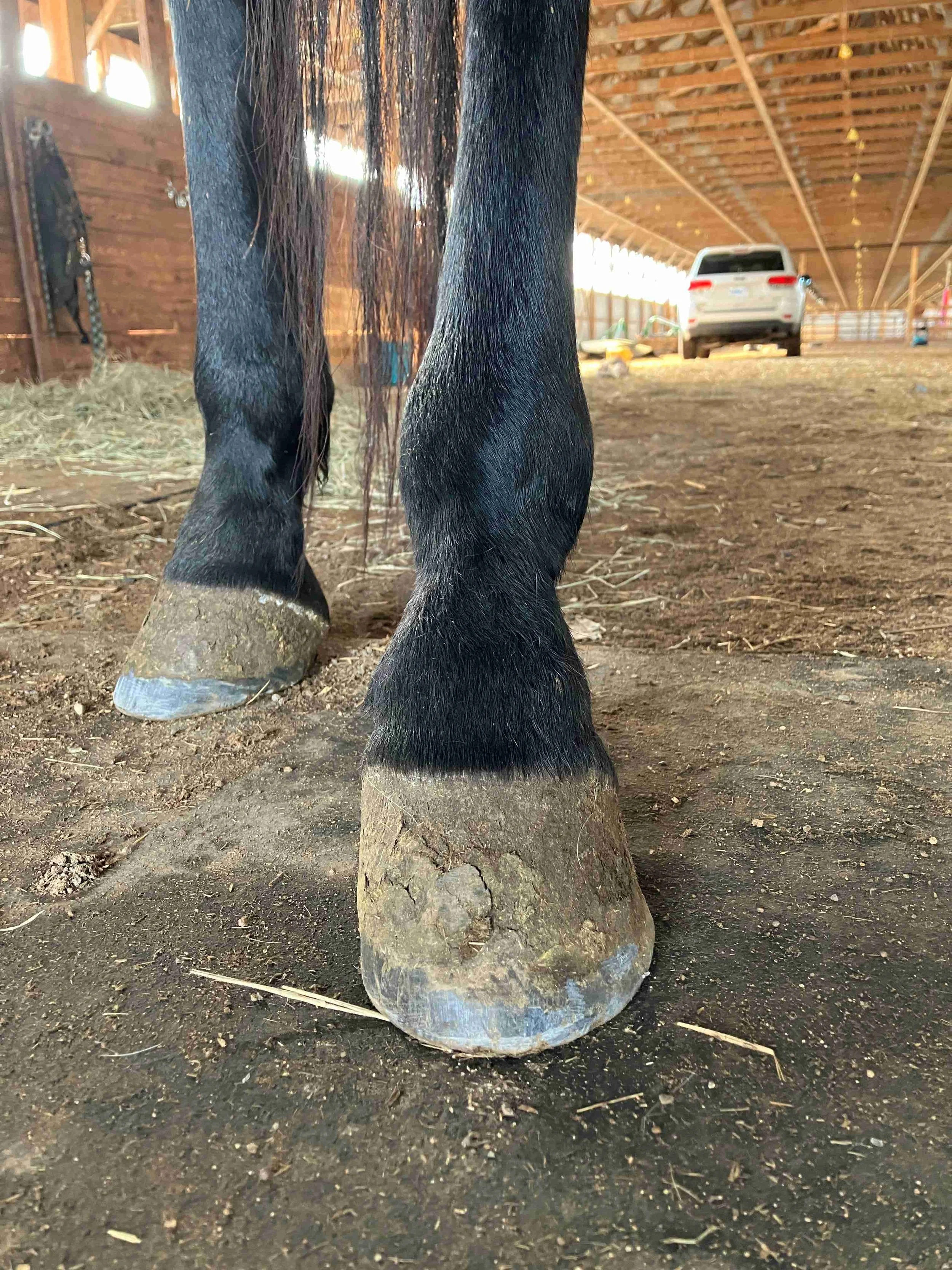Left hind pre-trim February 2023 — I allowed the previously snubbed toe to grow back; the hoof looked like a pop can