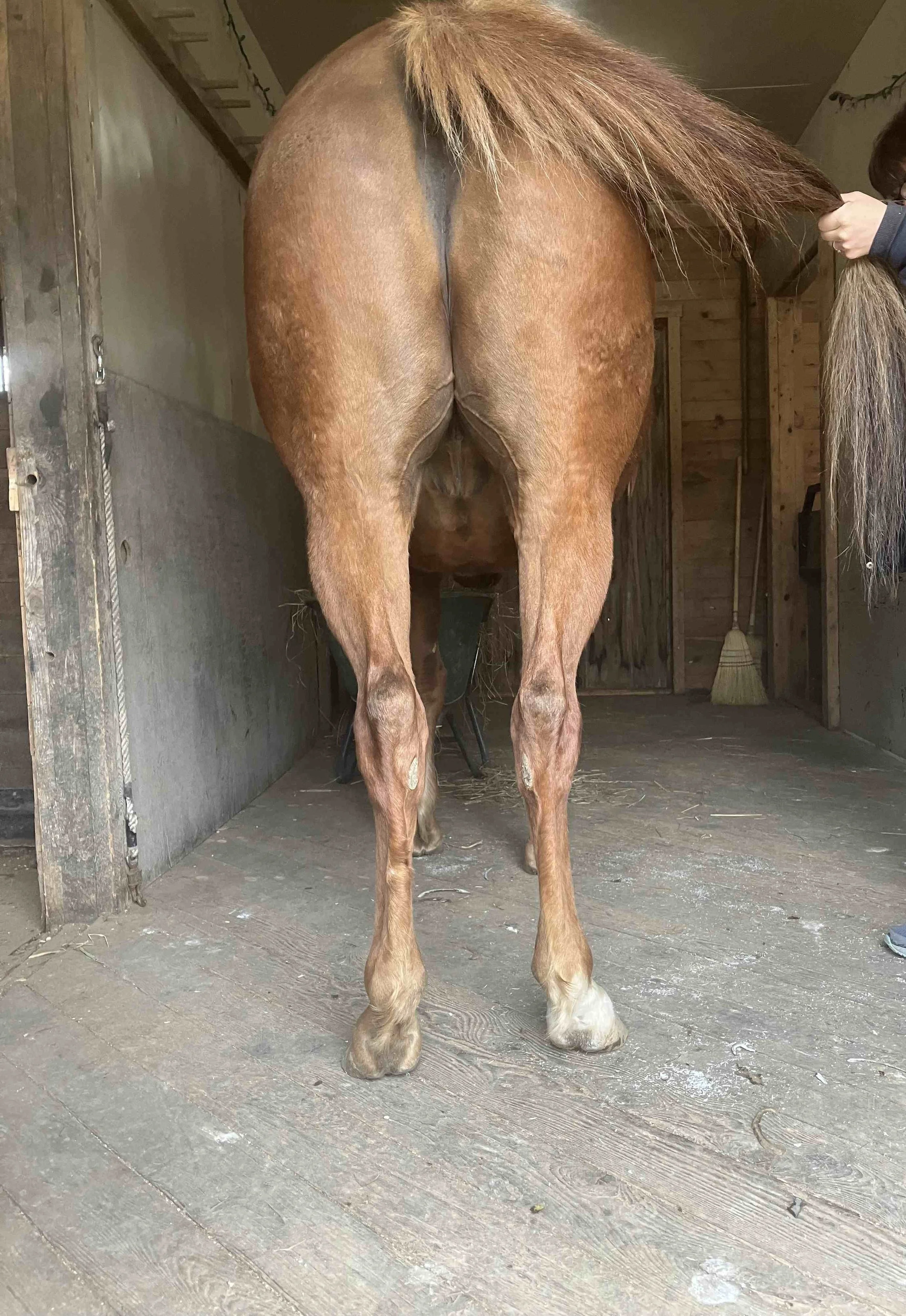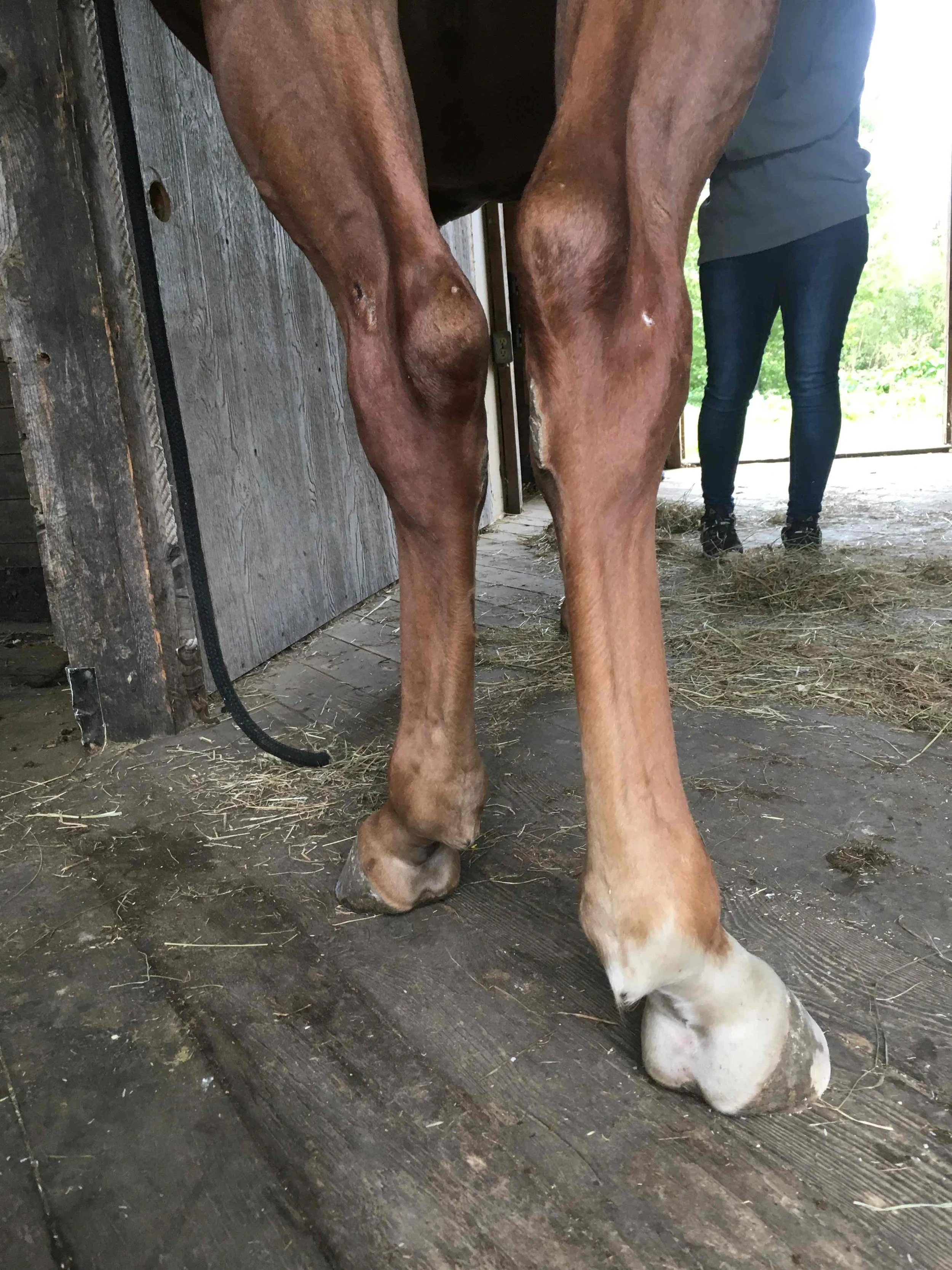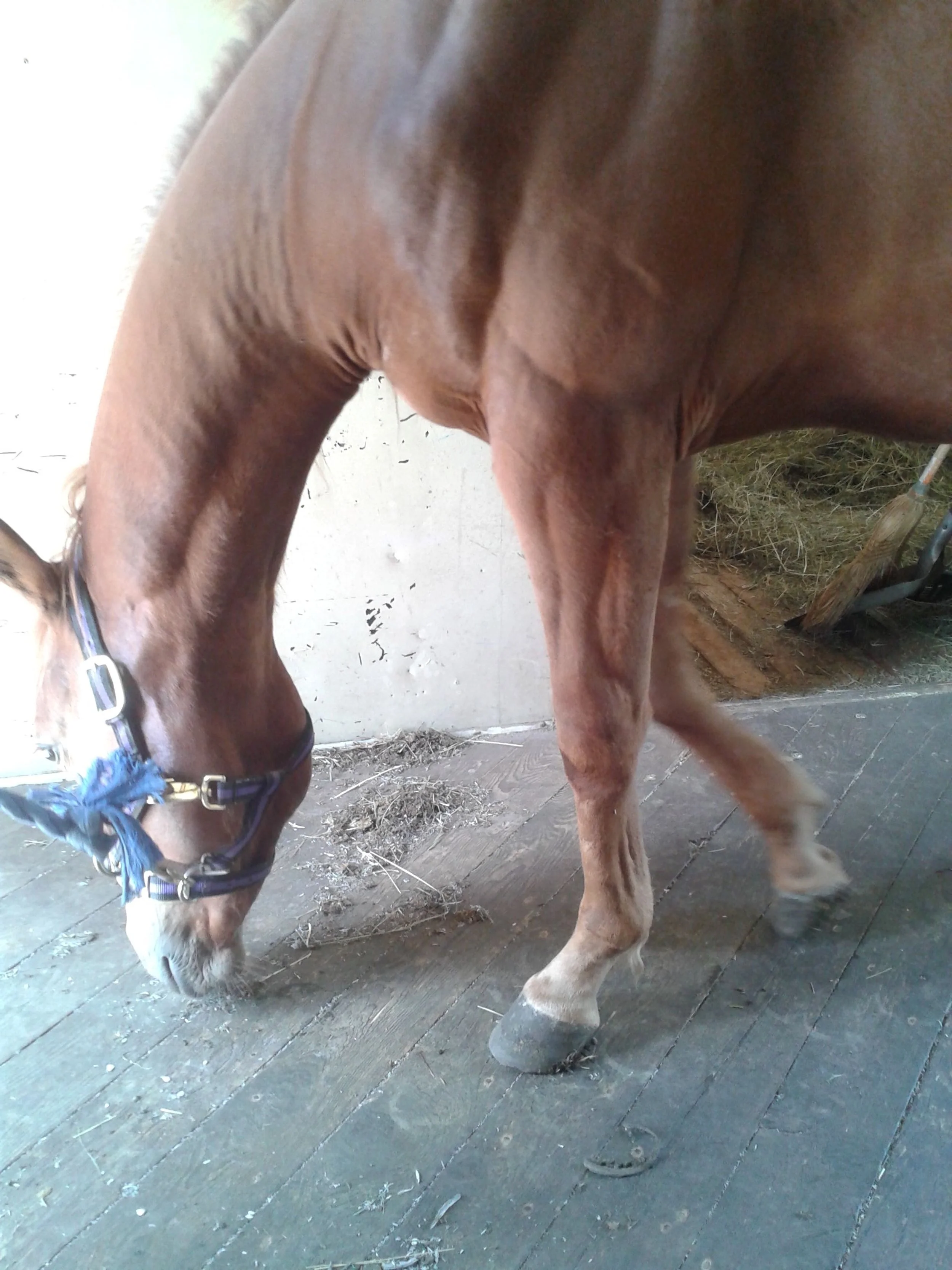 This Quarter Horse gelding presents an example how a body can compensate into all kinds of directions when the unfinished newborn foal hooves did not have a chance to wear down and finalize outside of the mother's womb after birth.