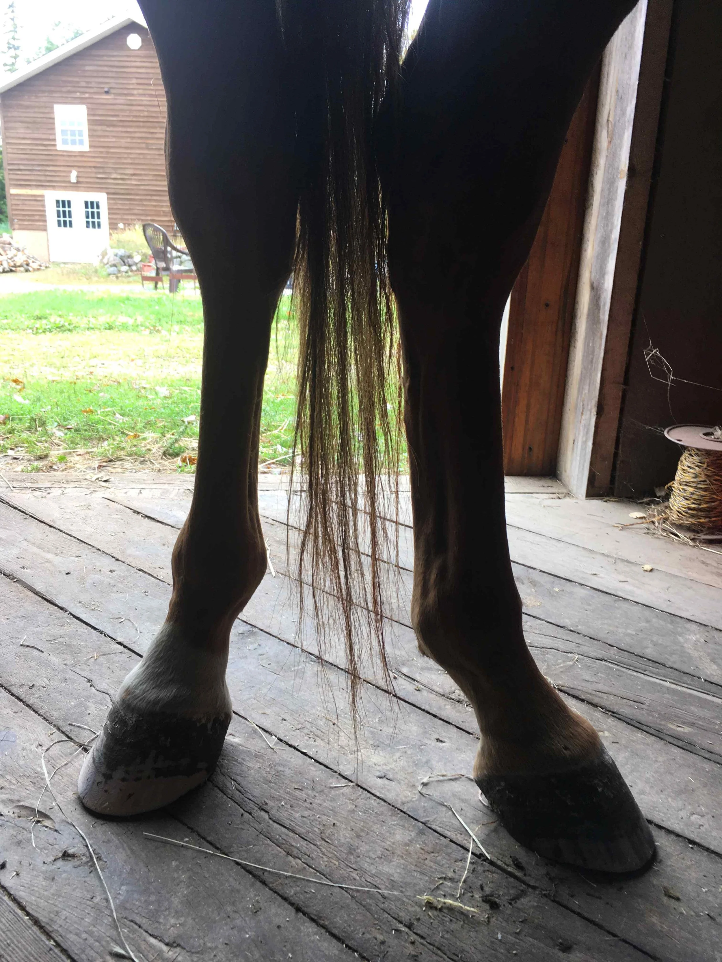 Despite his healing journey, the gelding is ridden and makes his owner very happy. The healing journey was to: heal the back of his hooves; finalize the variant capsule angle-of-growth; watch the natural arch develop; experience the release of ossification from the hocks through abscesses; establishing the hooves under the bone column of the legs; release muscle tension…. All this with love, patience and time as well as one divergent hoof after the other until we have arrived at fairly natural. The gelding lives in a natural paddock with 24/7 freedom, access to unlimited good quality hay, no access to green grass pasture. Besides my trim (mimicking natural wear patterns) and leg stretches every six weeks there was no further interference.