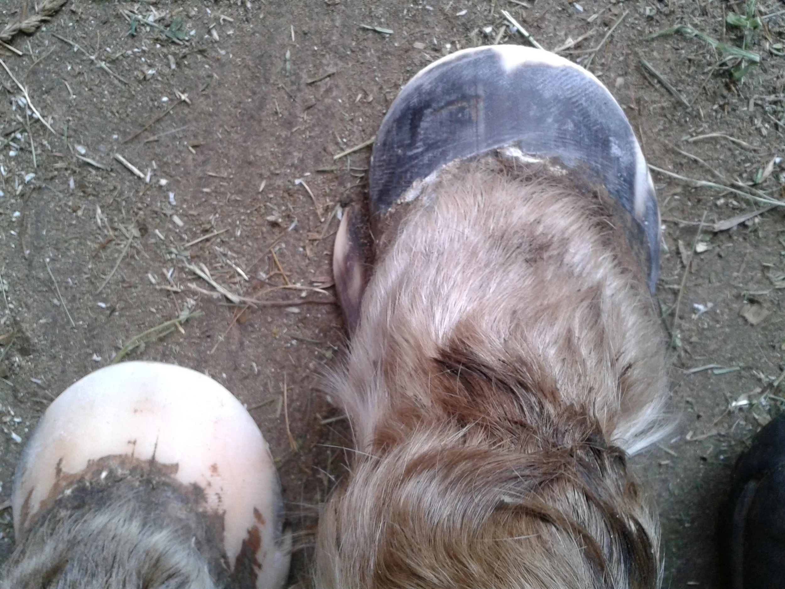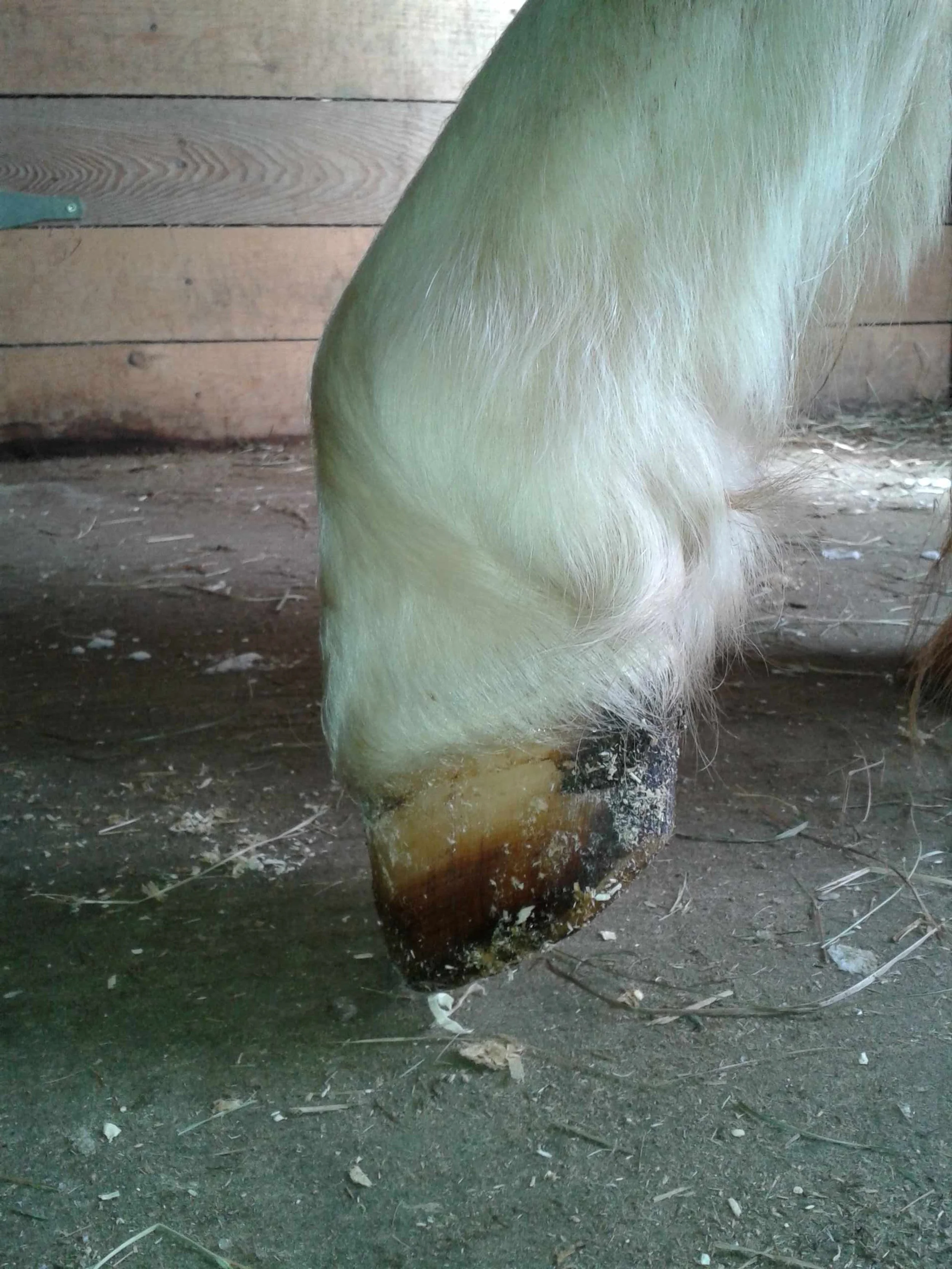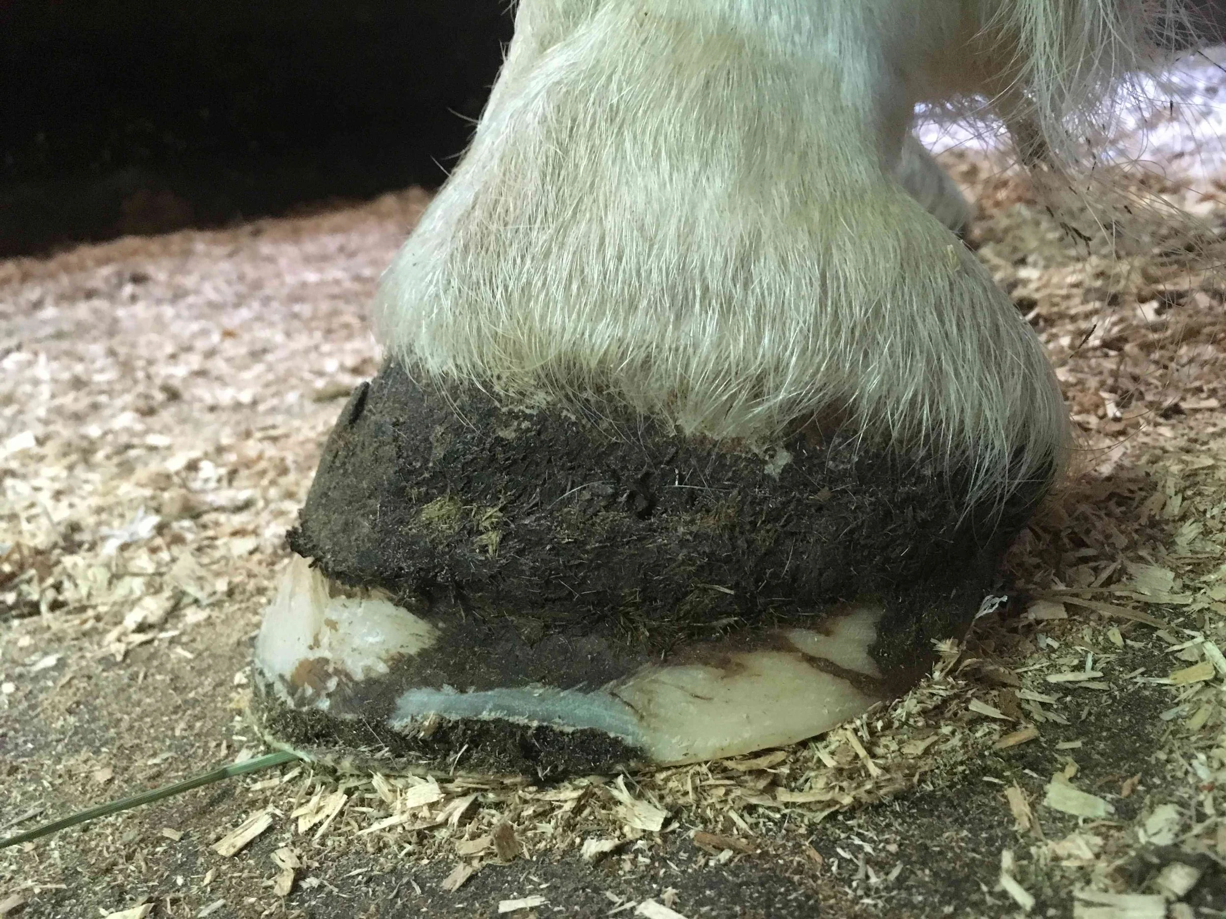View of the front hooves from above December 2017: the right front hoof was severely bruised and blue in color, more white was coming in as the hoof healed.