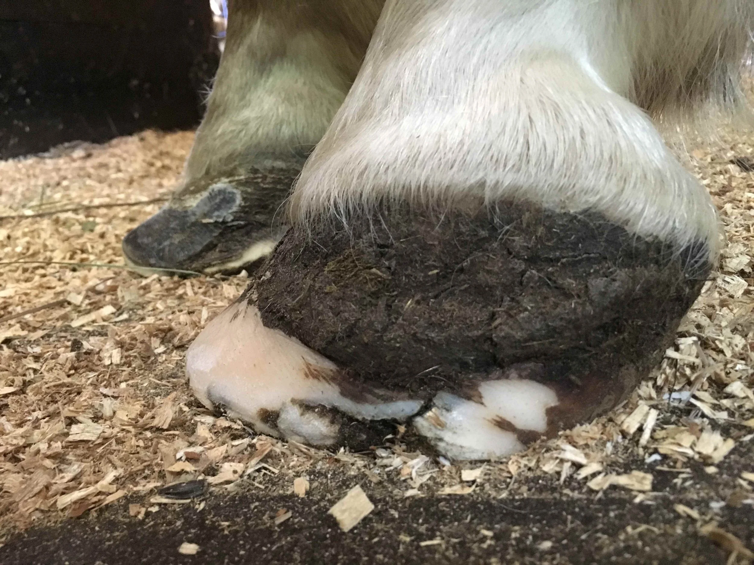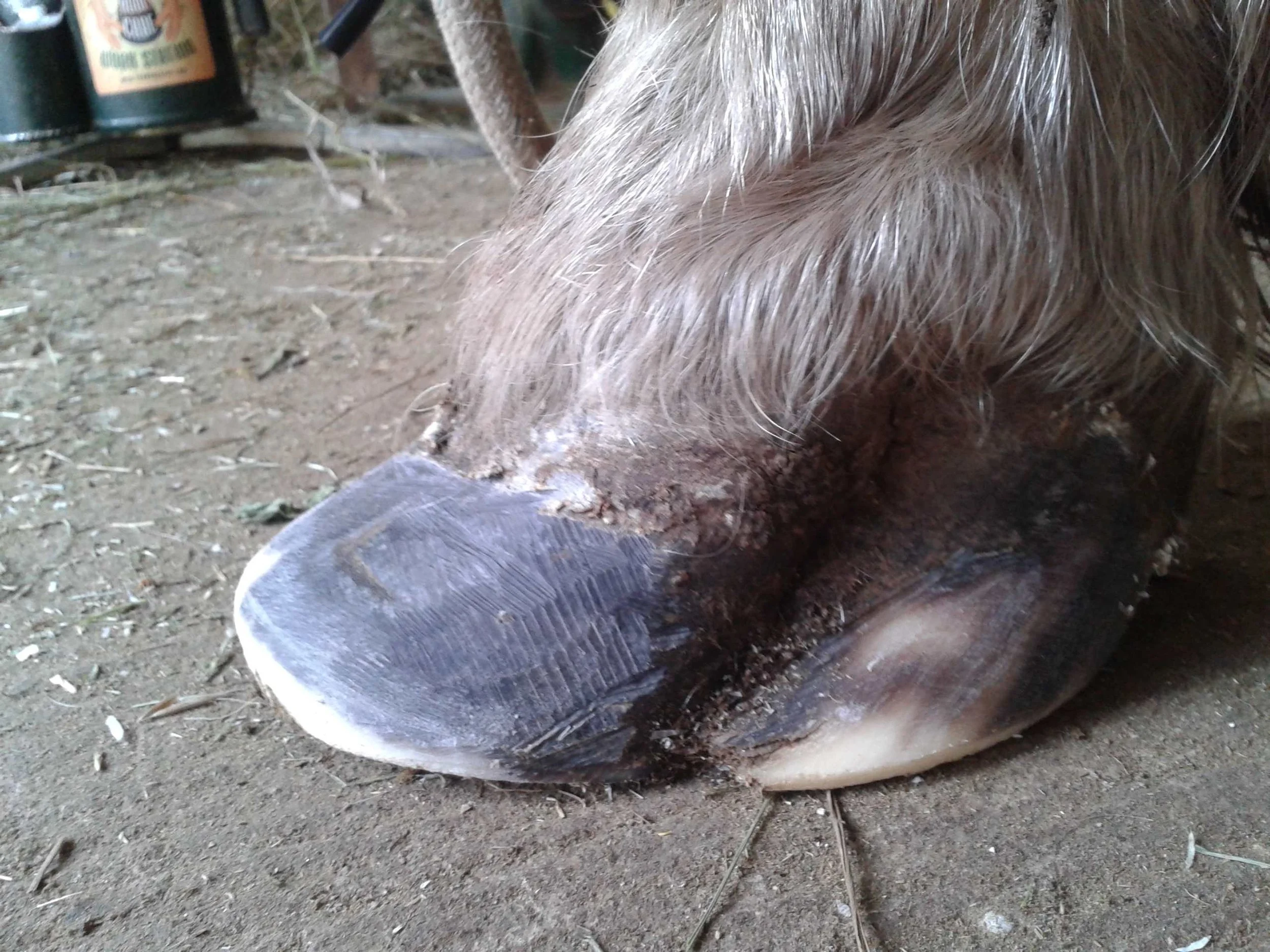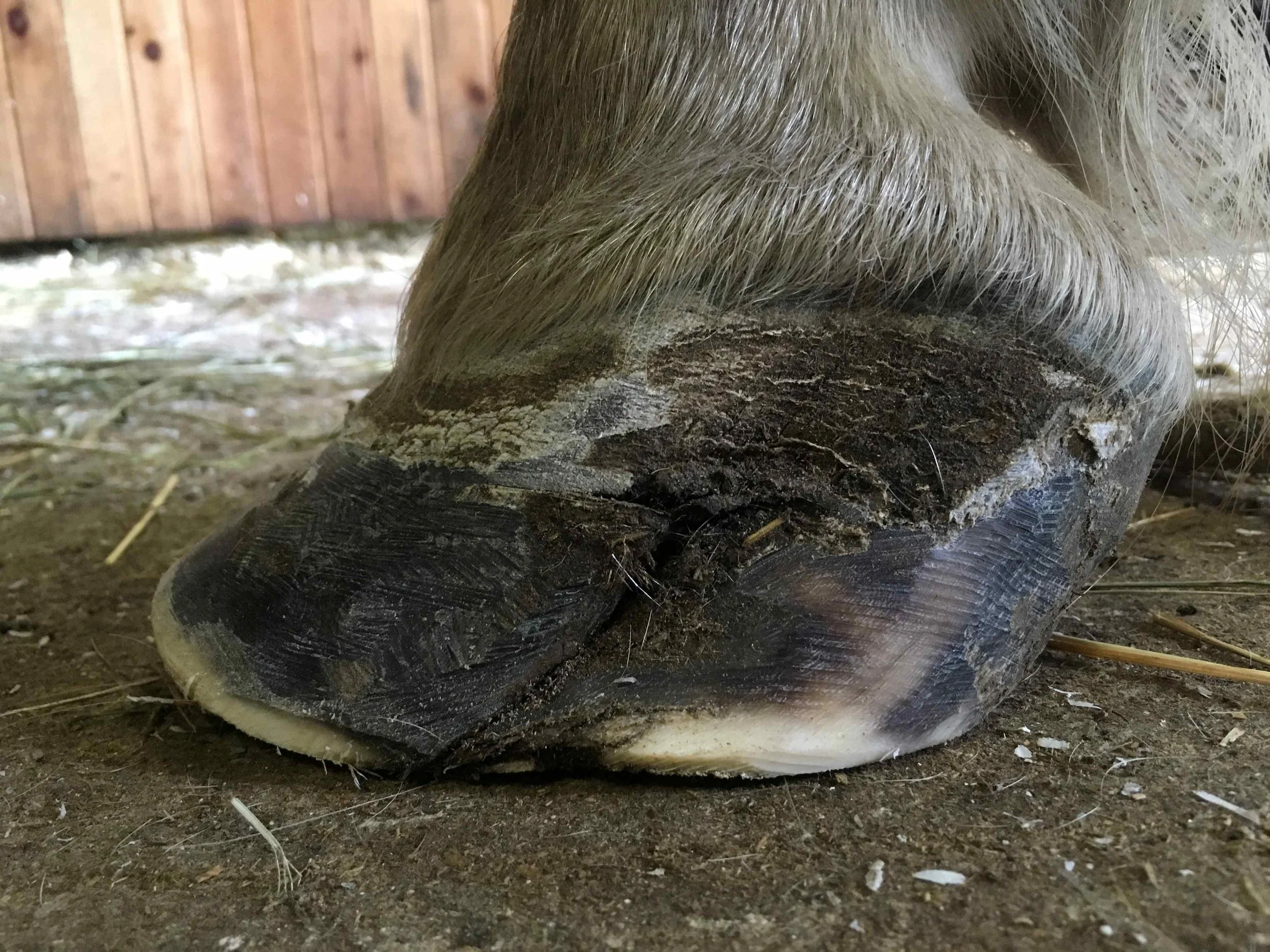 View of the front hooves from above December 2017: the right front hoof was severely bruised and blue in color, more white was coming in as the hoof healed.