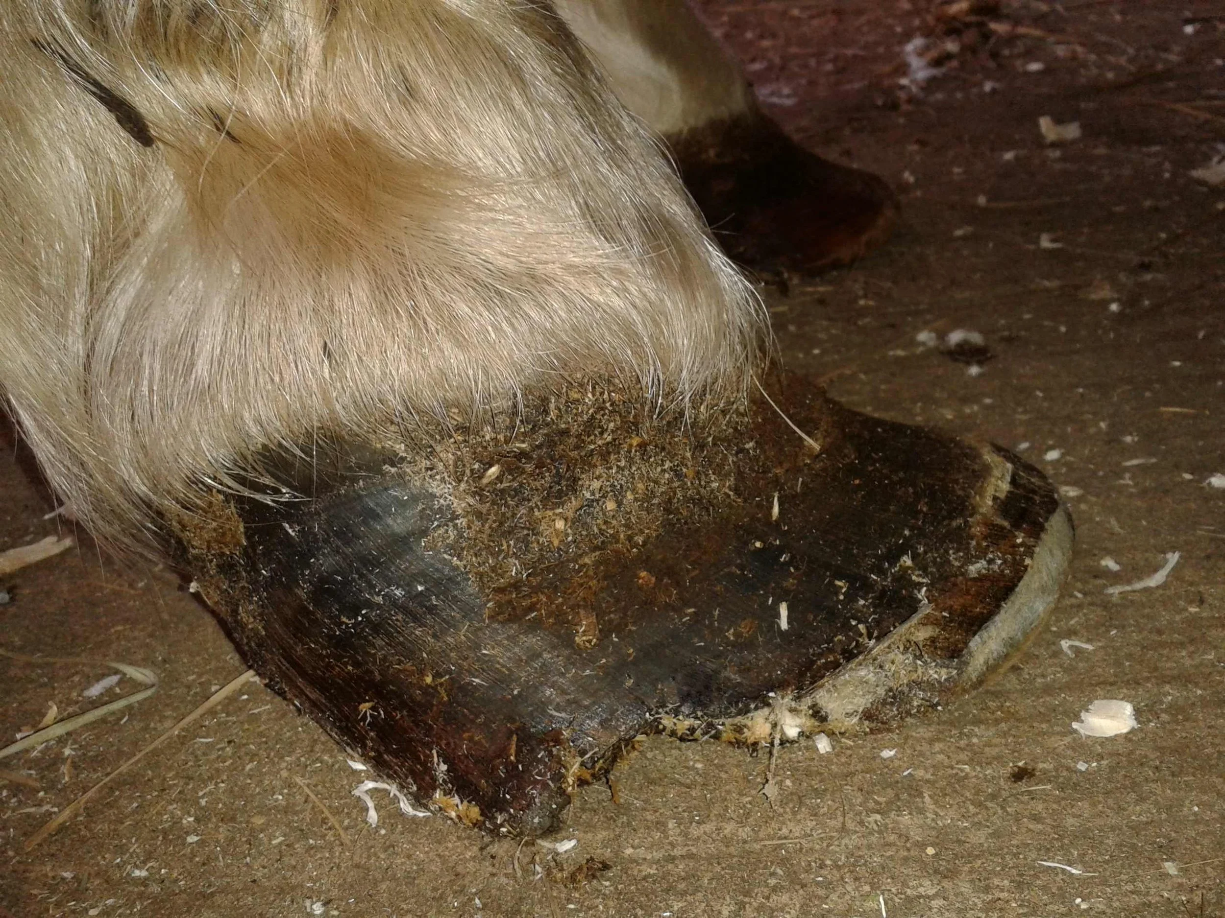 It was extremely painful for the gelding to put weight on the back of his hind feet due to the unfinished back of the hooves and the ingrown tips of the false heels. He bull-nosed and injured to the toe wall due to the undeveloped back of the foot. There was a lot of bruising in the back and he avoided to put weight on the back of the hinds. He held himself with muscle effort and could hardly pick up his hinds due to long-term muscle tension.