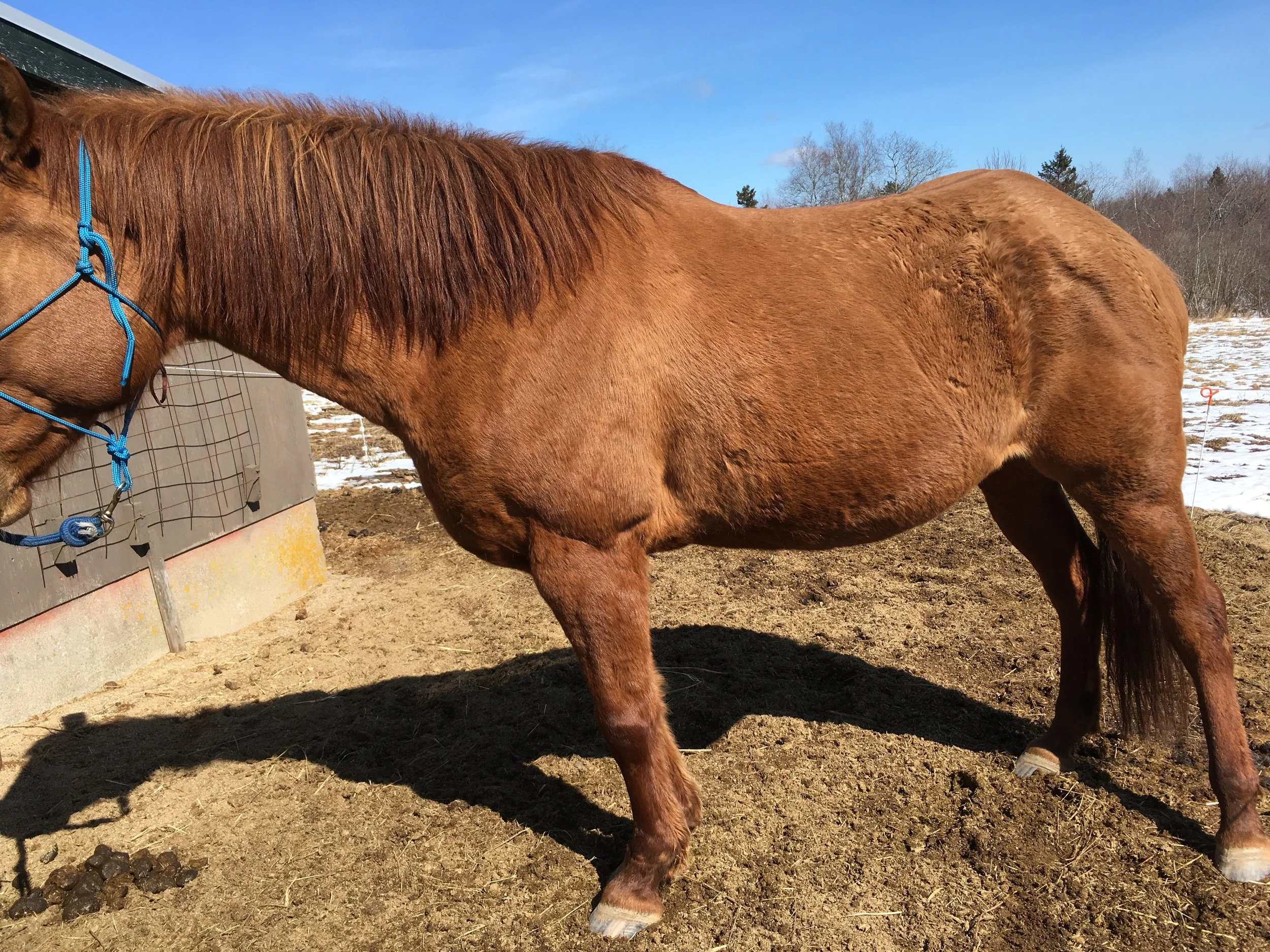 Dee camped out of her body line with the hinds, placing her weight on the toes in the hinds as well. Her hind fetlock joints were weak. Dee had extreme muscle tension throughout her body from head to tail bone. The muscle tension even affected her tail hair. At the nine-month-mark into the healing all tail hair past the end of the tail bone broke off. Then the tail hair started to grow a new with "happier" hair.