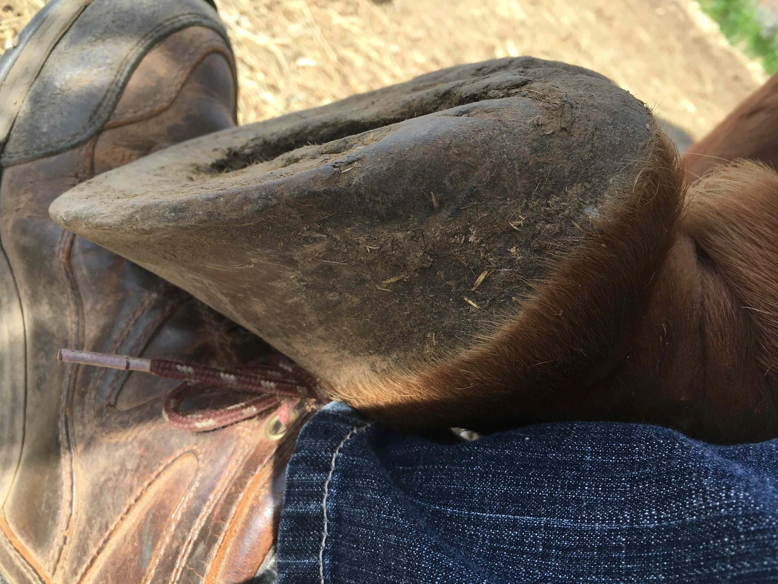 Clients of mine acquired Dee, a Horse Quarter mare in her teens, with apparent discomfort in the back of the left front. She held this leg buckled. She had worn her toes pathologically short.
