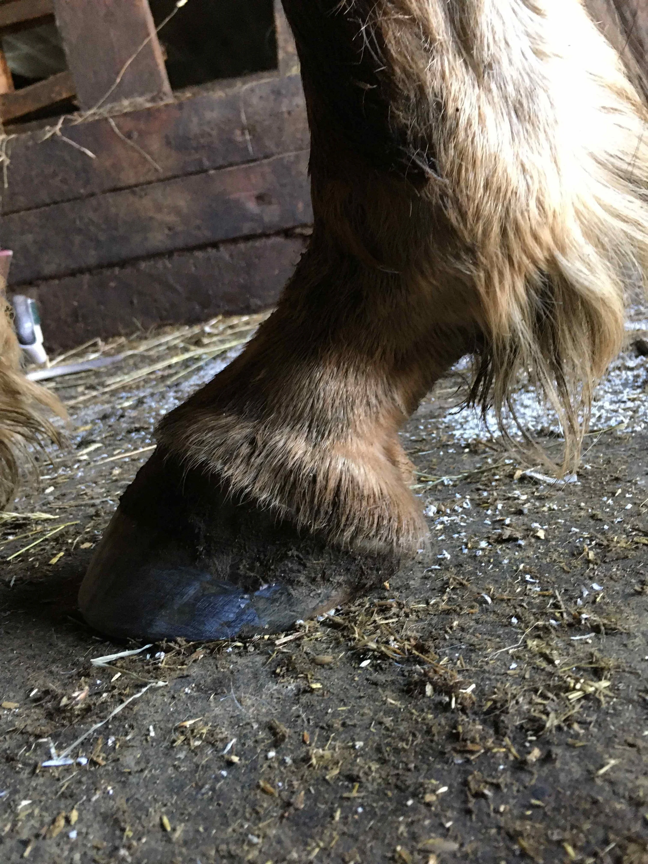 Left hind pre-trim January 2021 — eight weeks after the last trim — balance and mustang roll maintained beautifully.