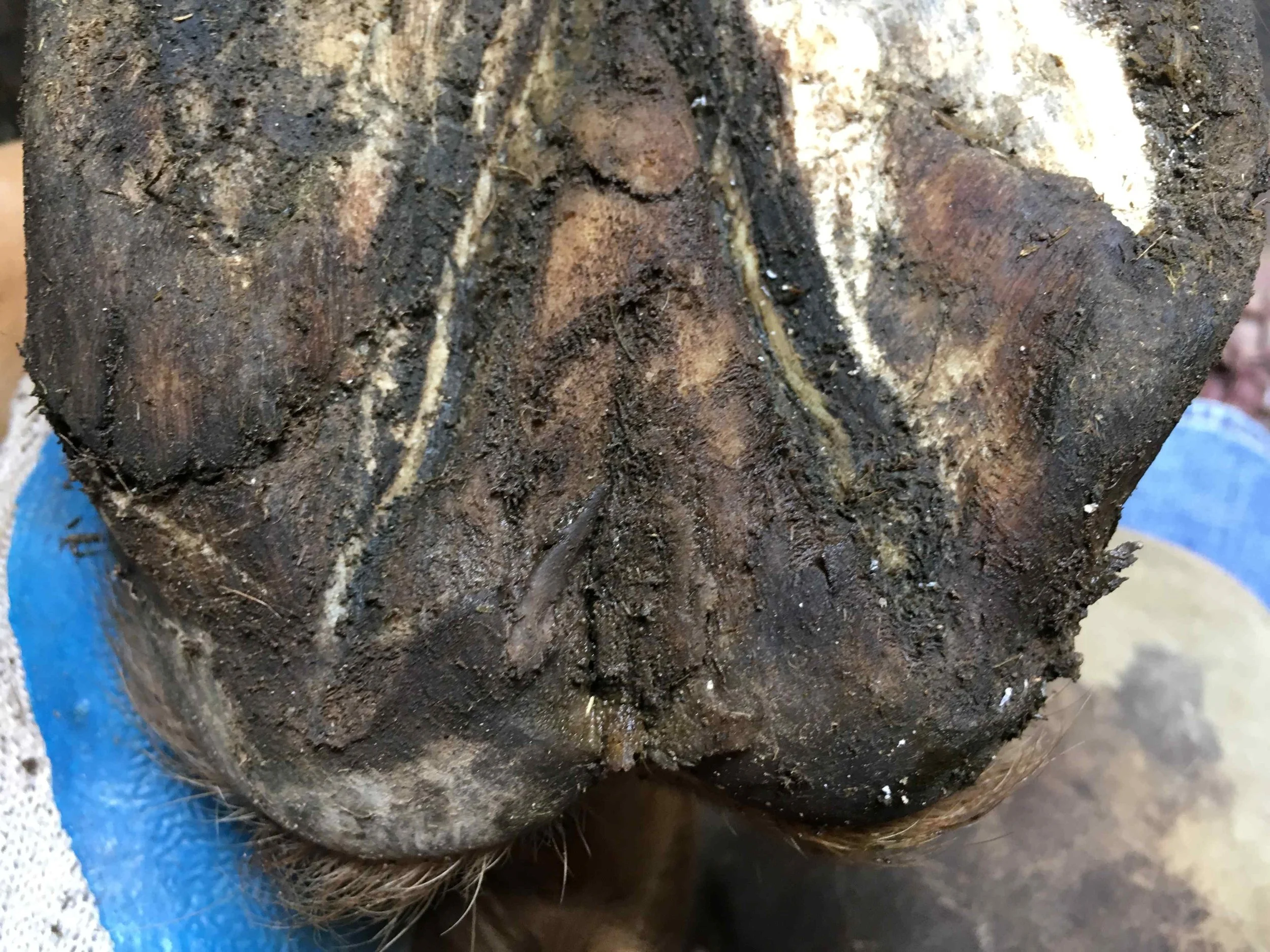 After eight years of trimming an abscess on the lateral side of the right hind revealed the true heel emerging from further back about one inch.