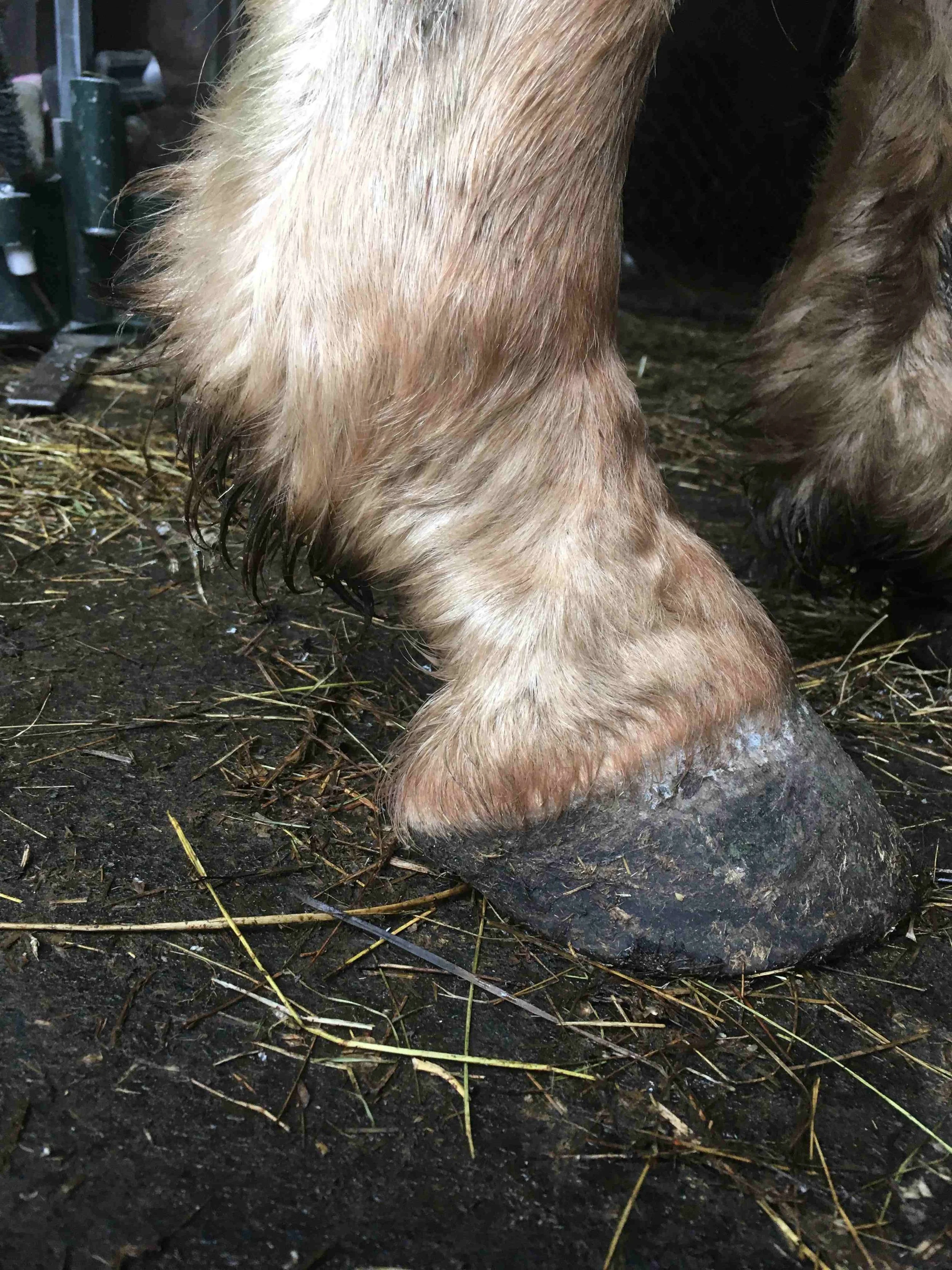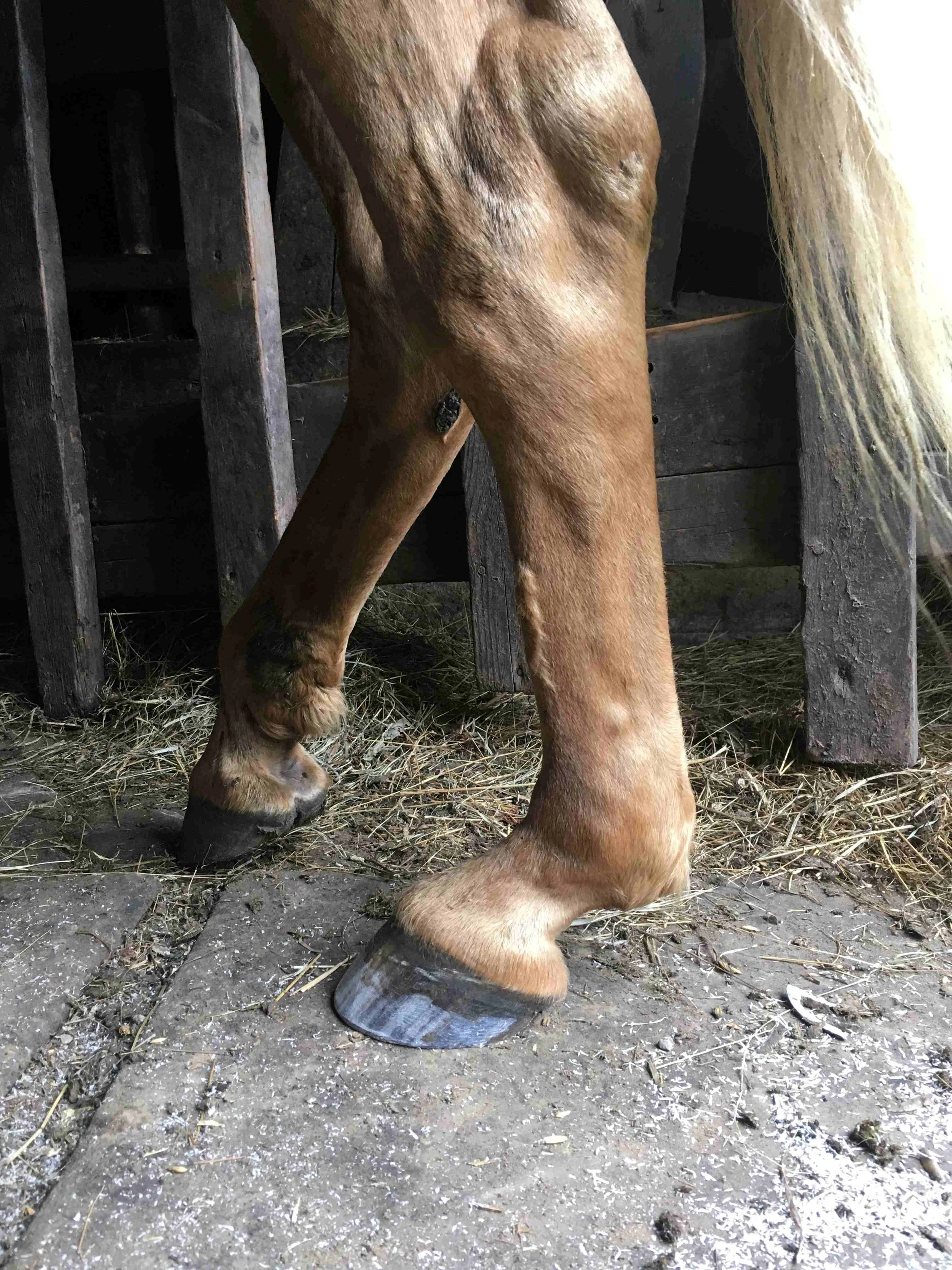 Left hind April 2022 — the hoof changed a lot in the last three years of his life. This photo shows another new divergent hoof emerging from further back – bringing out new bulbs and the hoof even more under the bone column of the leg.