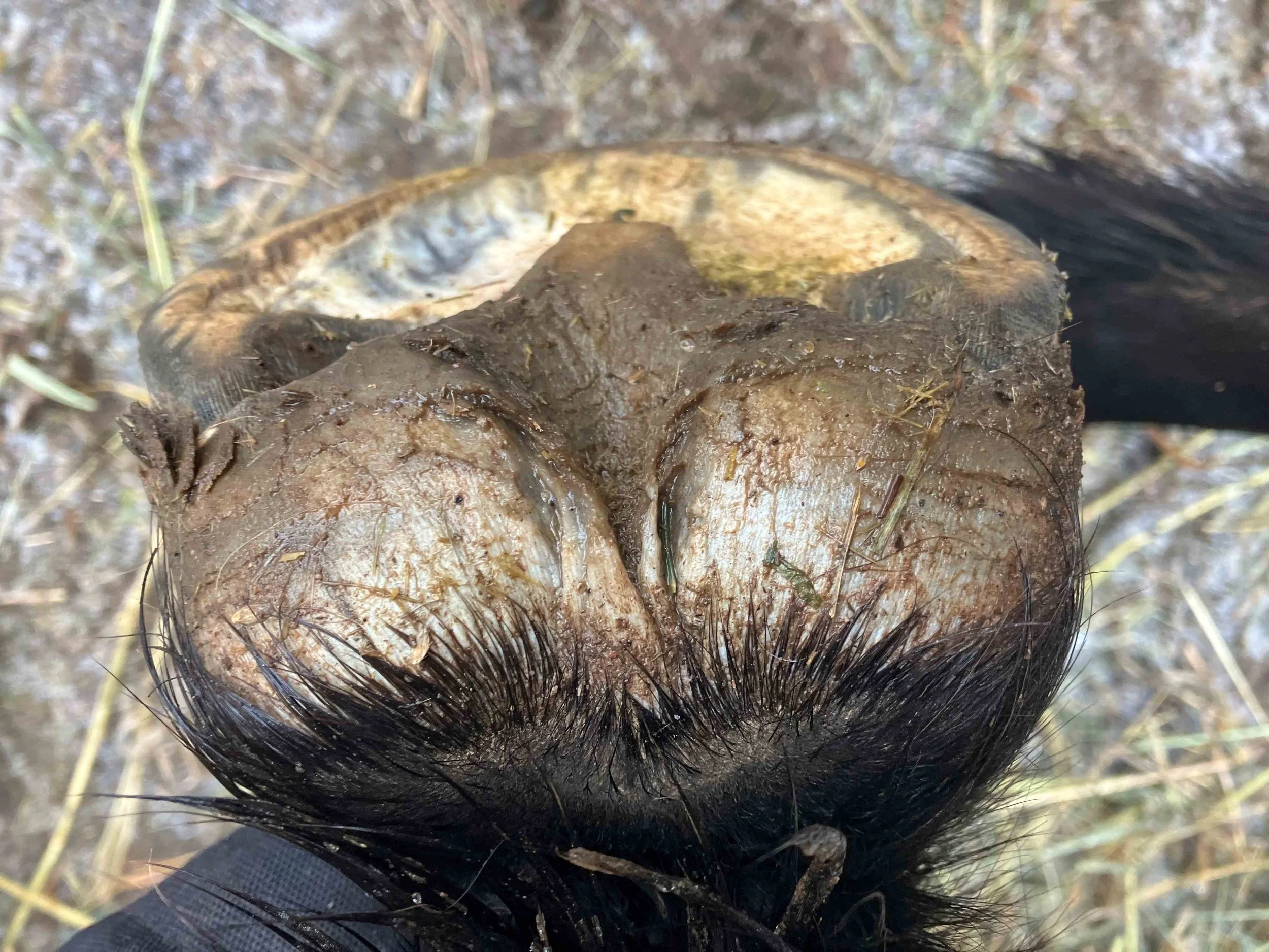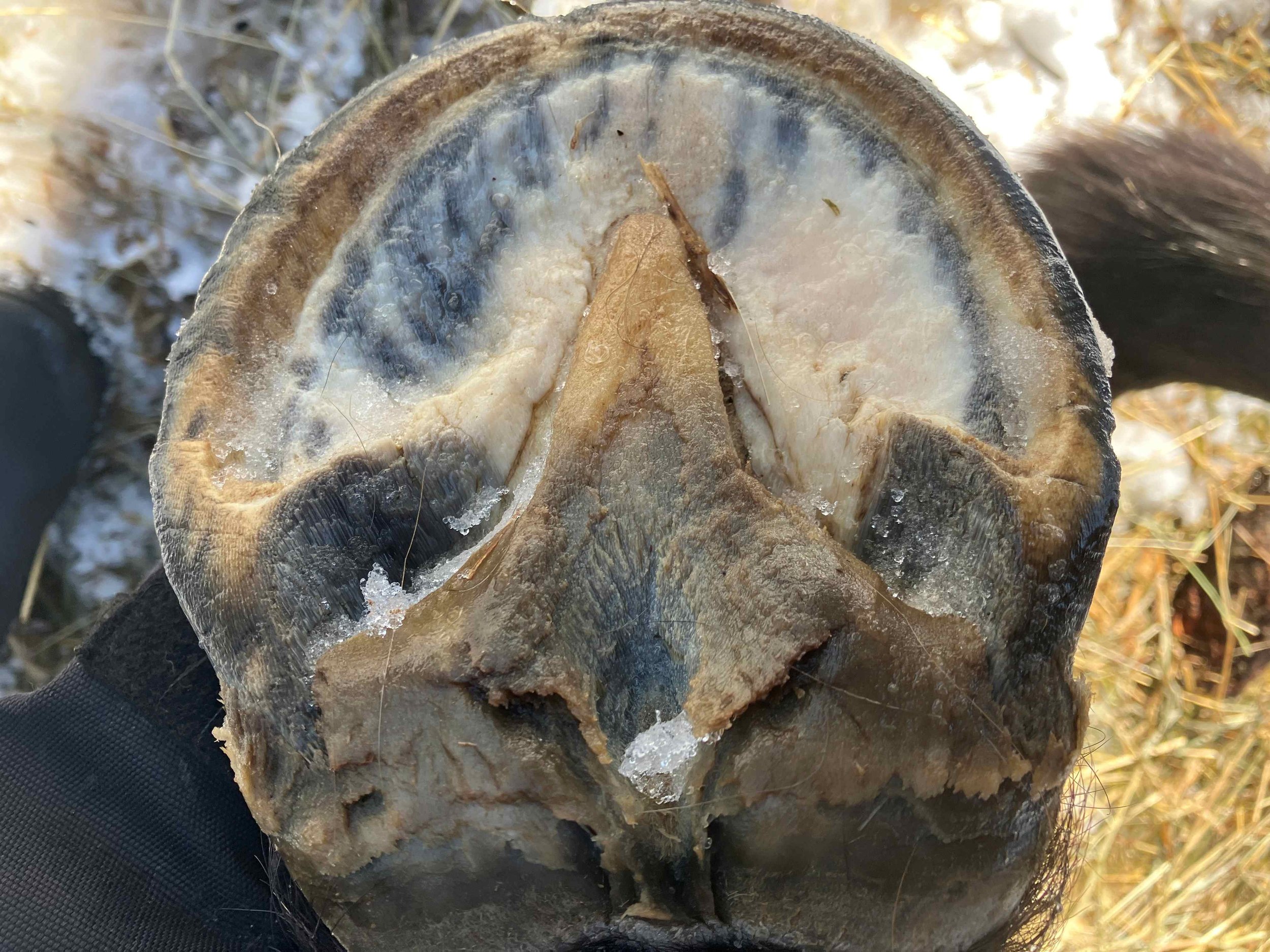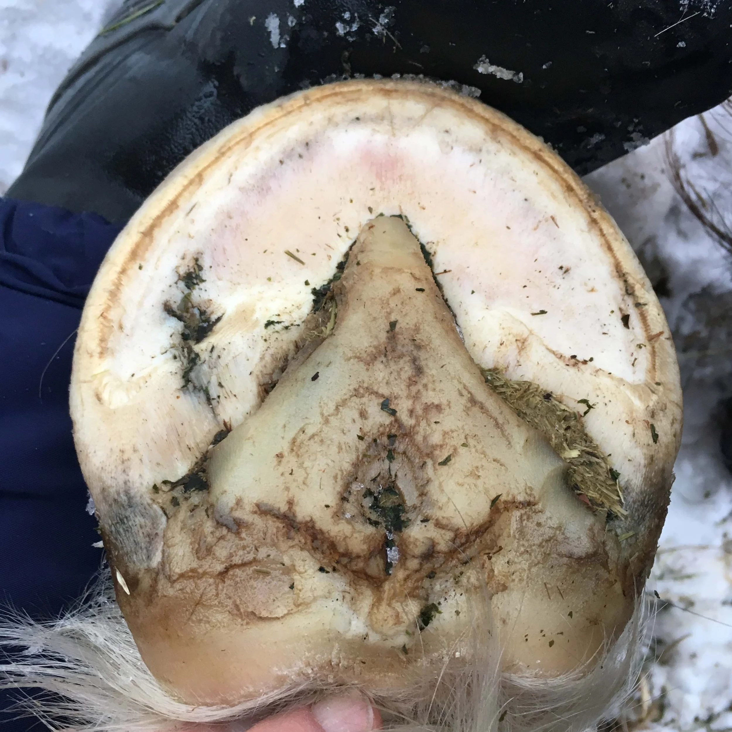 In March 2023 Katie’s hooves complemented the variant capsule angle-of-growth in all four hooves and the natural arch in the quarters simply appeared one day instead of me creating an arch artificially. There is natural beauty in her feet all-over including healthy bulbs and internal structures. Katie's legs straightened and her previously flat front hooves developed natural concavity without me ever touching her soles with a knife. The bruising in her soles faded.