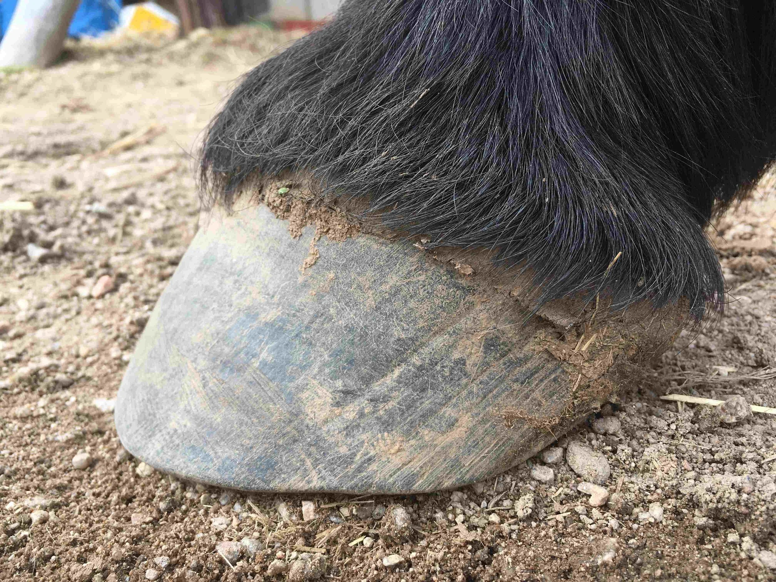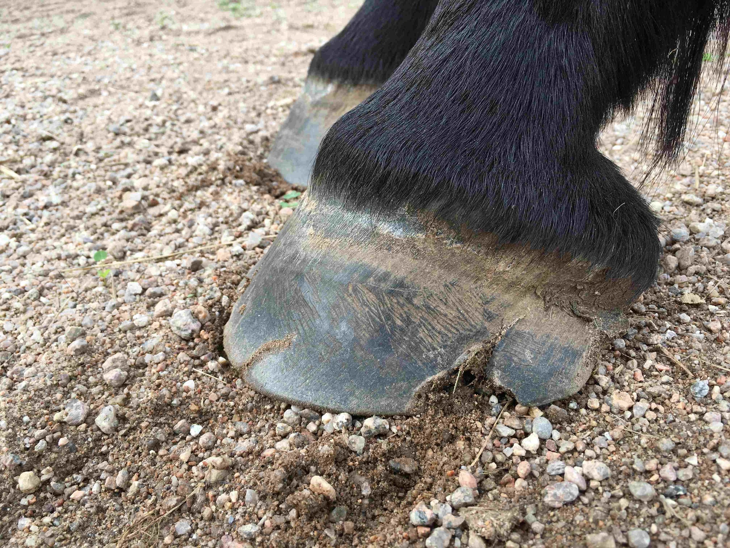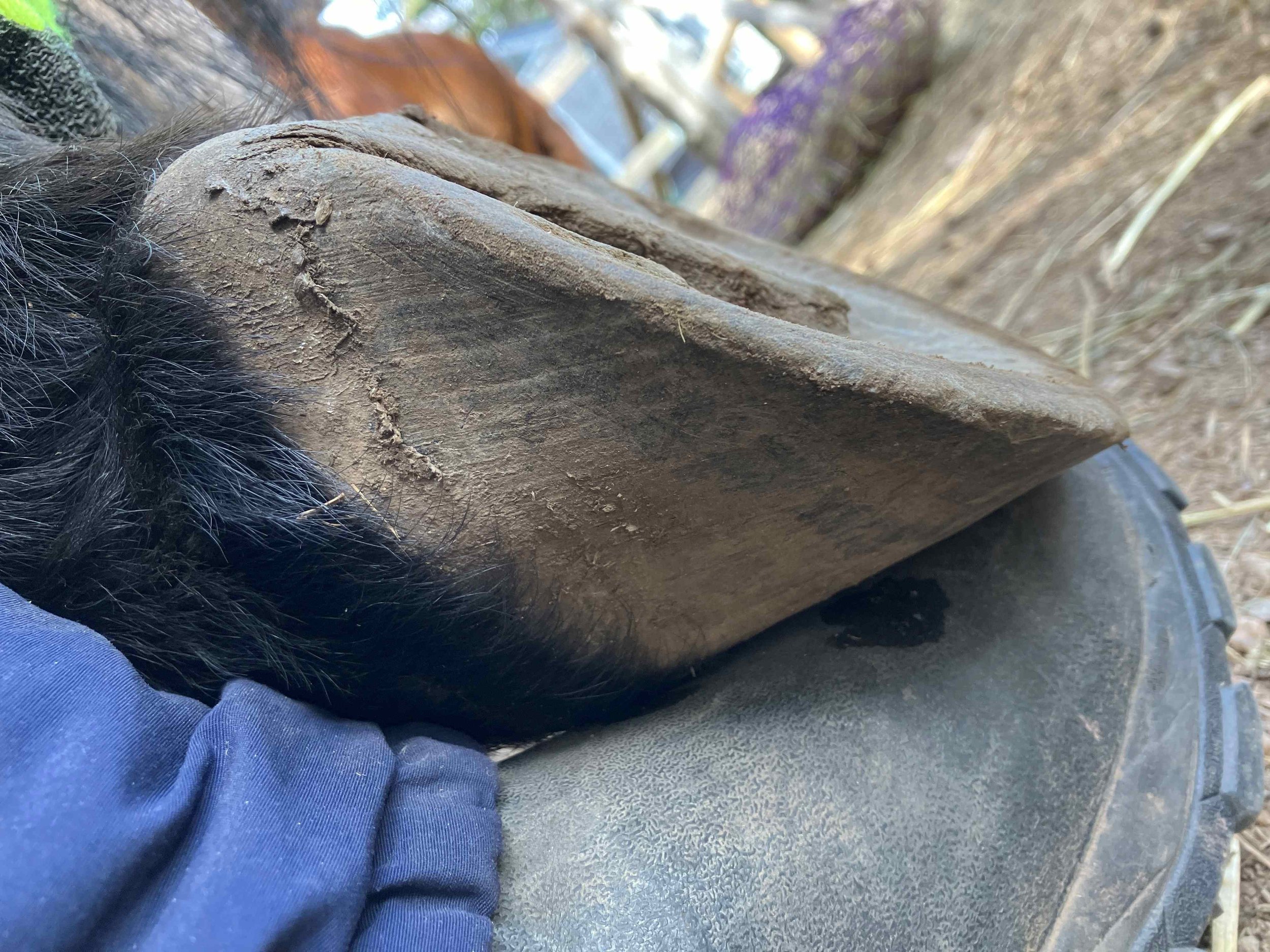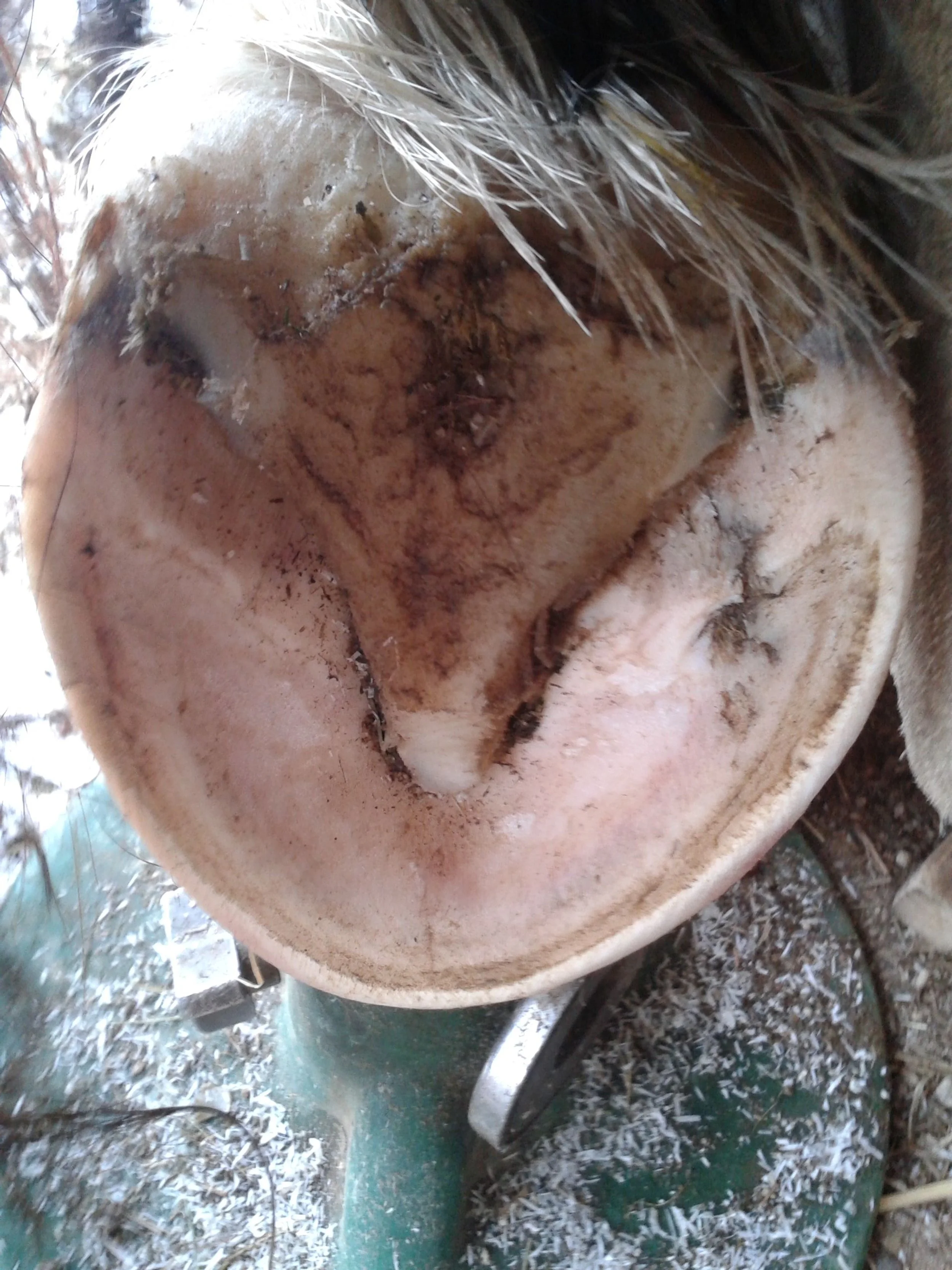 And in order to avoid pain from the sharp tips of the flared heels (which were extremely pointy and pinching into the soft tissue) Katie leaned on the lateral side with all four hooves. The horn capsules were warped. This gave a false pigeon-toed look in the front. Eventually, Katie's front hooves were drawn flat like pancakes. She injured her toe walls around the biggest pressure points which later showed up as cracks.
