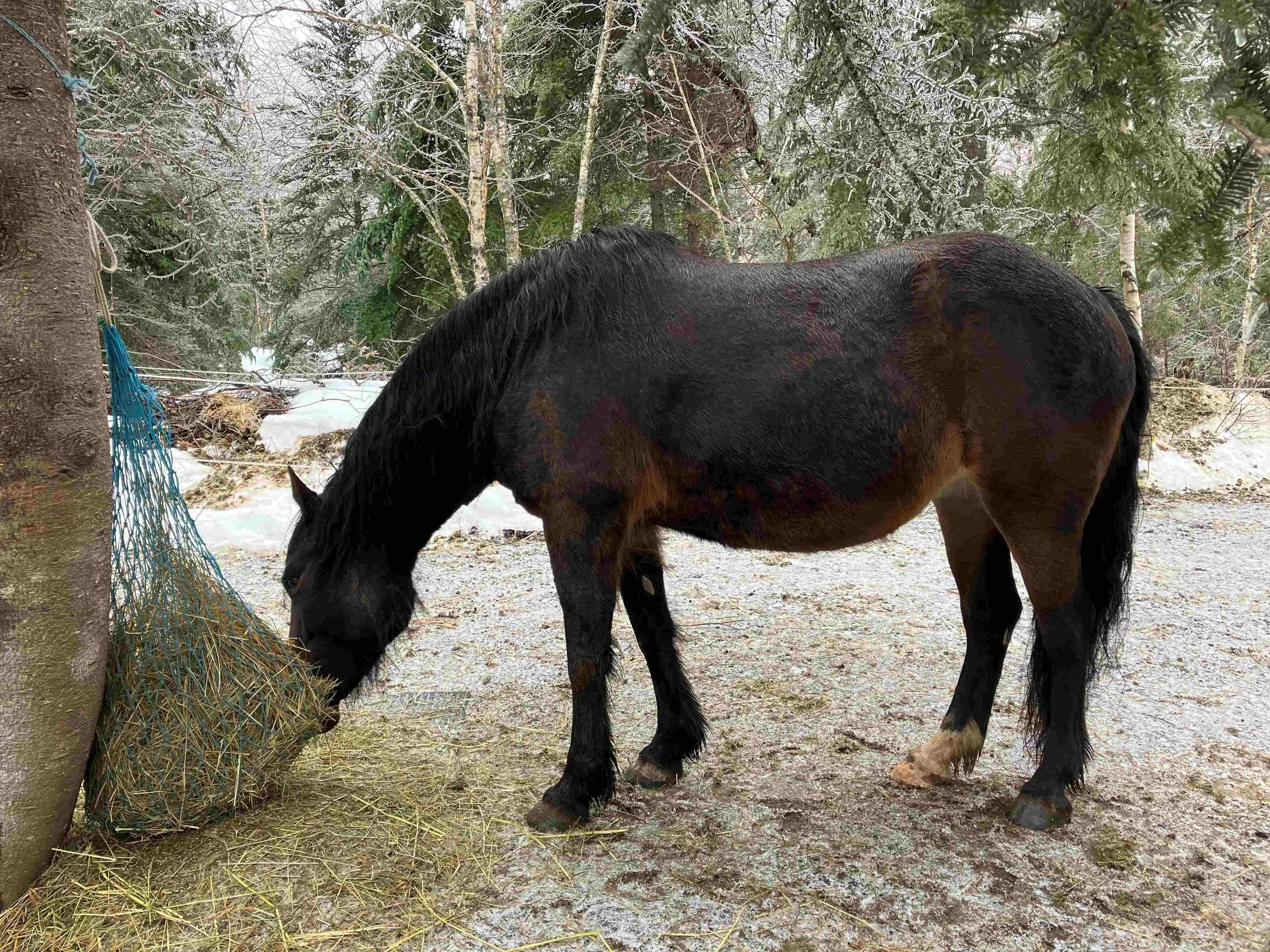 Since she moved to her forever home Katie has lots of movement on abrasive footing in a Paddock Paradise with 24/7 freedom. Her diet mainly consists of first cut hay, free choice loose organic minerals without any fillers, binders, sugars or cheap oils. She gets a handful of crushed oats in the winter and has as well free access to Diatomaceous Earth. She drinks good quality mountain spring water. There is no green grass pasture nor commercially mixed feeds, chemical dewormer or medication in her life.