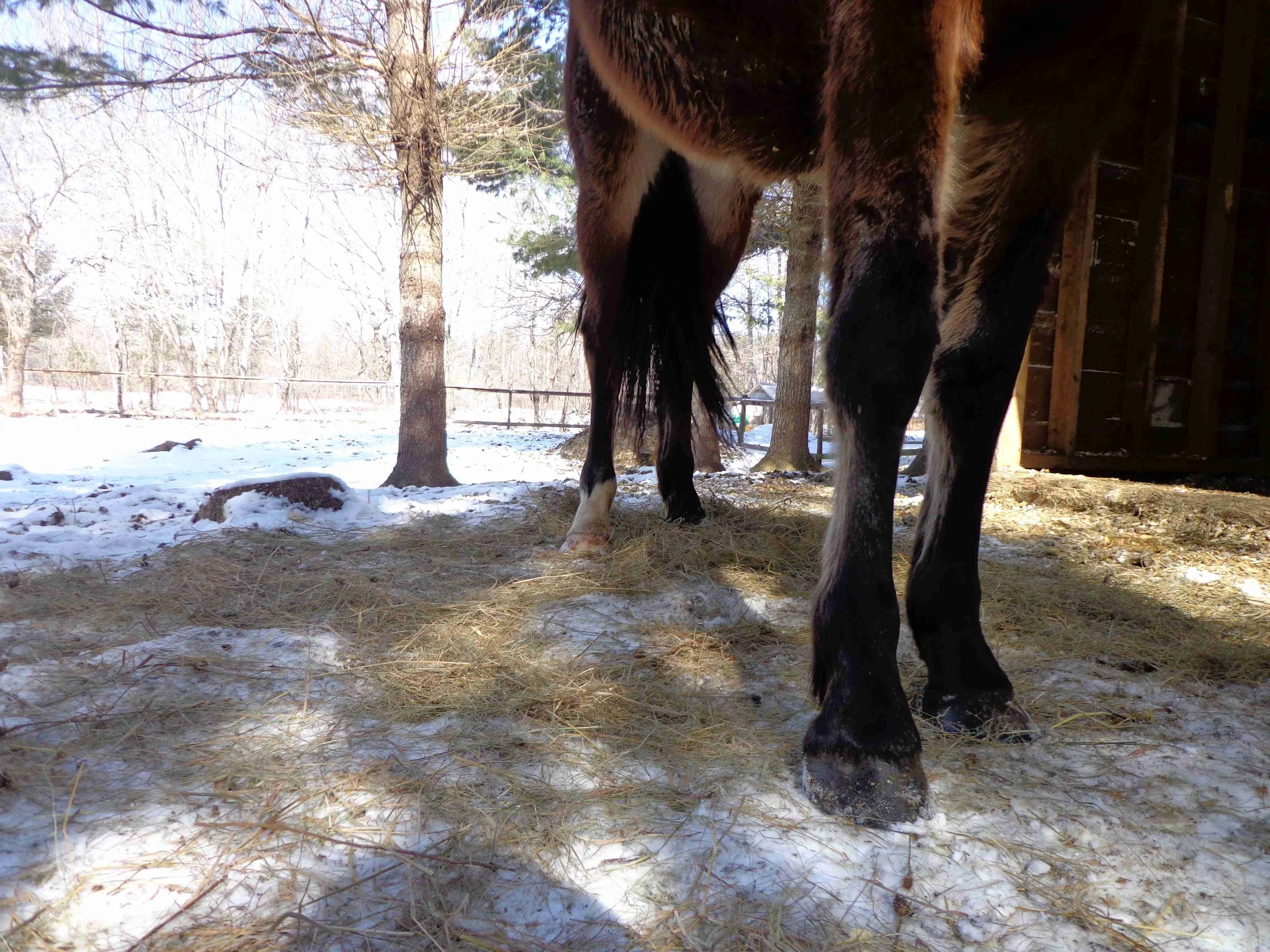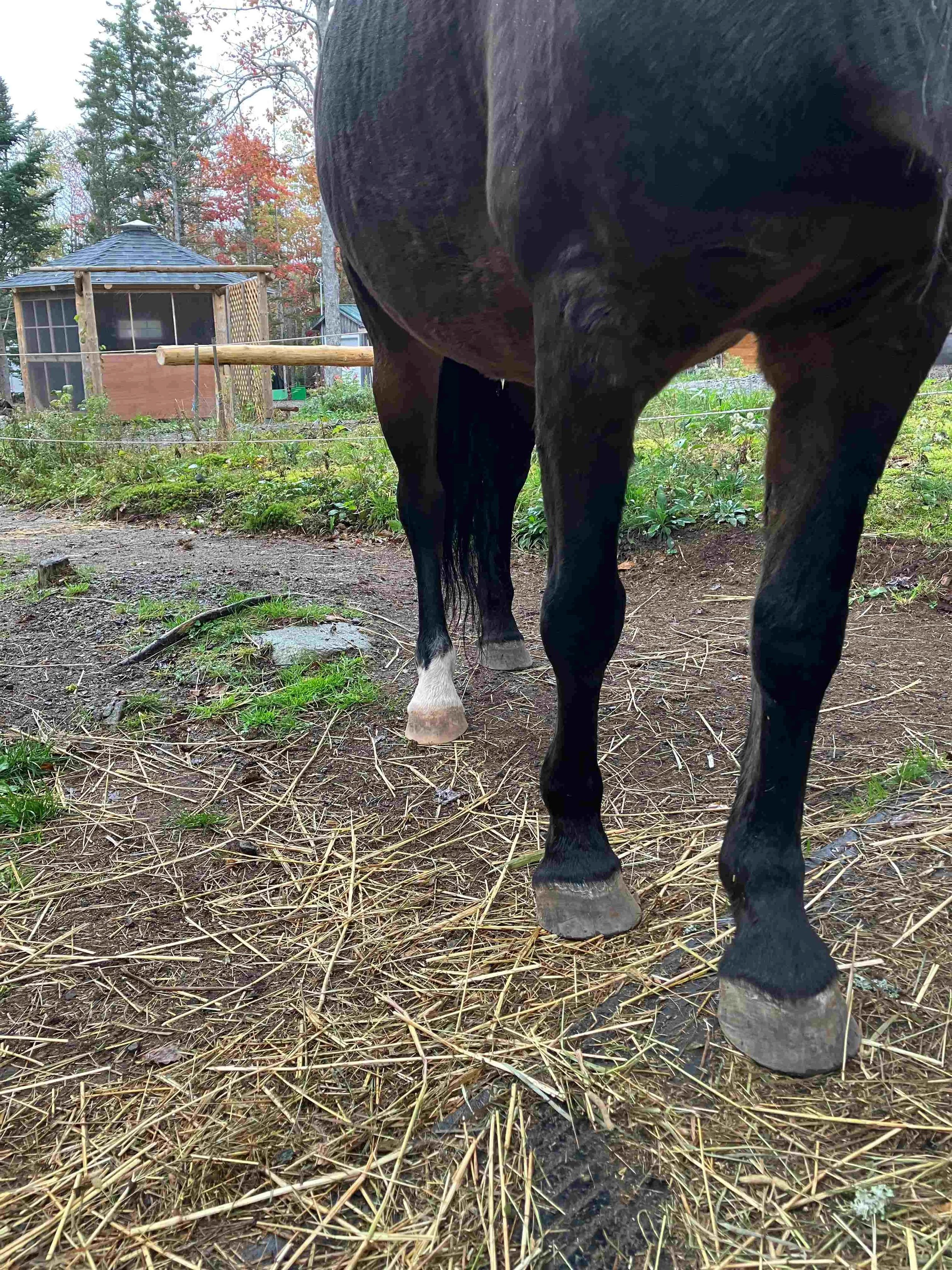 In November 2024 Katie's coat, all along her back and over her hind end, was sticking up weird for weeks. By the end of November something was shifting in her right hind stifle. There was a heat spot at the stifle and only very carefully did she put weight on the right hind. She worked through the situation within a few weeks. There was no abscess.