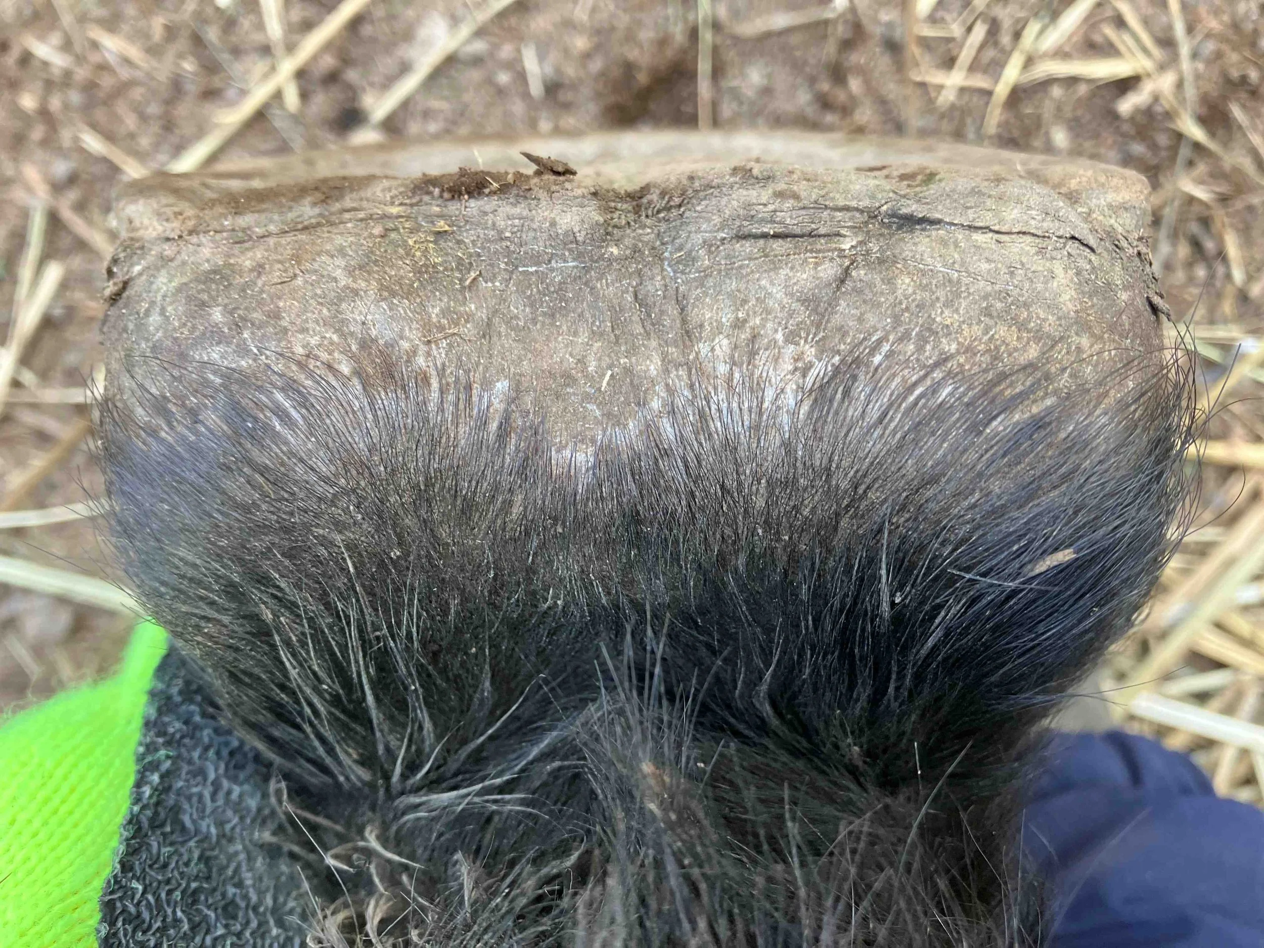 Left front April 2023 — the bulbs increased in mass since the horses had compacted crusher dusted surfaces on the track