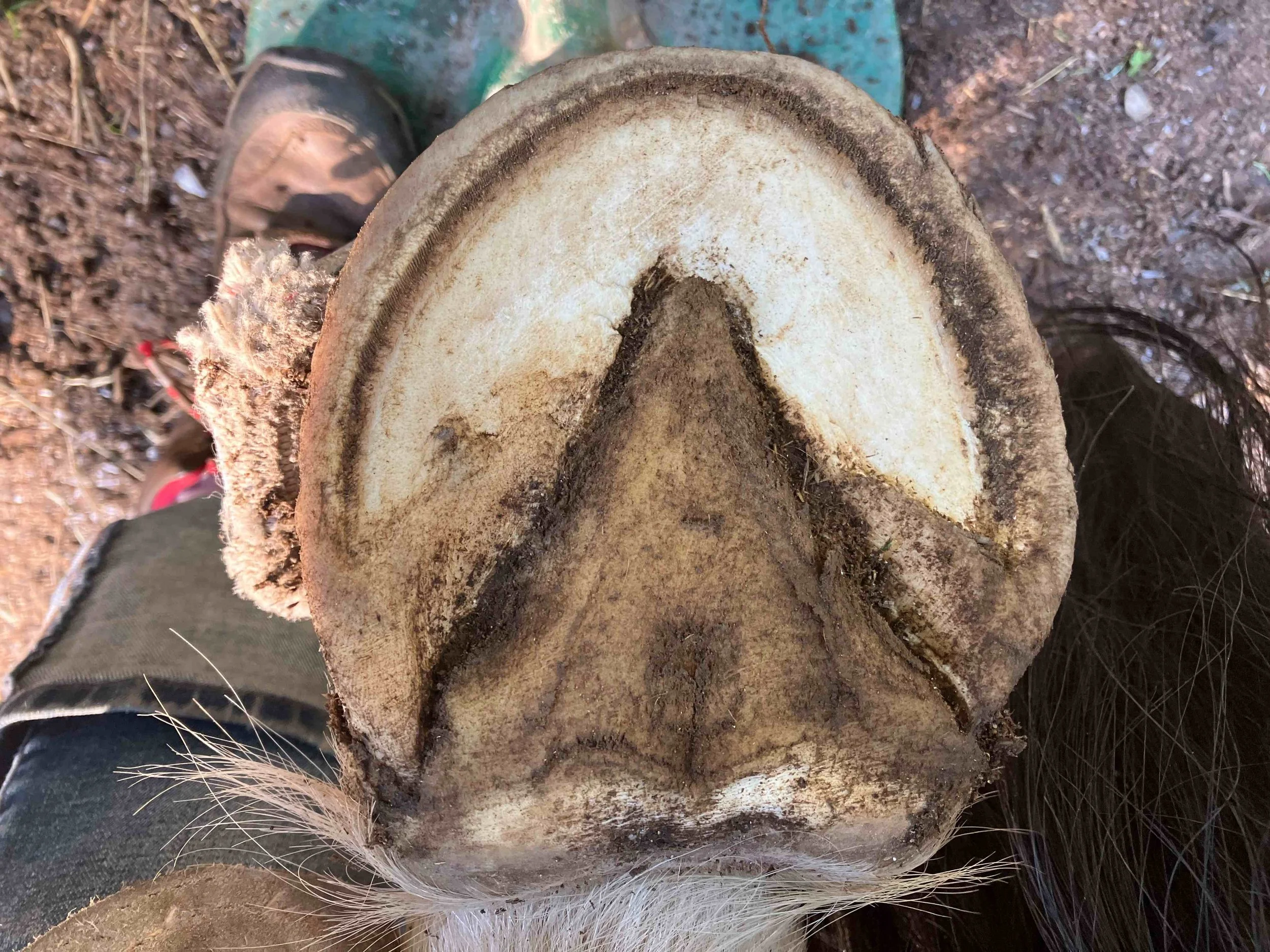 The most fascinating part of watching this horse heal was observing the changes in her hooves. They shifted under the bone column via divergent hooves more and more. The new hooves coming down from the hairline continued to emerge from further back. There were some crazy predetermined breaking points exactly at the line of a new and divergent hoof. In 2017 and 2021 big chunks of hoof broke off. However, no matter what her hooves did, I never drifted away from following the guidelines of The Natural Trim for one single moment. I ignored all pathology and respected the healing powers of nature. Those events, when chunks broke off, revealed not only the damage Katie had done to her own feet involuntarily but also the completion (failed after birth) of the variant capsule angle-of-growth in the back. This took place in sync with the healing.