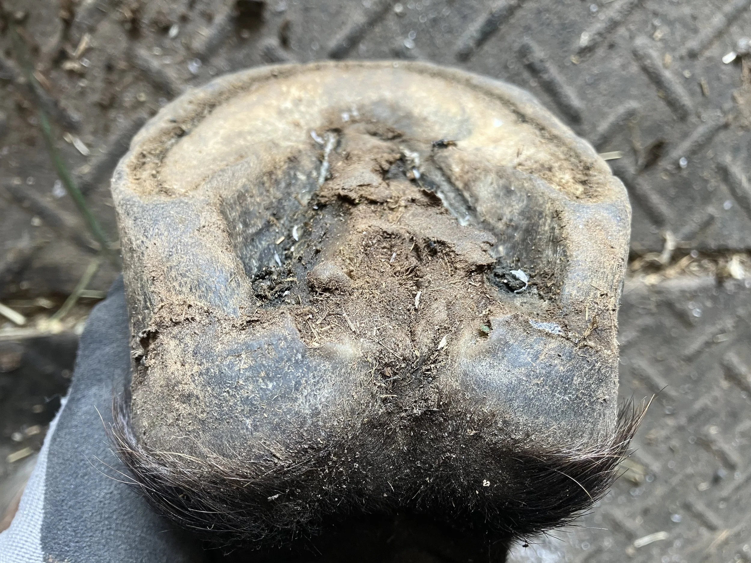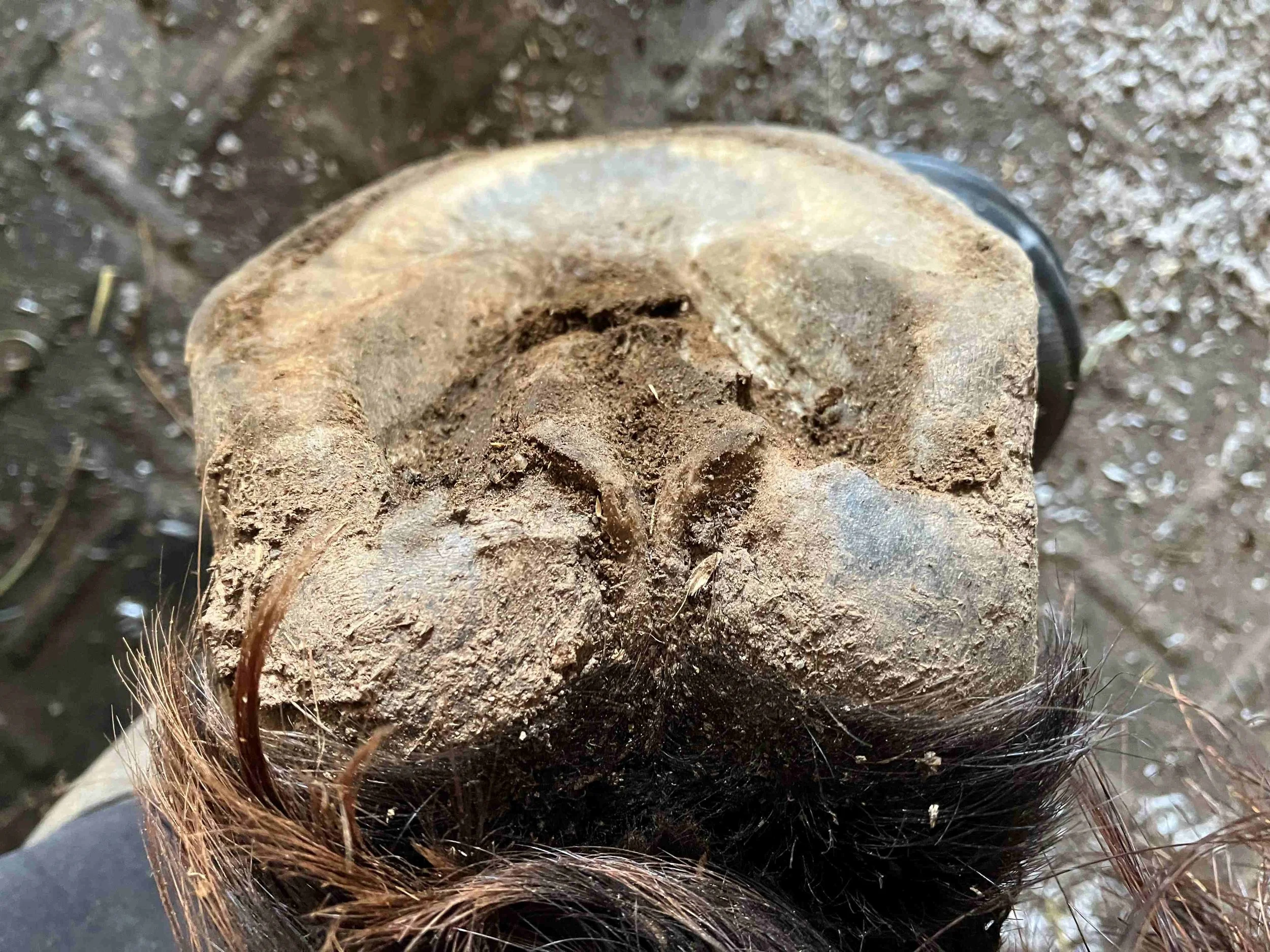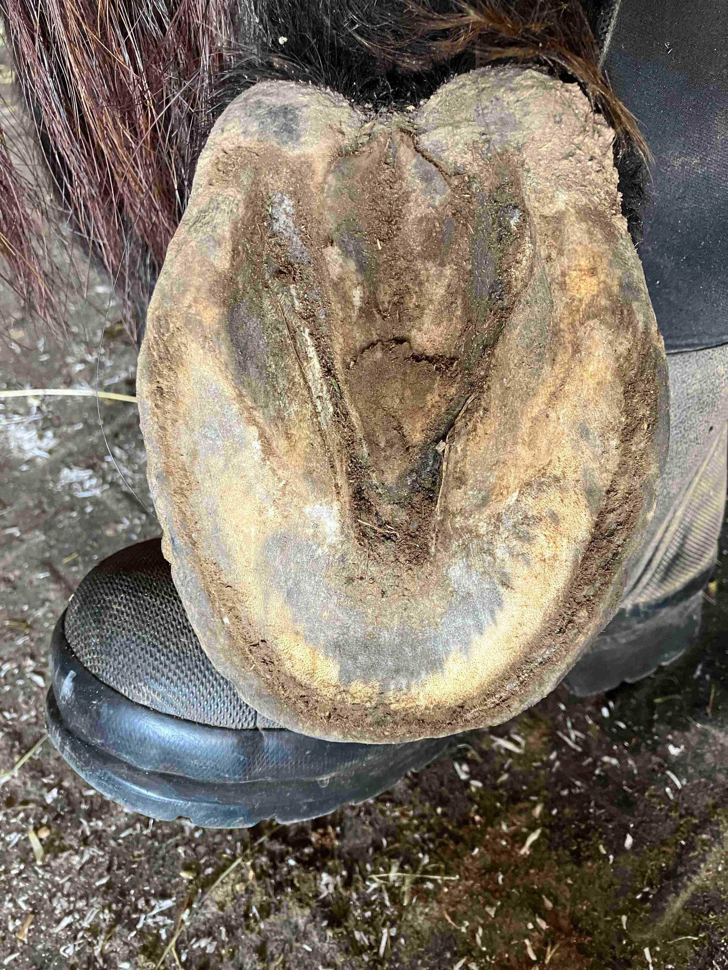 Right hind pre-trim June 2024 — she is no longer leaning on the lateral side and there is a rim of toe wall visible