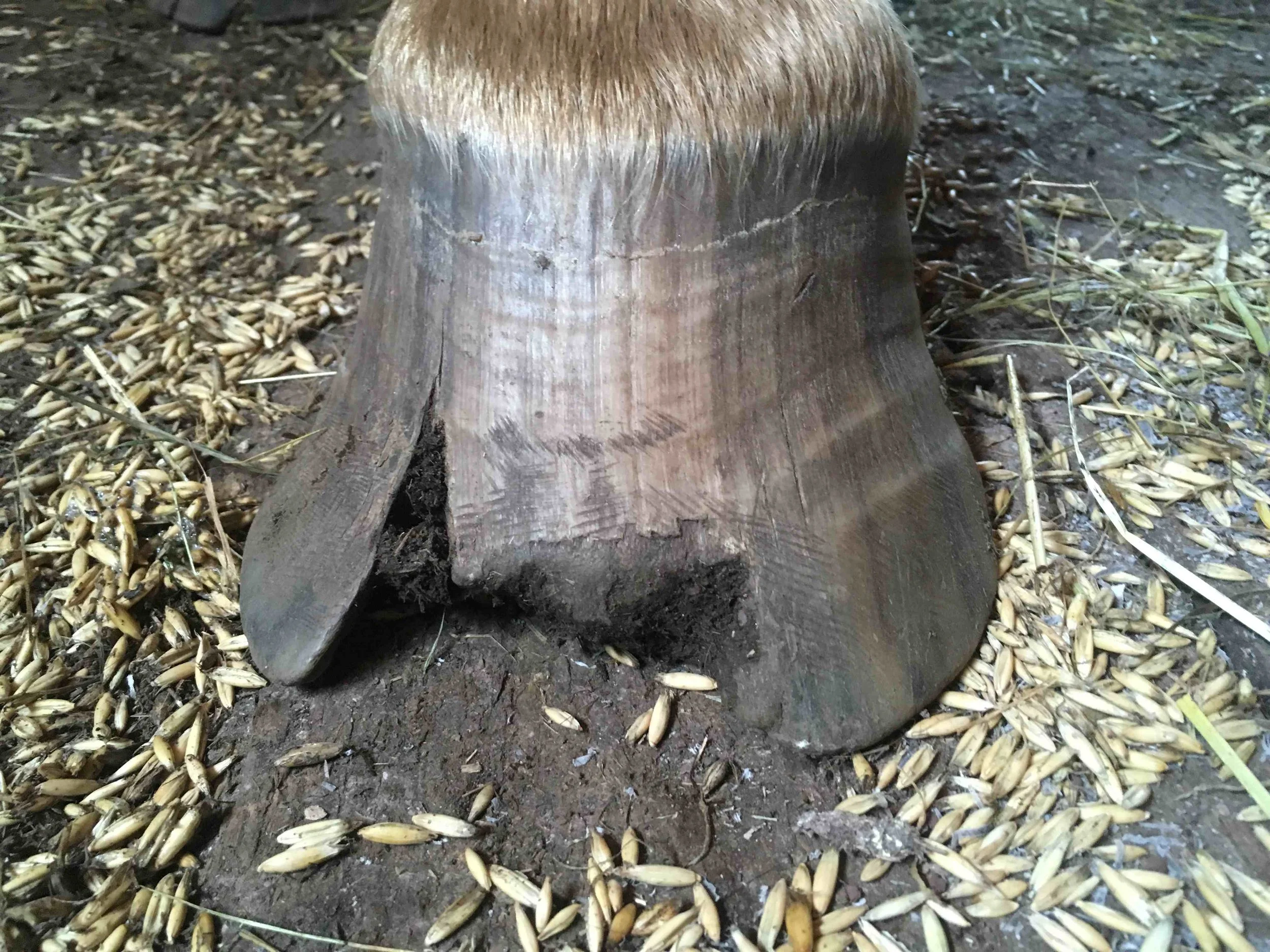 During the healing phase Star had several extreme divergent hooves. Whenever the new and divergent hoof took over, chunks of the previous hoof broke off in crazy patterns (showing the areas of injury from bracing and leaning). Damaged and compromised tissue was as well released through a few abscesses.