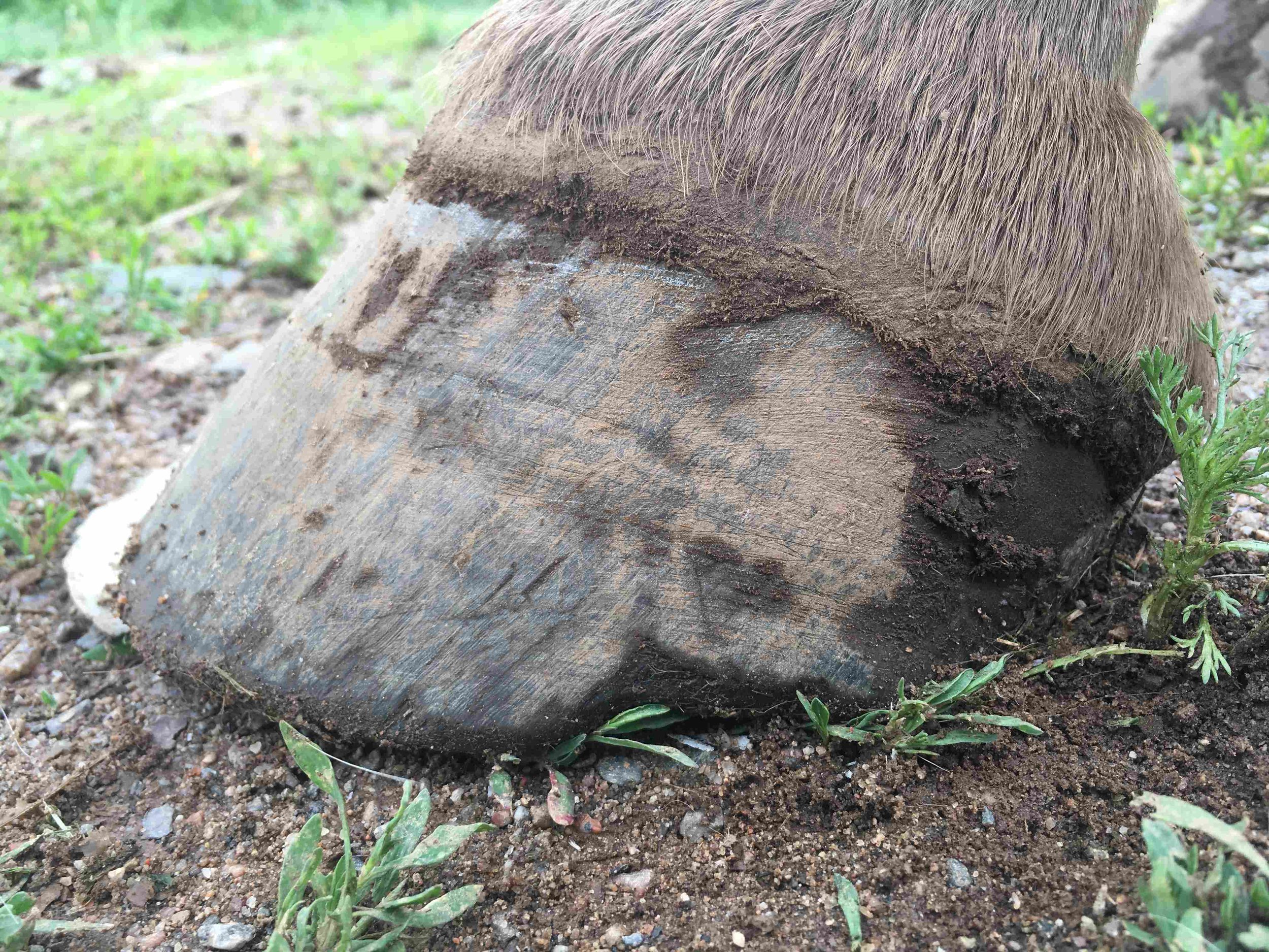 Left hind pre-trim June 2019 — the next divergent hoof is halfway in and placing the hoof more under the bone column; the variant capsule angle-of-growth in the back is finalizing