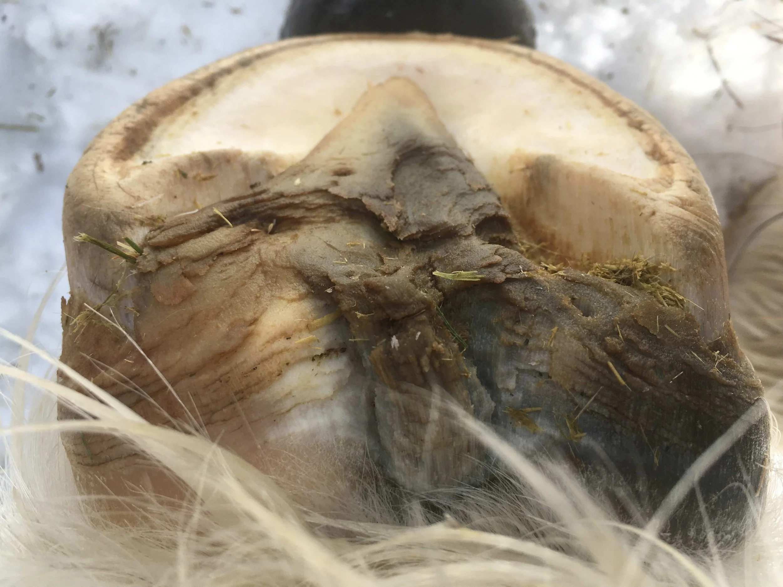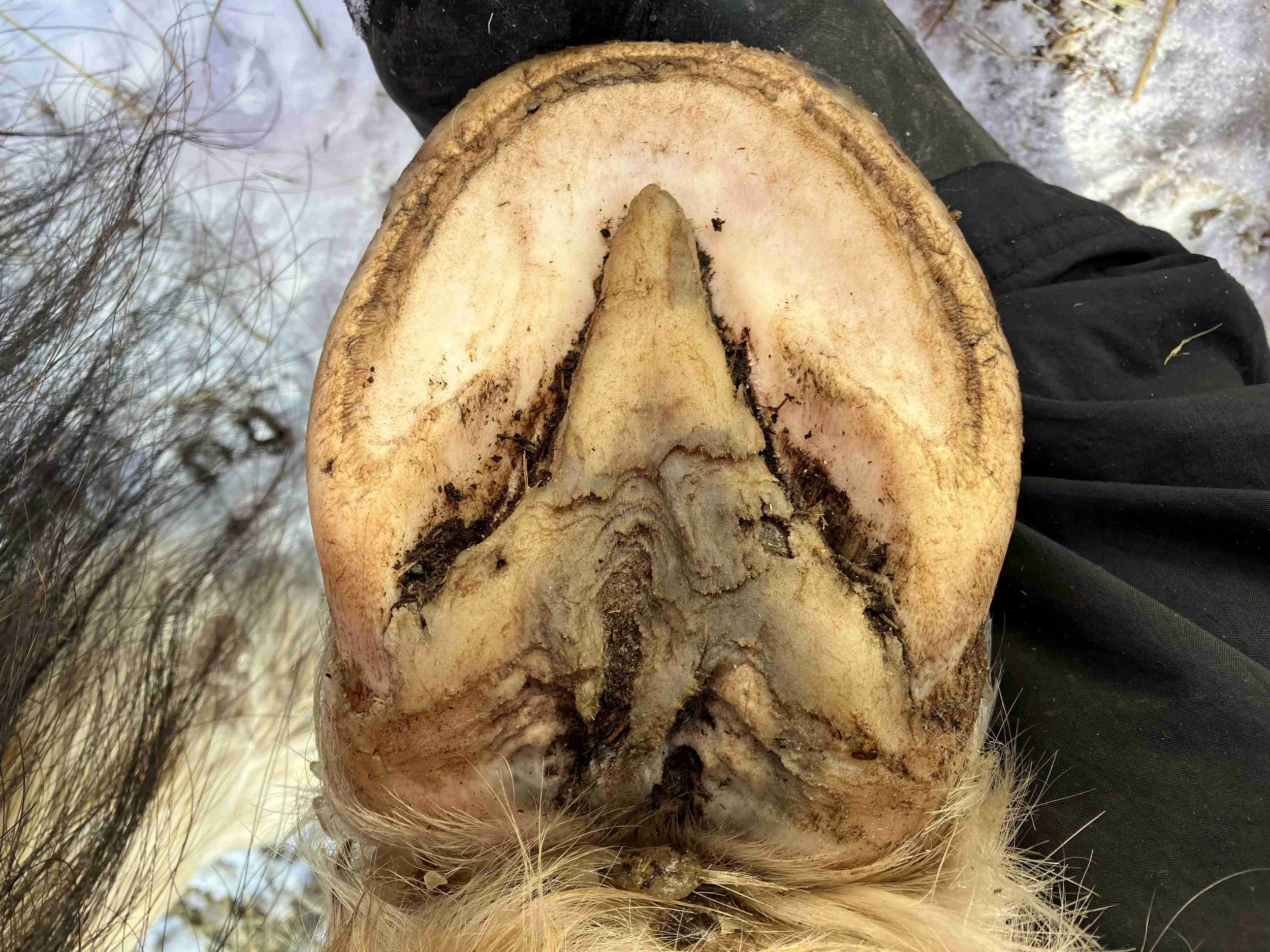 Right hind pre-trim February 2023 — the new layer of frog coming in shows how much of a shift of horn has taken place; bulbs are increasing in mass