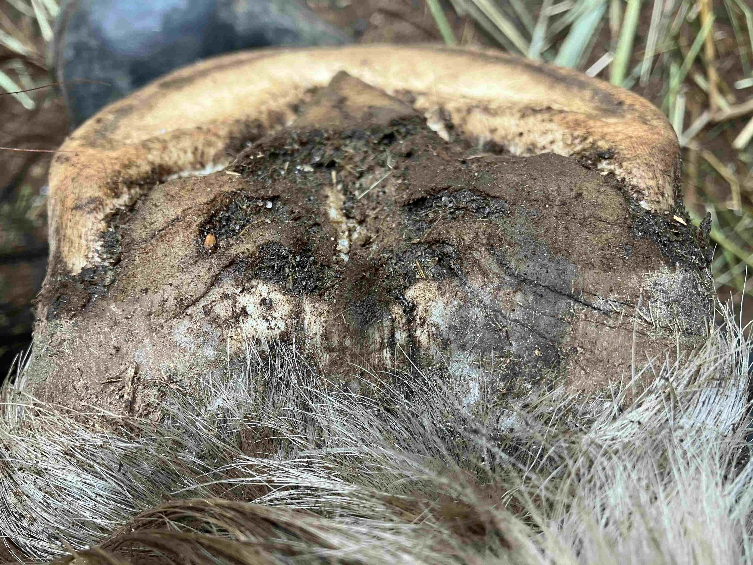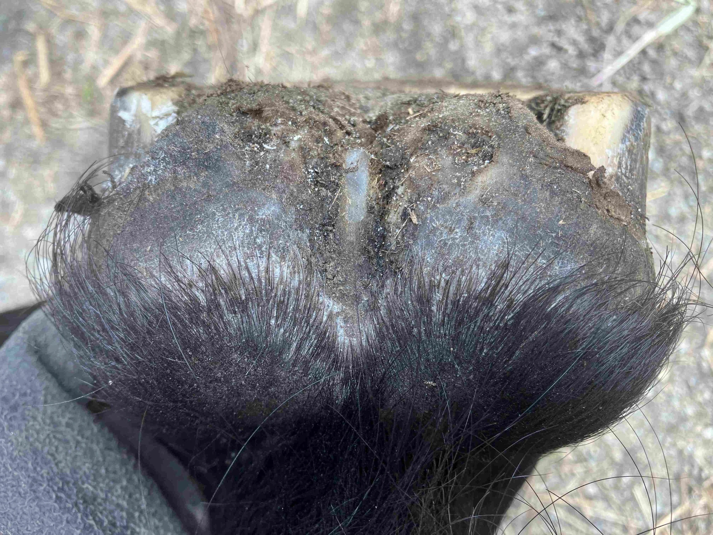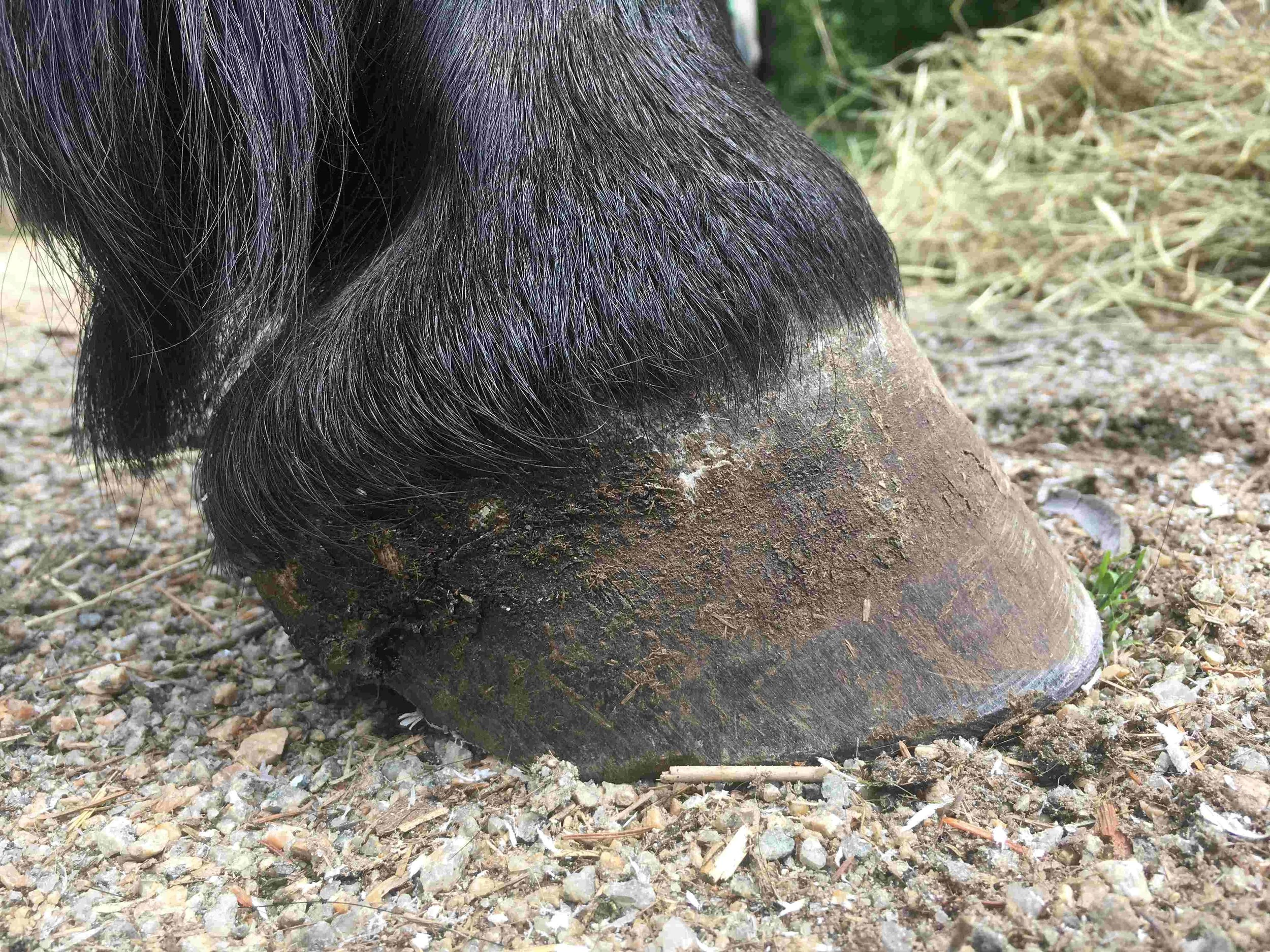 Left hind pre-trim February 2023 — the dark blue/grey color of the bruised tissue is lessening; frog and bulbs are increasing in mass