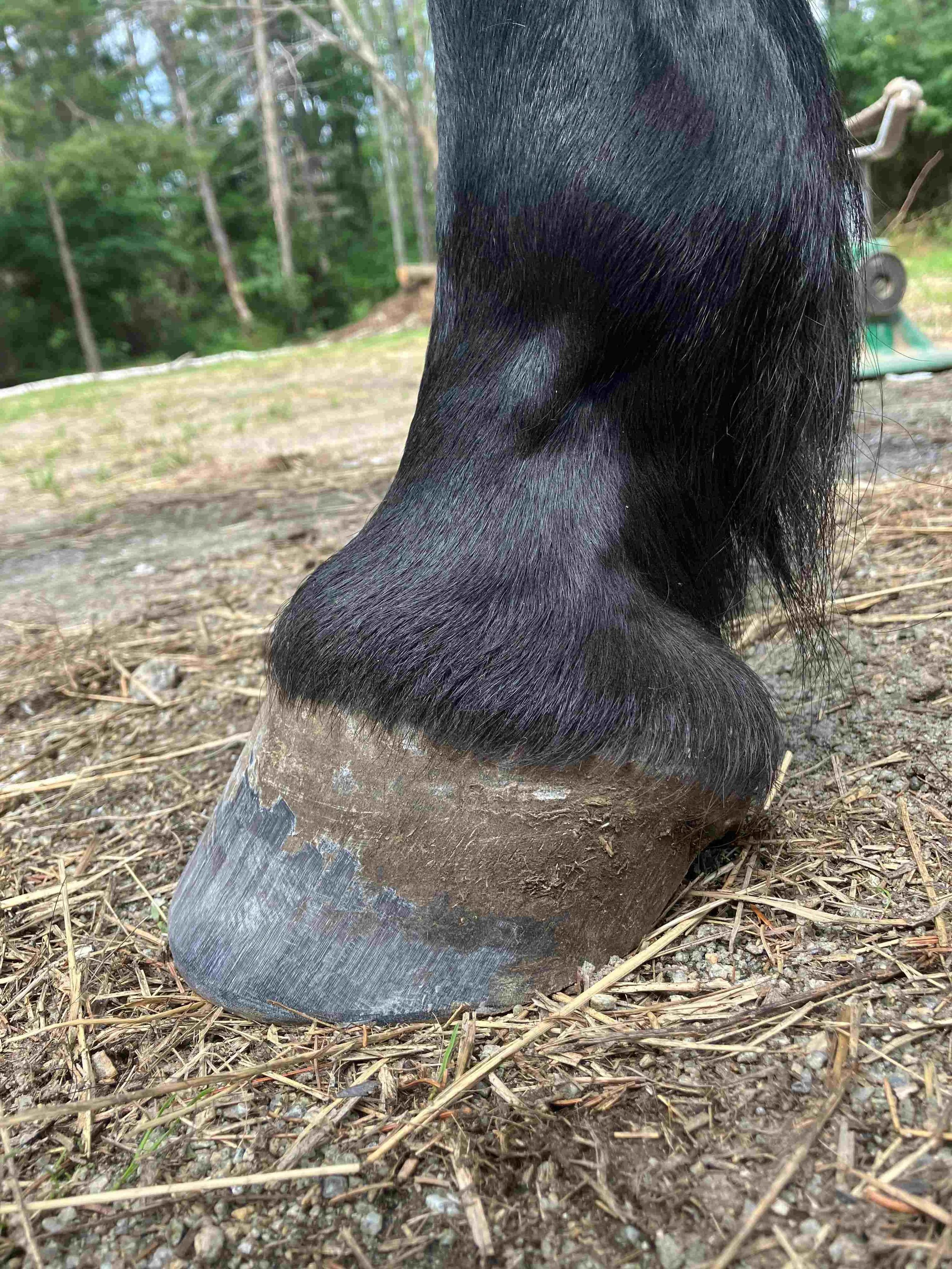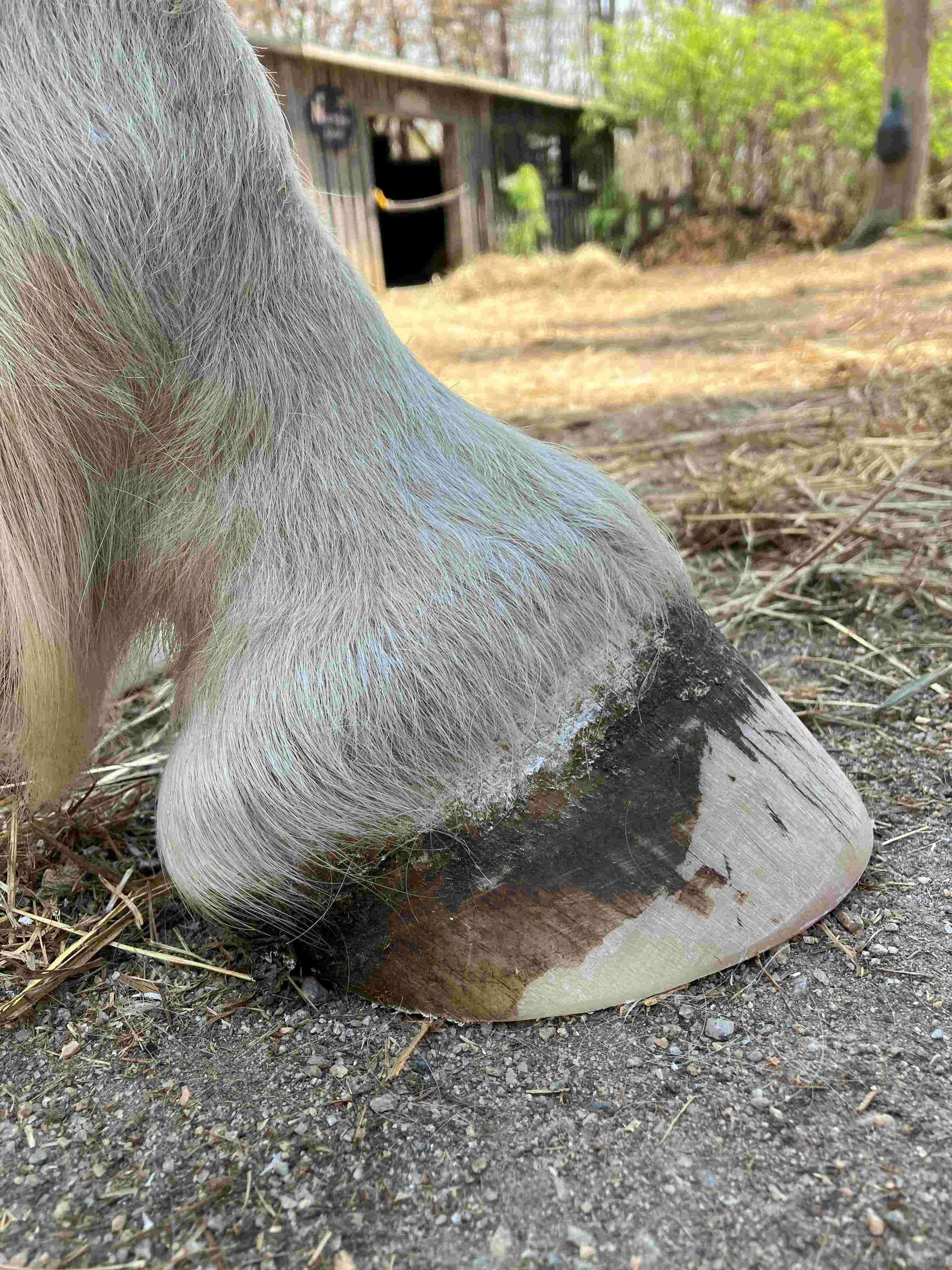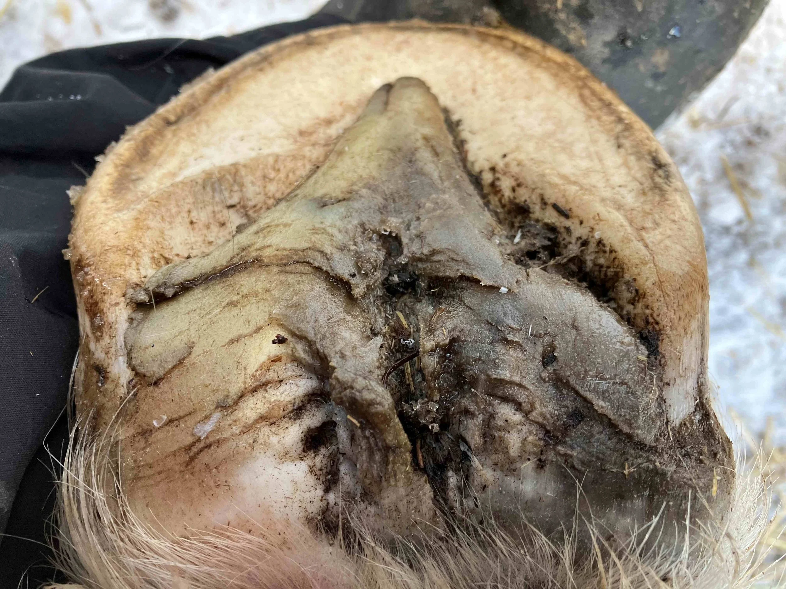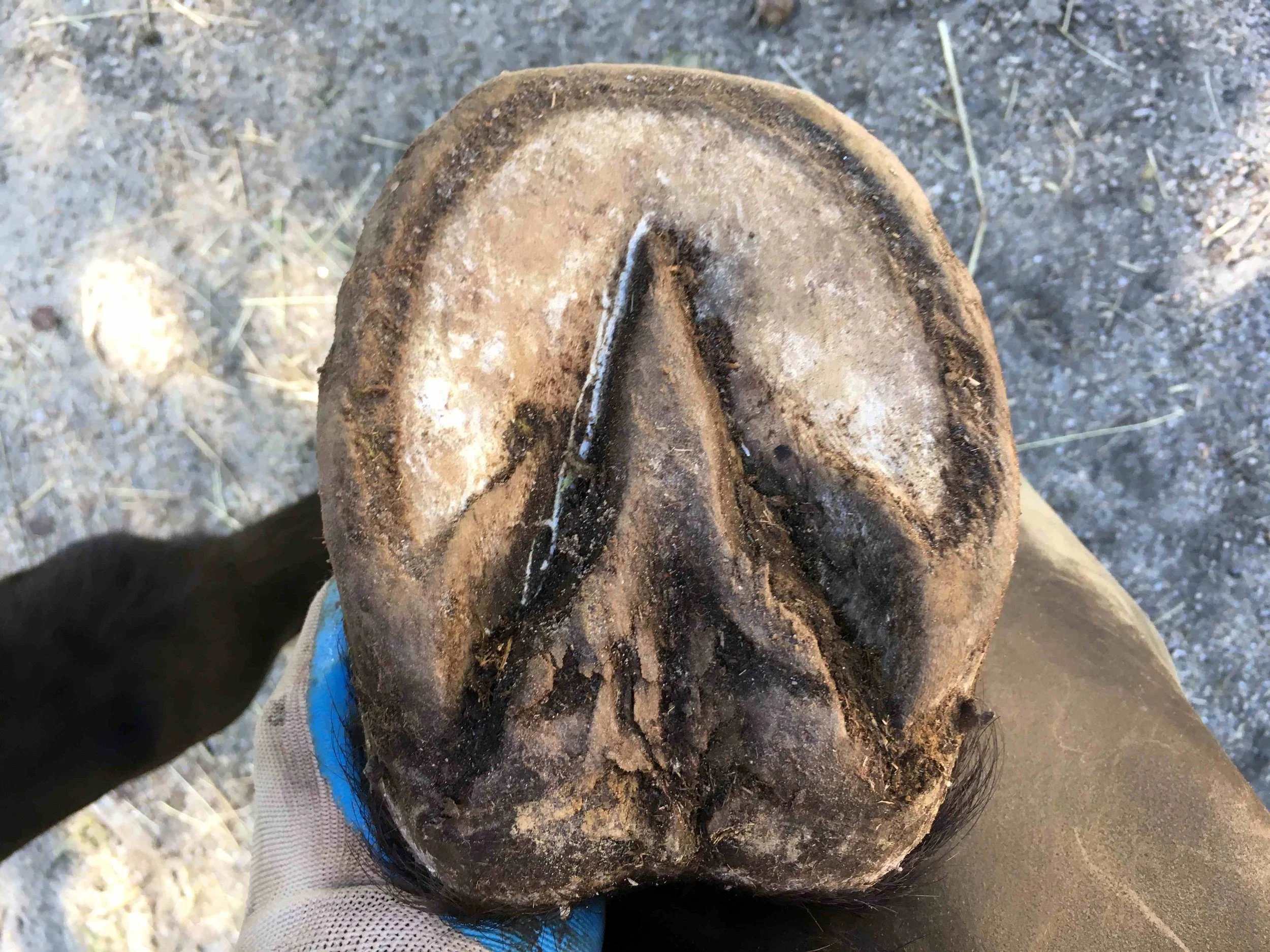 Left hind pre-trim February 2023 — the dark blue/grey color of the bruised tissue is lessening; frog and bulbs are increasing in mass