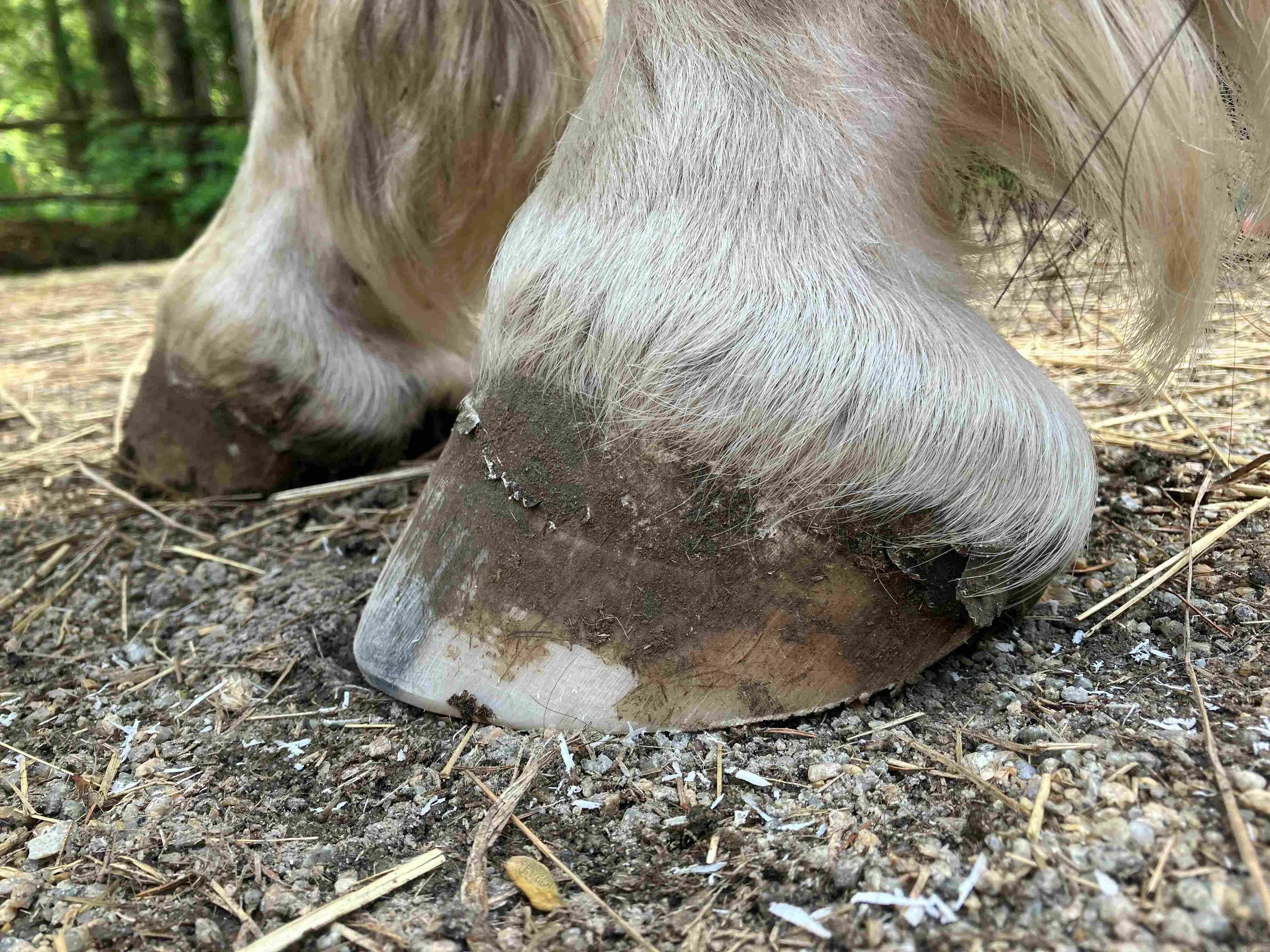 Right front post-trim July 2021 — a new and divergent hoof has emerged from further back and is about one inch down = bringing the hoof further under the bone column