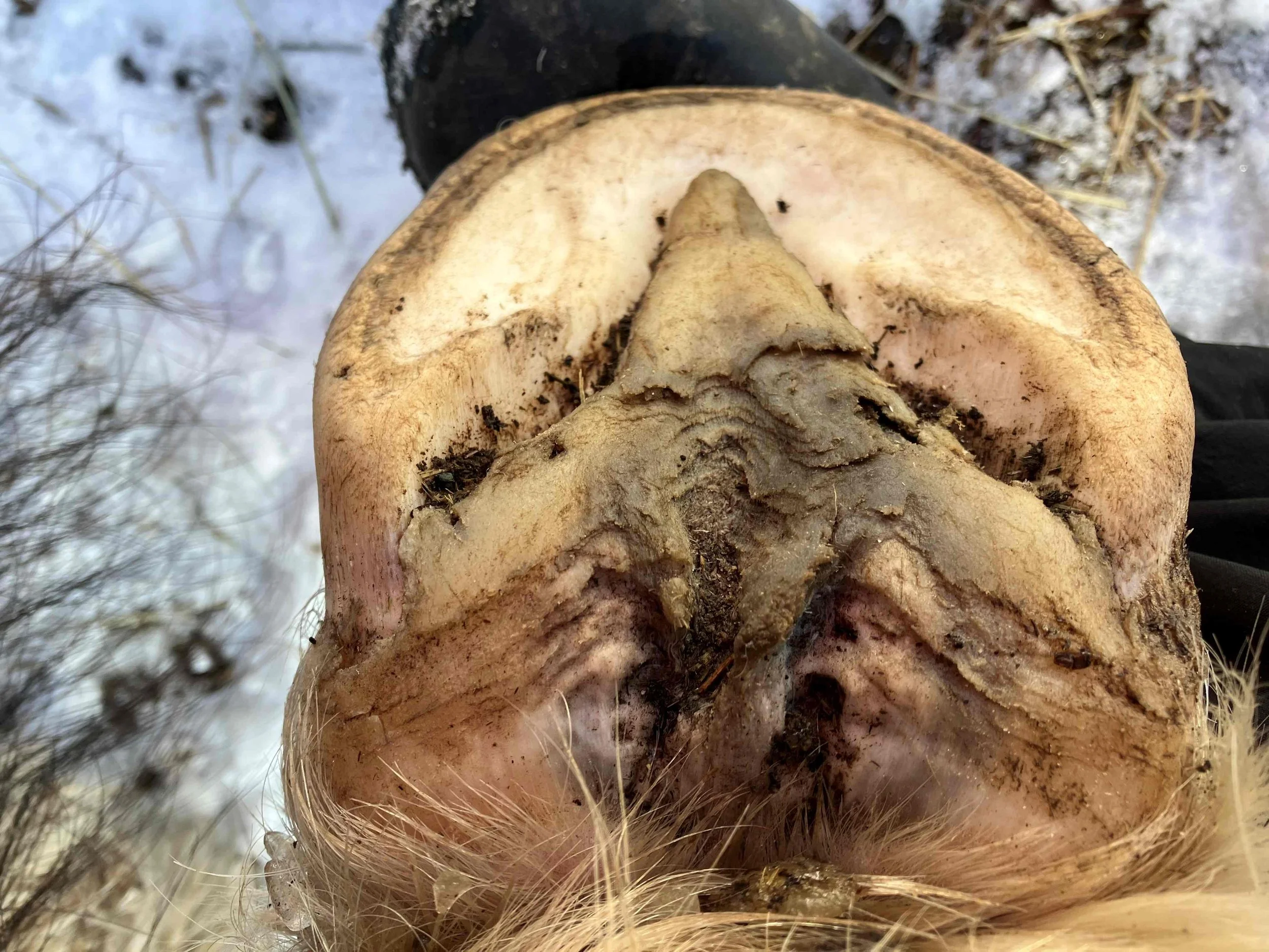 Right hind pre-trim February 2020 — medial bulb and frog are bruised; the bulbs are working on expanding; note the medio/lateral imbalance