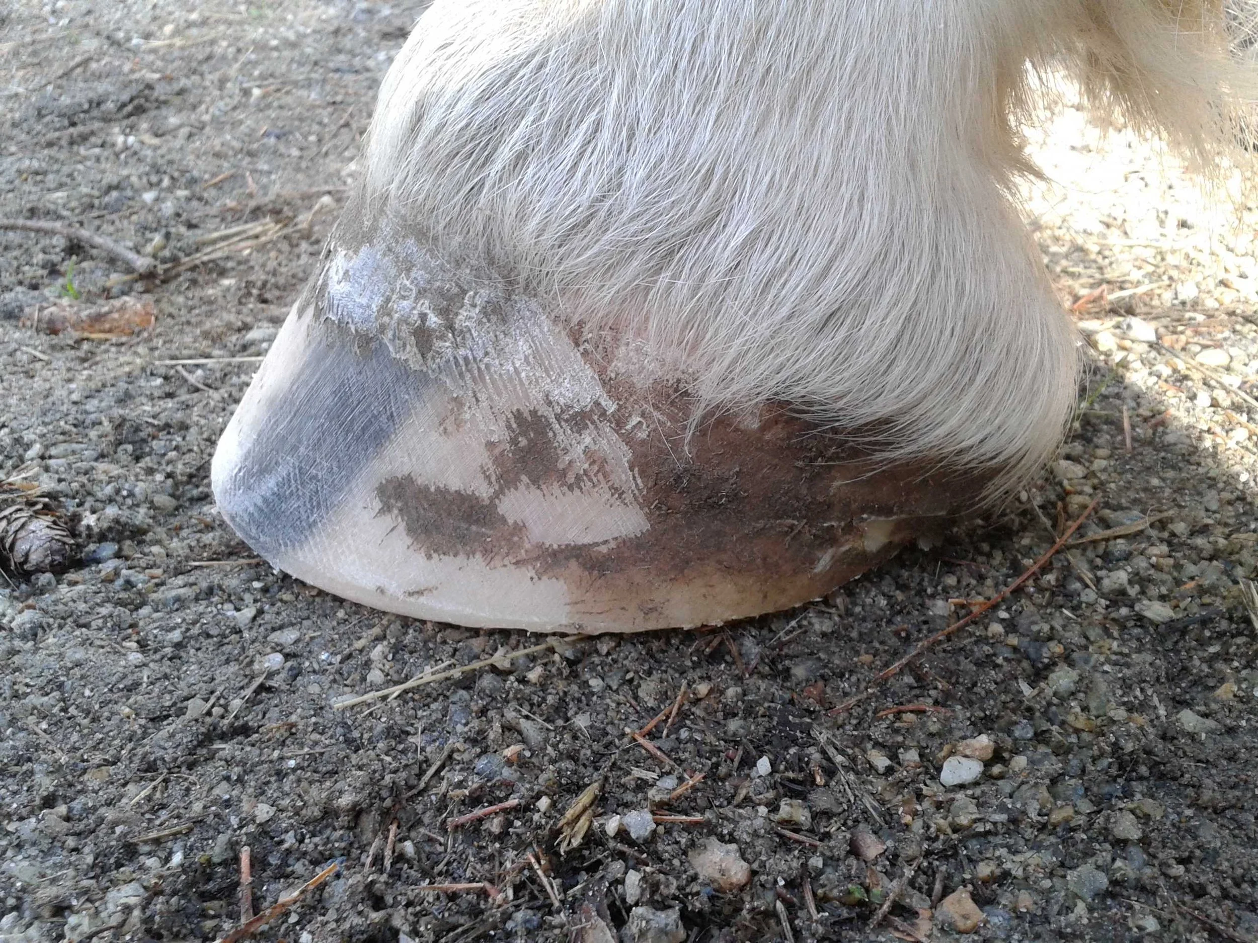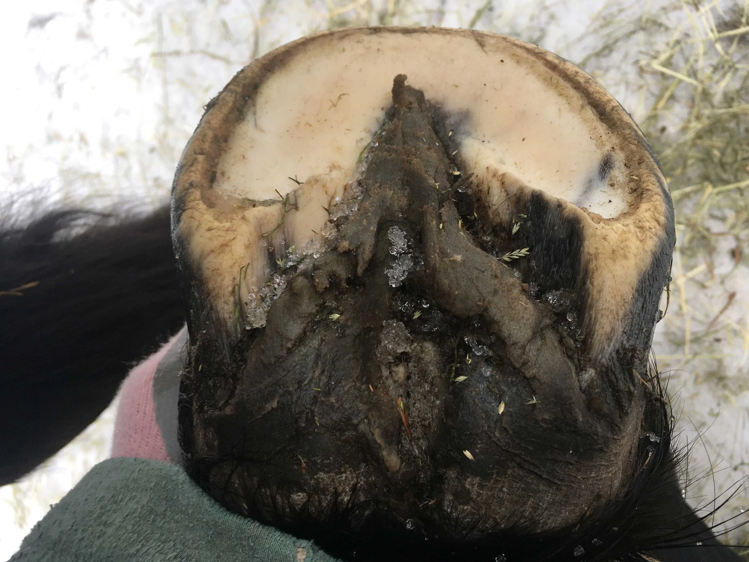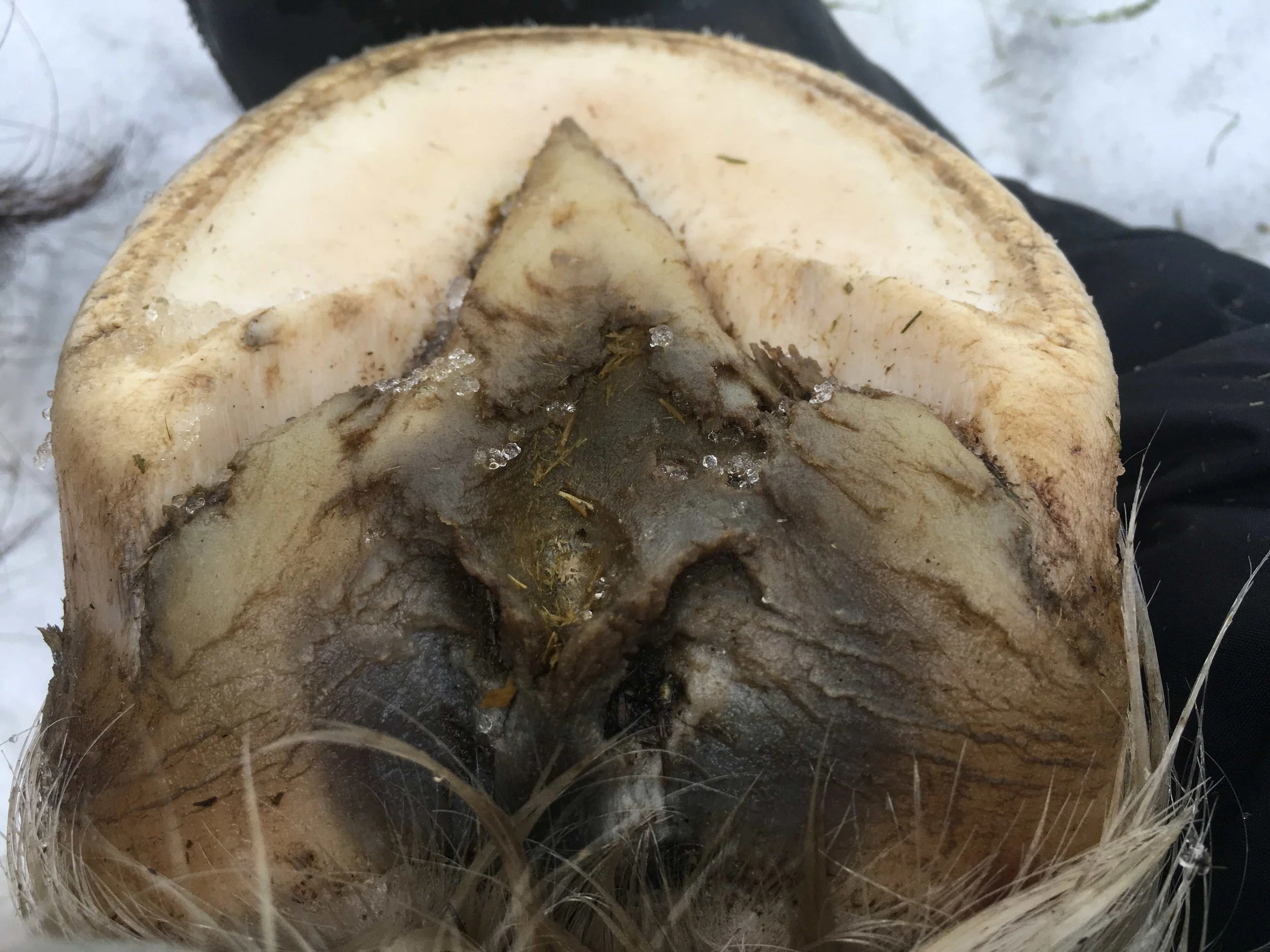 Left hind pre-trim January 2021 — frog and bulbs are still bruised in the middle; frog and bulbs are increasing in mass