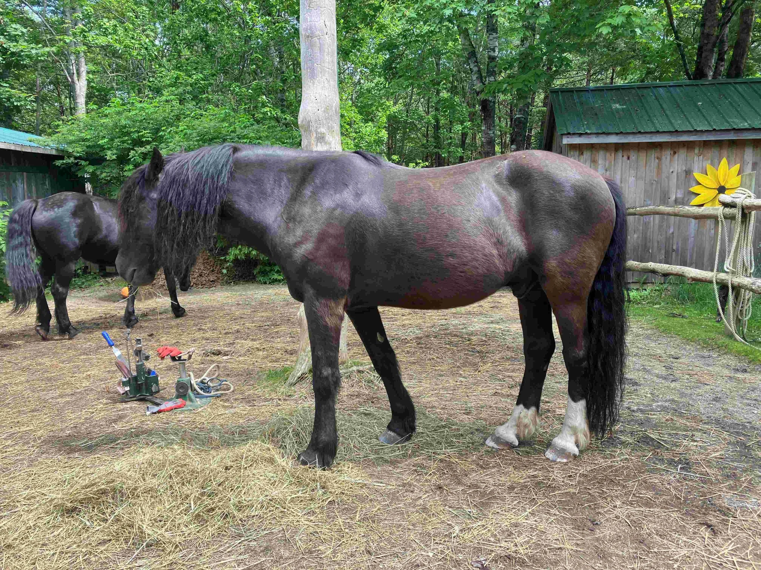 Scotia and his buddy Nolly live in a gorgeous paradise in the woods with a crusher dusted paddock. They enjoy 24/7 freedom. The horses are on hay only. There is no green grass in their lives, no commercially mixed feeds, no vaccinations or chemical de-wormers. They get their teeth checked annually. They are on a 12-week-trimming schedule since 2020 (6-week- schedule in previous years).