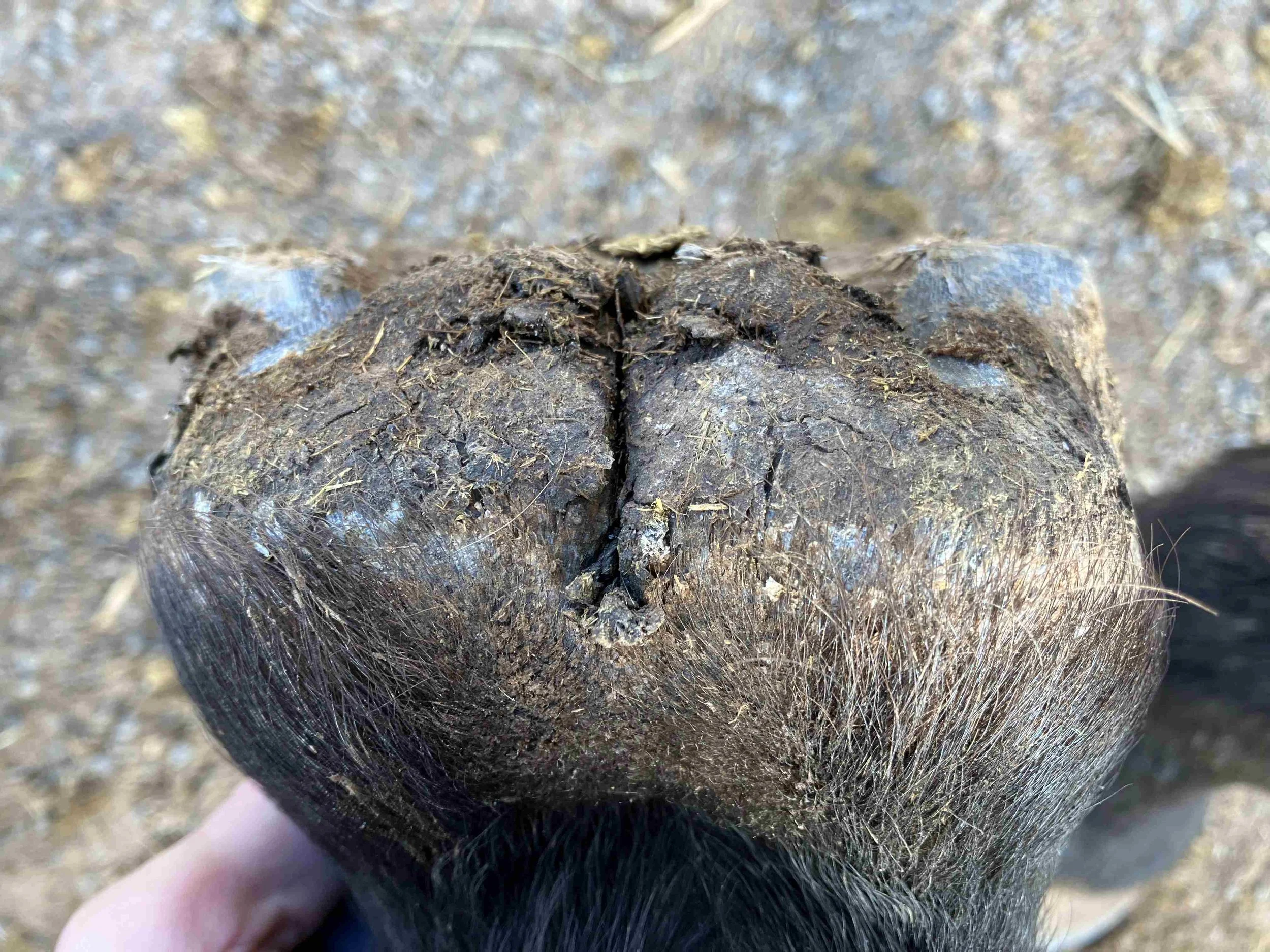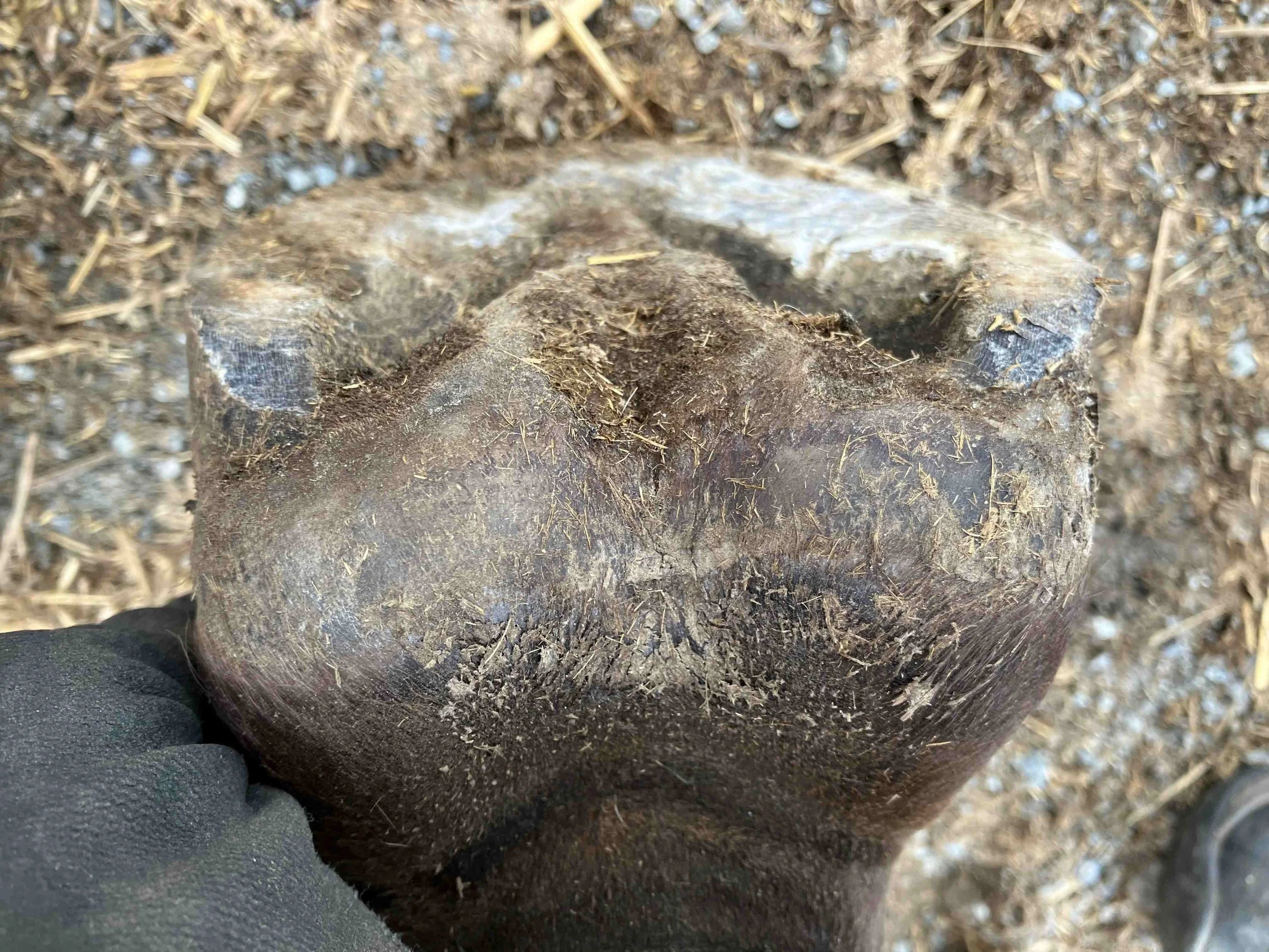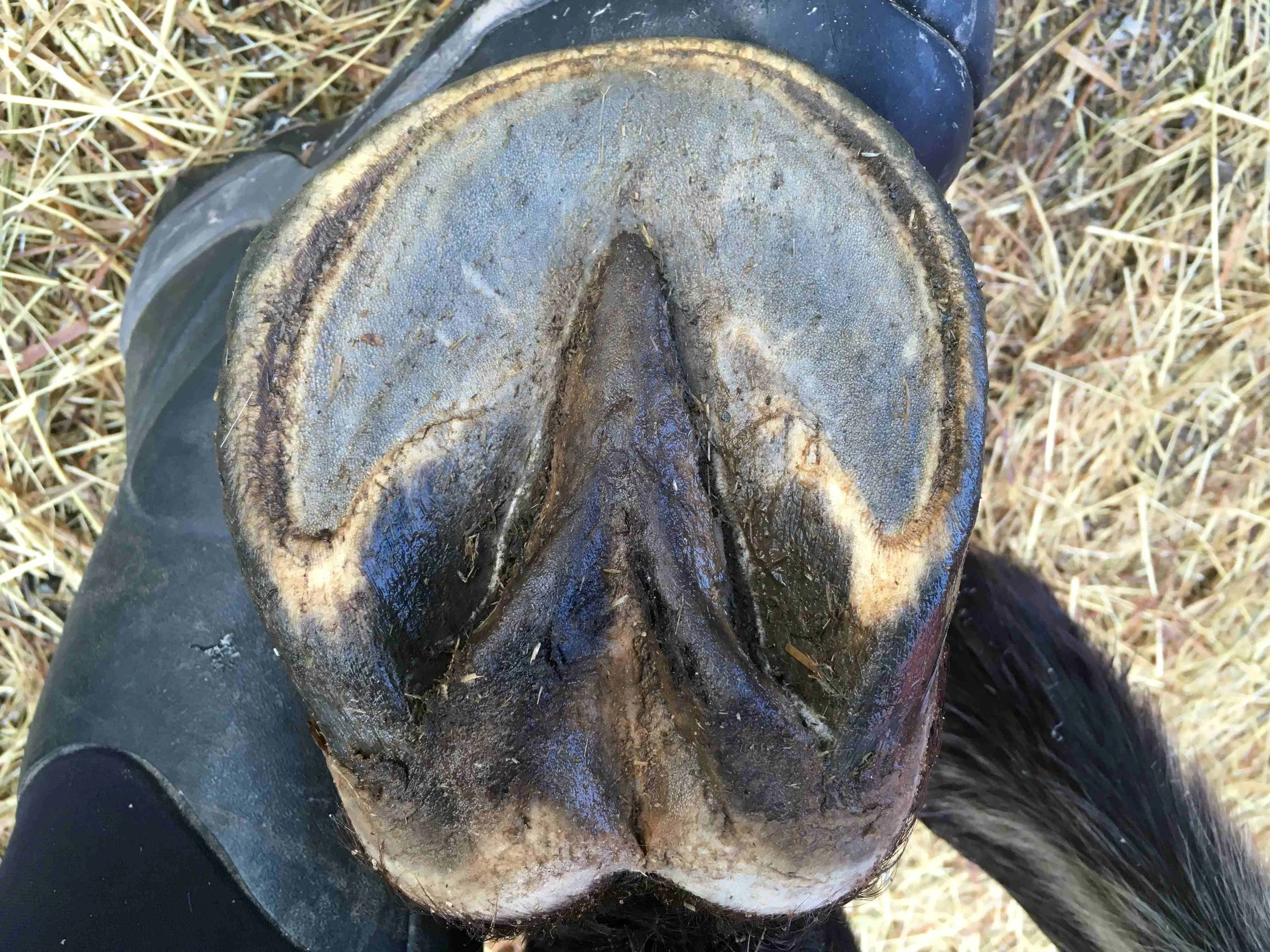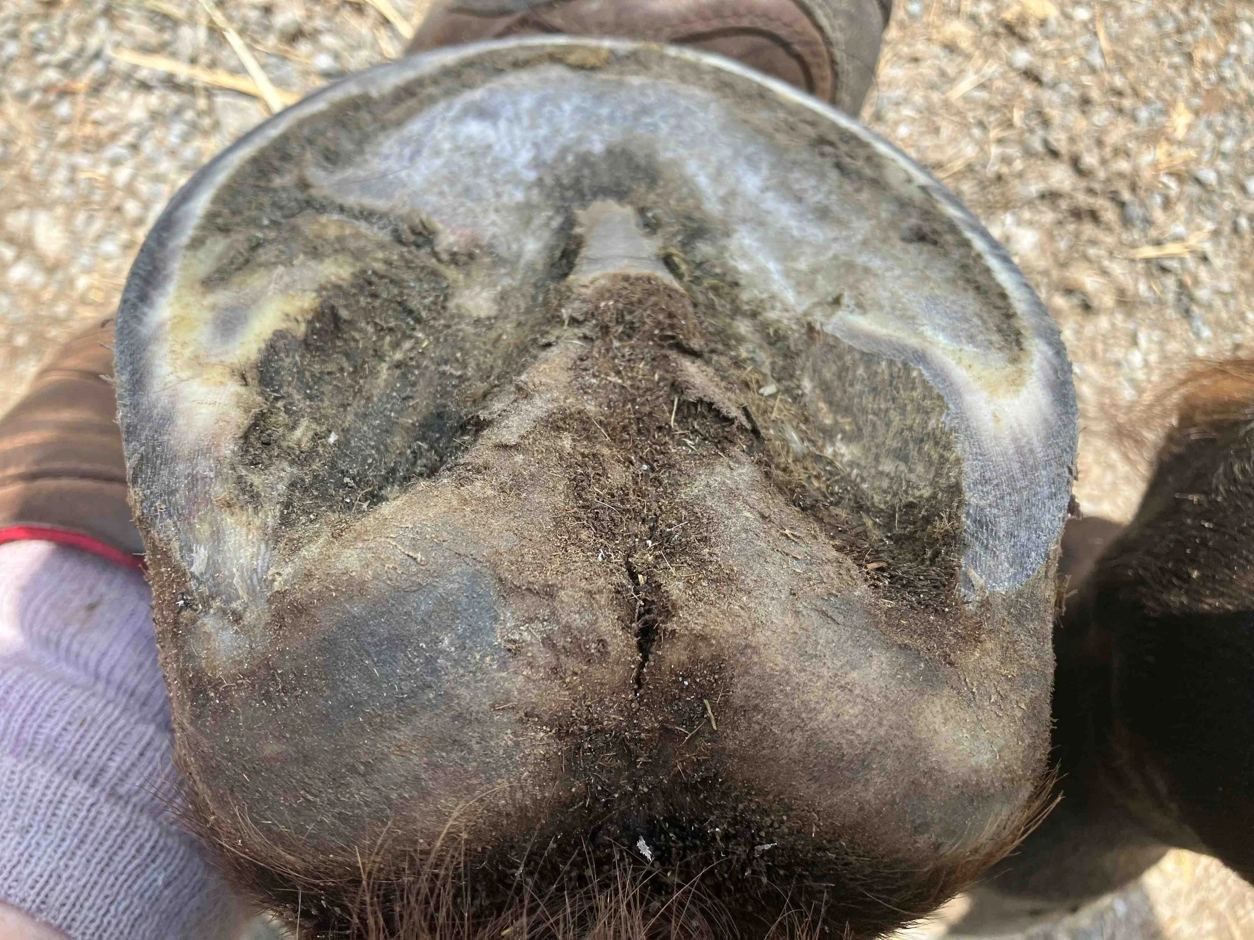 Right hind post-trim July 2024 — the lateral bar-heel triangle is repairing after an abscess; bulbs are further increasing in mass