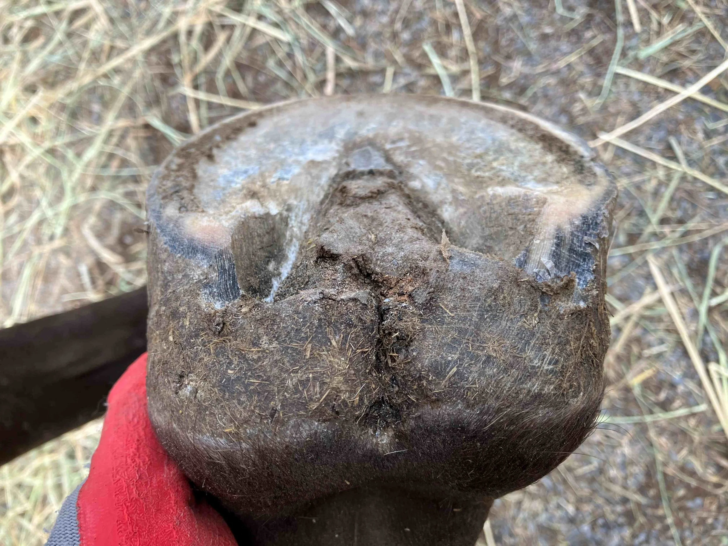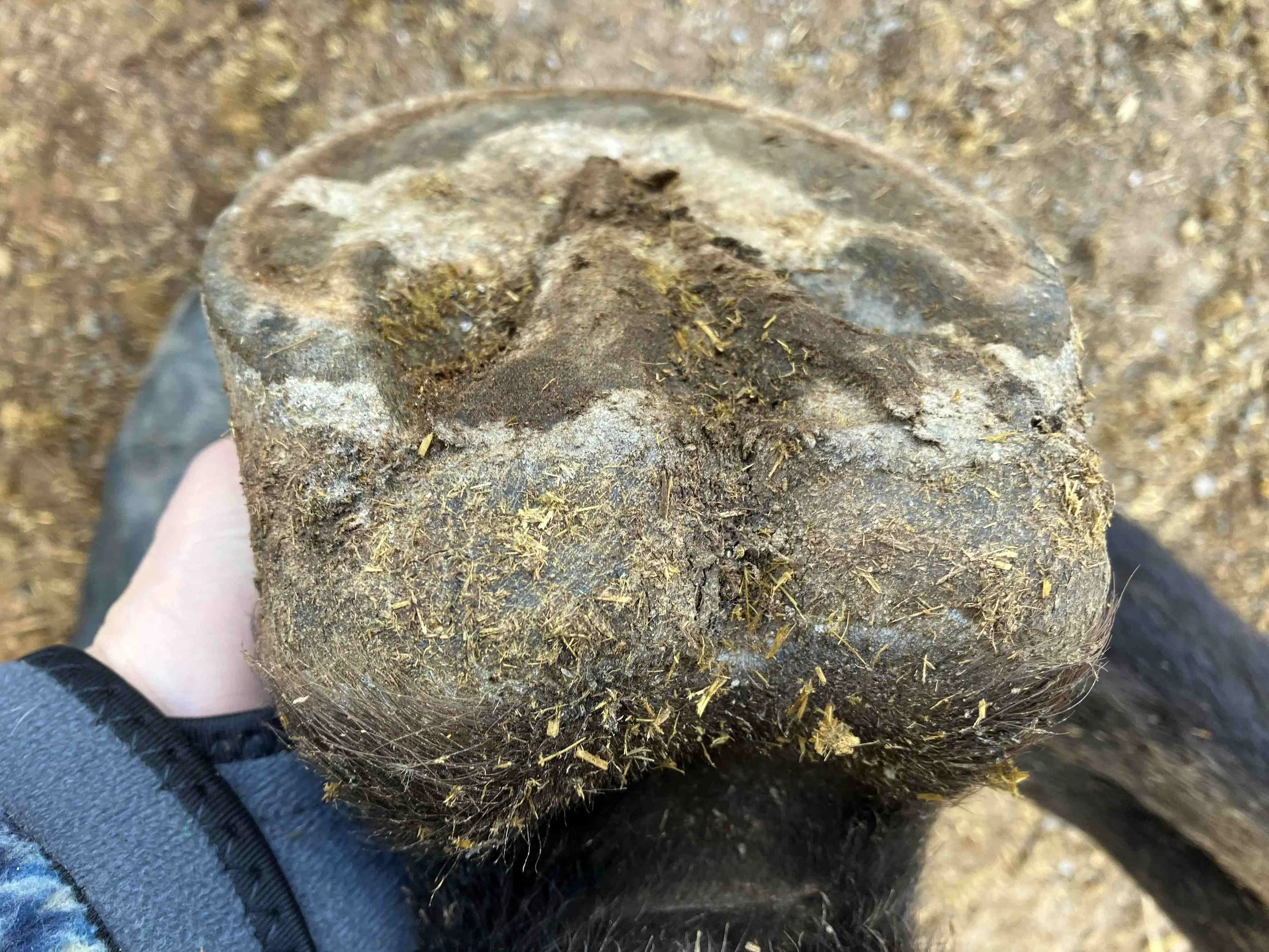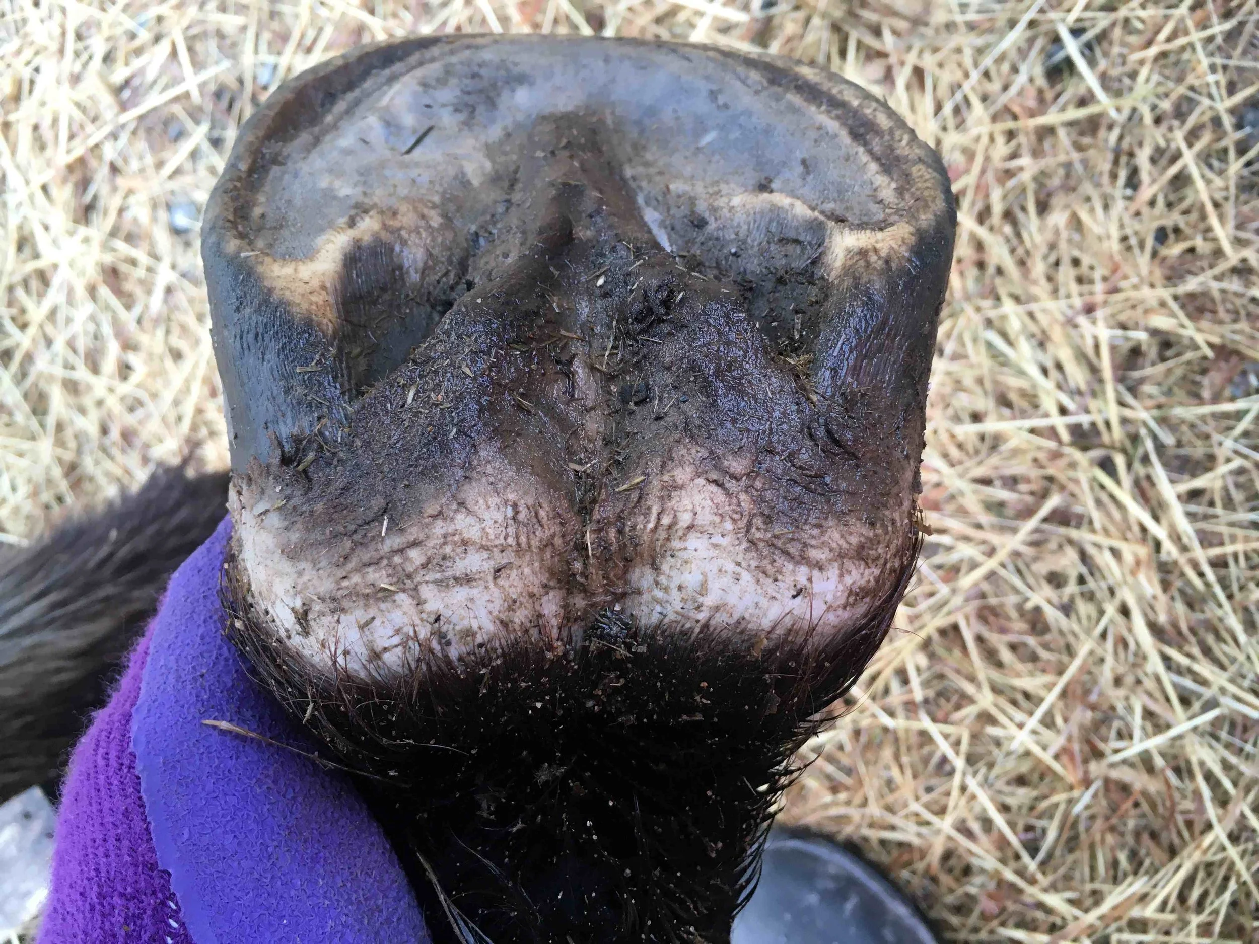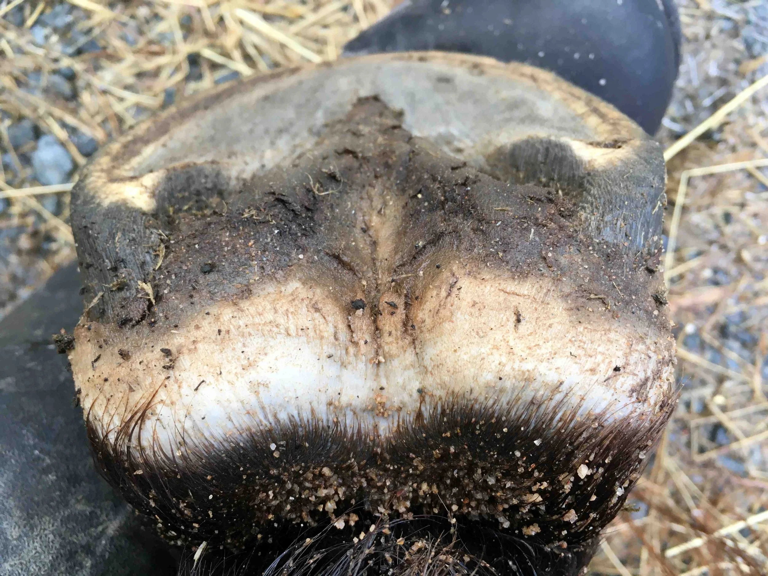 Right hind post-trim July 2024 — the lateral bar-heel triangle is repairing after an abscess; bulbs are further increasing in mass