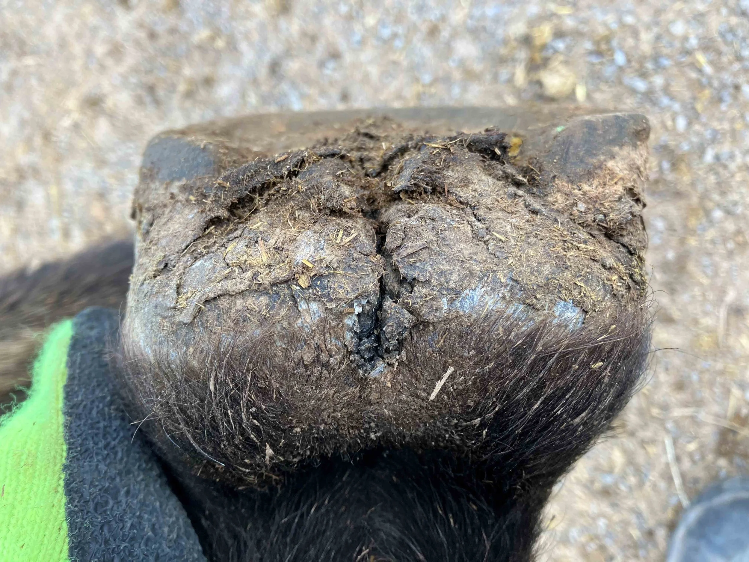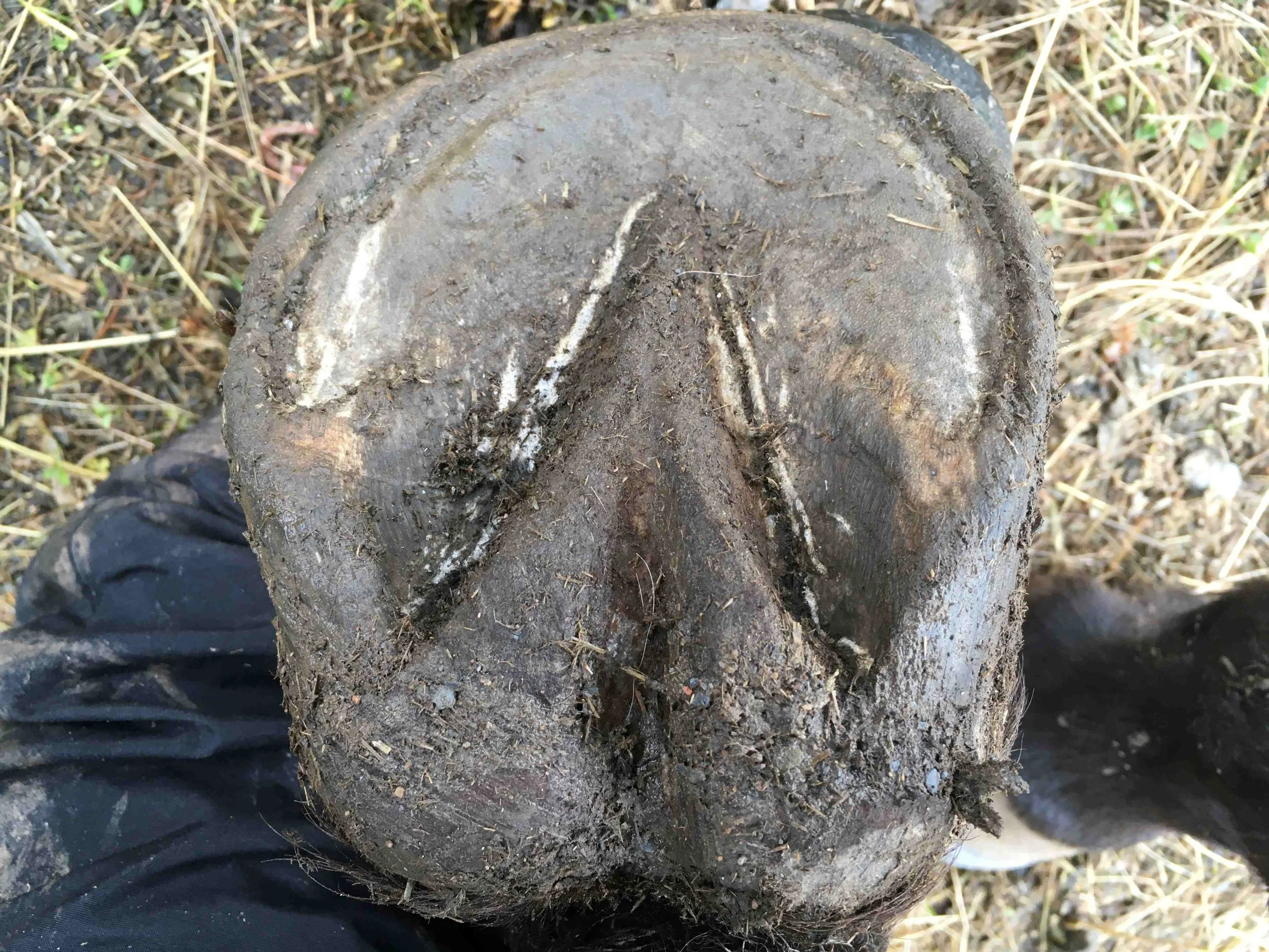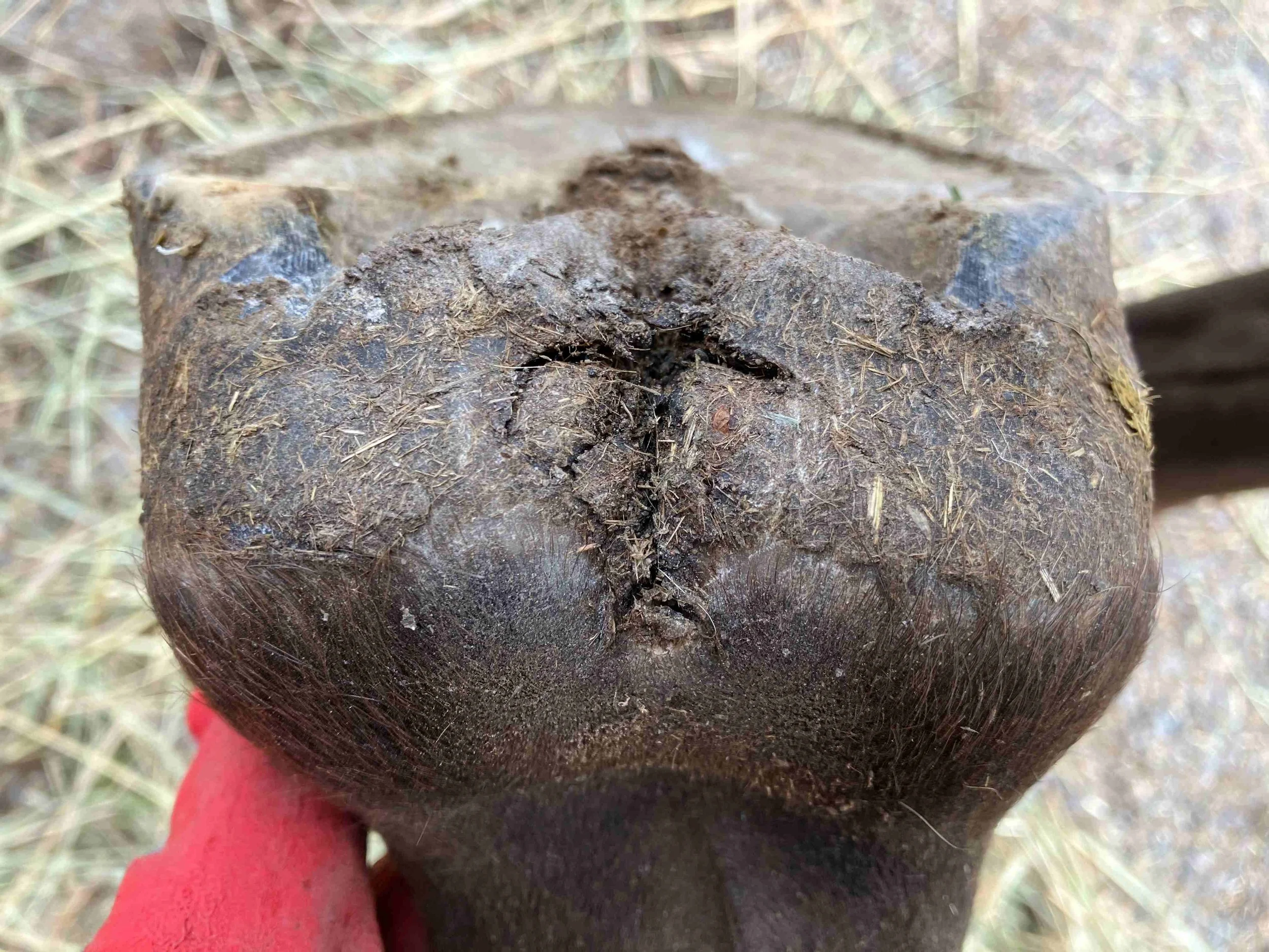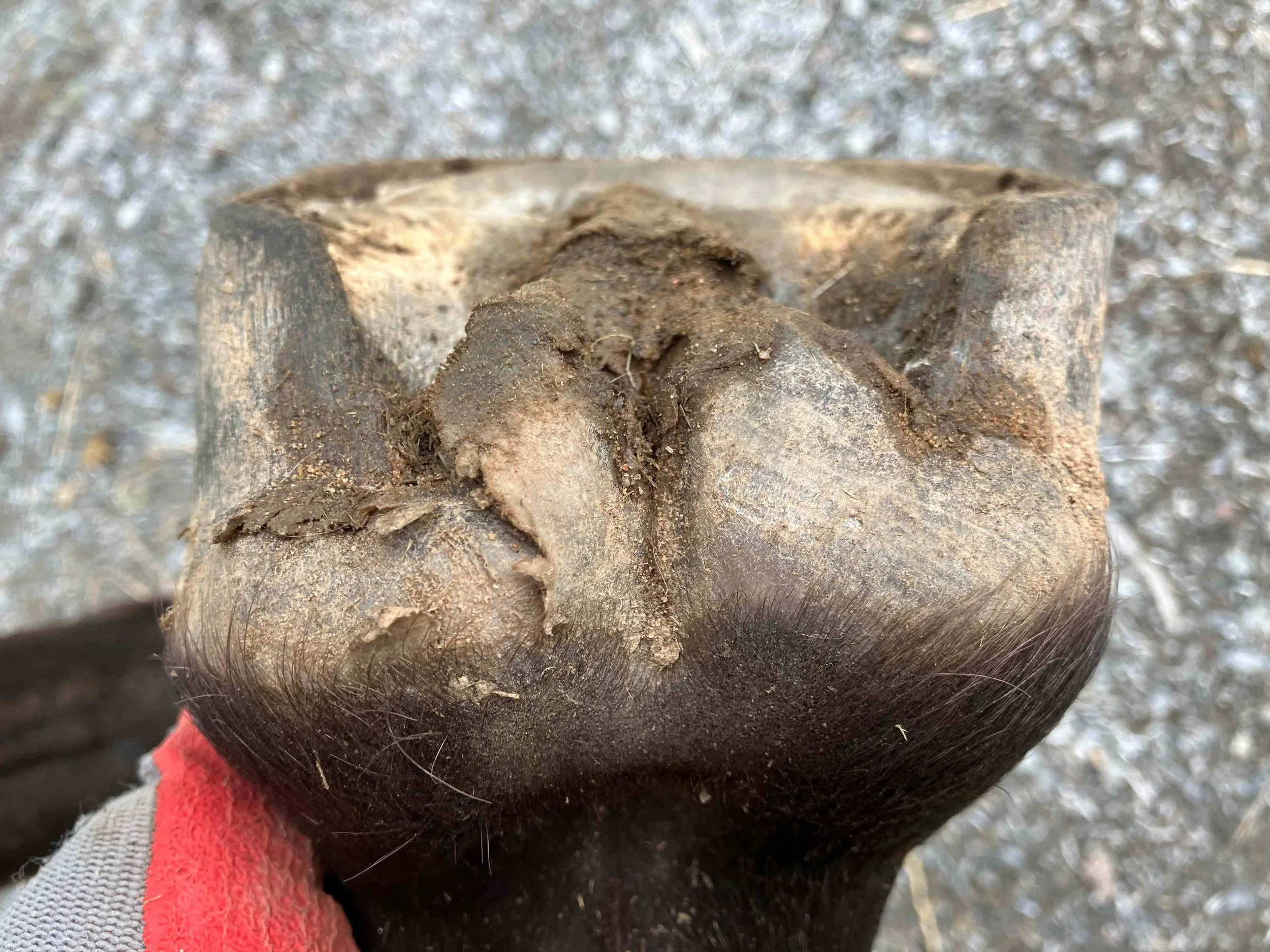 Right hind post-trim July 2024 — the lateral bar-heel triangle is repairing after an abscess; bulbs are further increasing in mass