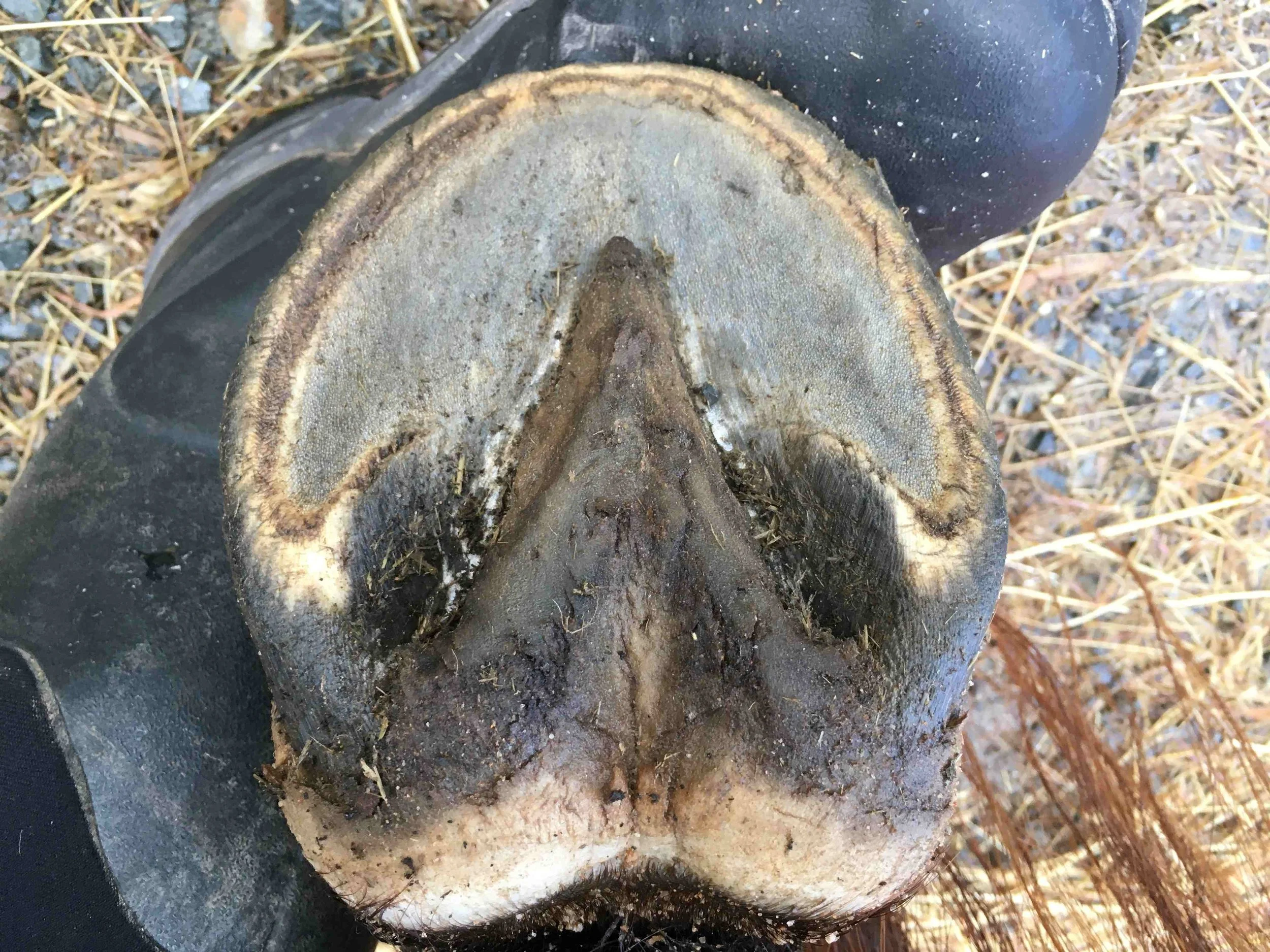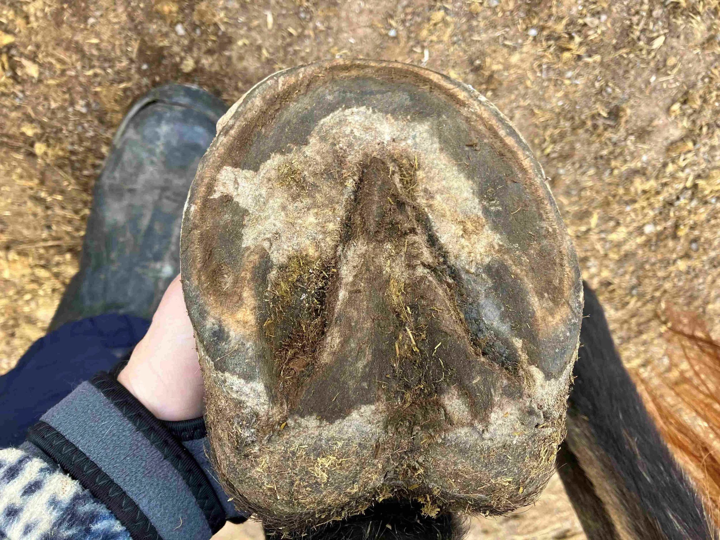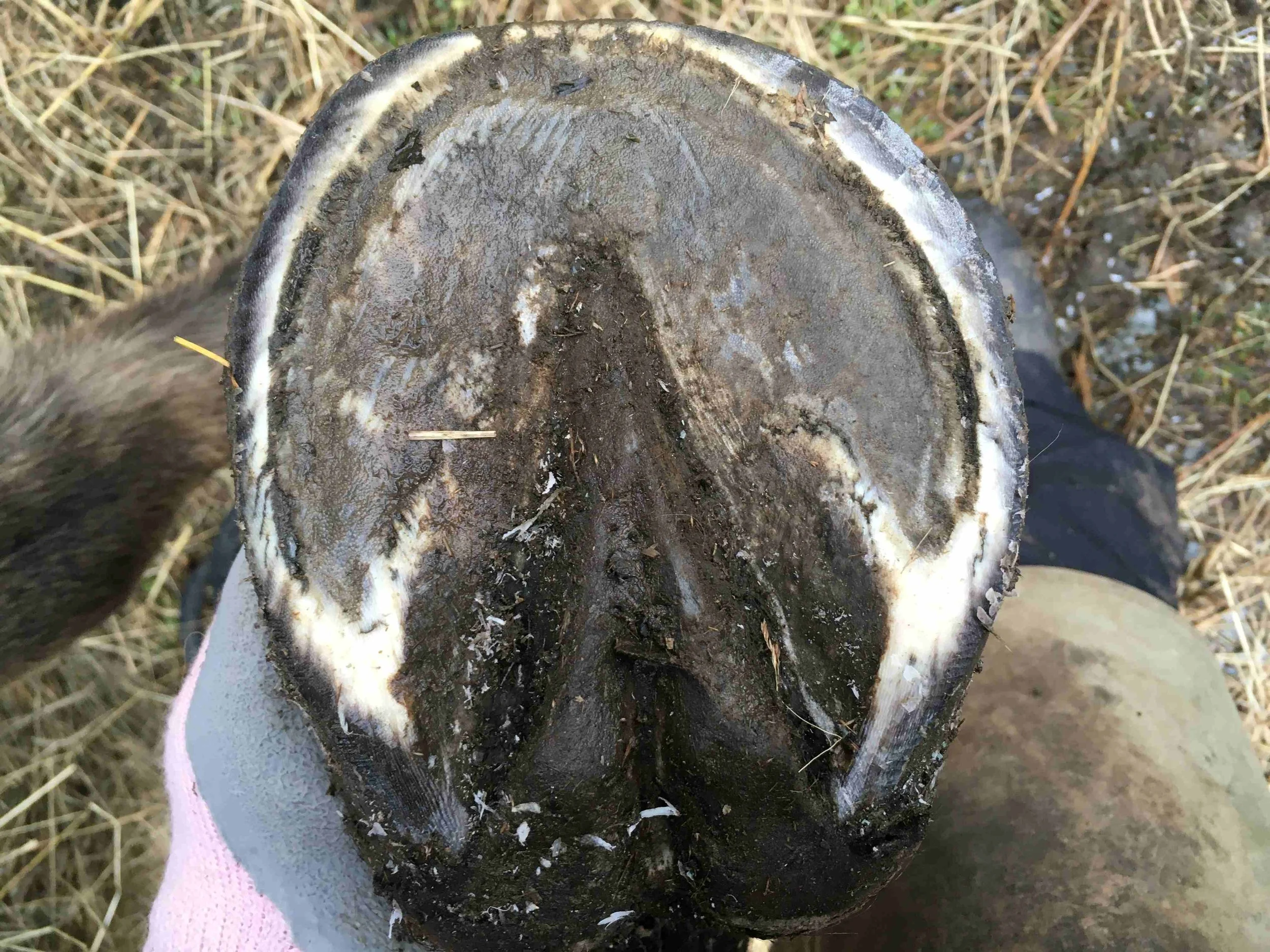 Left hind mid-trim August 2024 — the coffin bone is in a healthier position due to the increase of internal structures; I can remove some more sole horn around the tip of the frog
