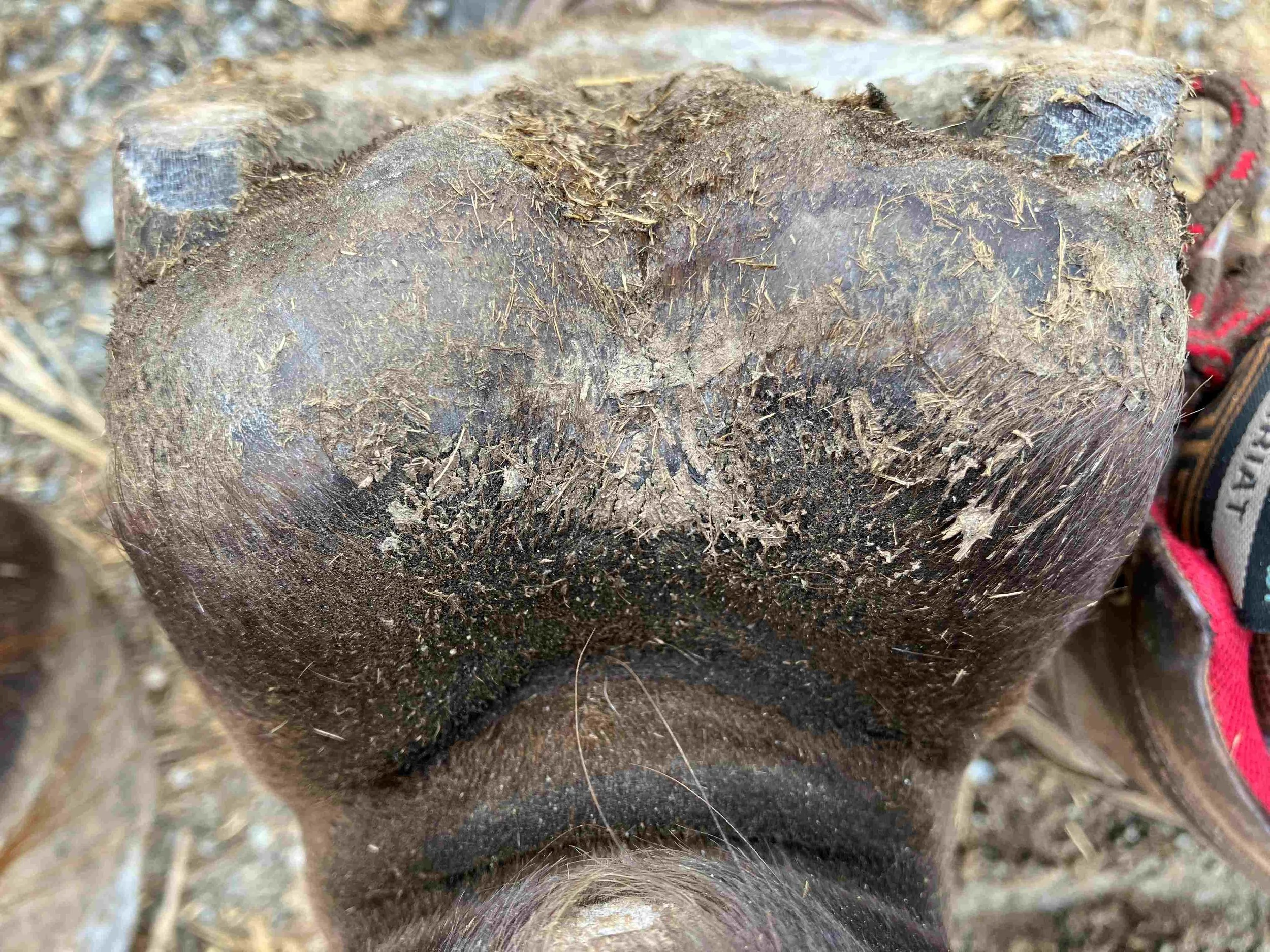Left hind October 2024 — bruising is fading away; looking closely we can see some purple = a surgeon once explained to me that, when bruised blood vessels heal, the colour goes from dark blue/grey, over purple, pink and then into white. Remember: every horn tubule is equipped with it’s own blood vessel.