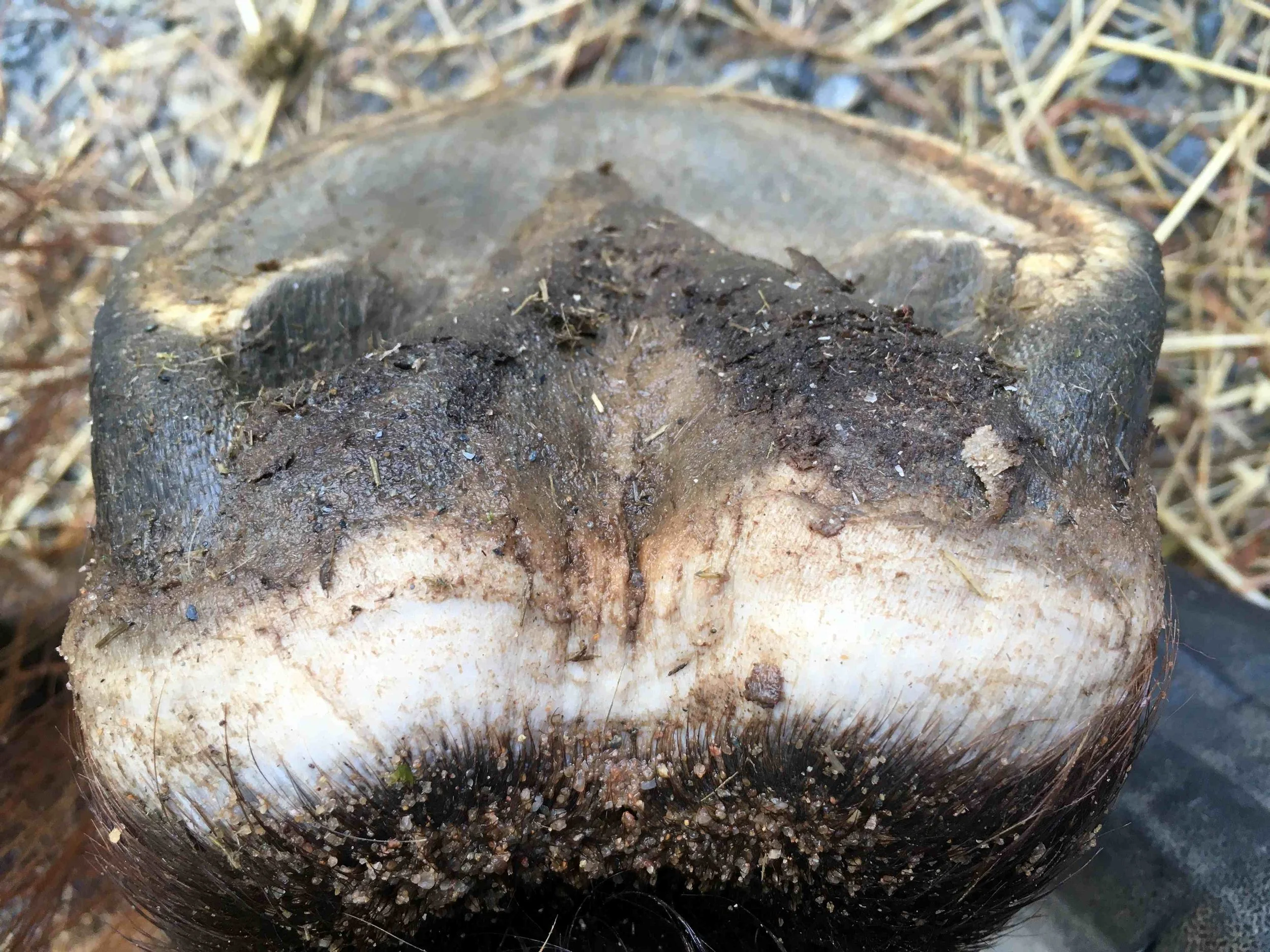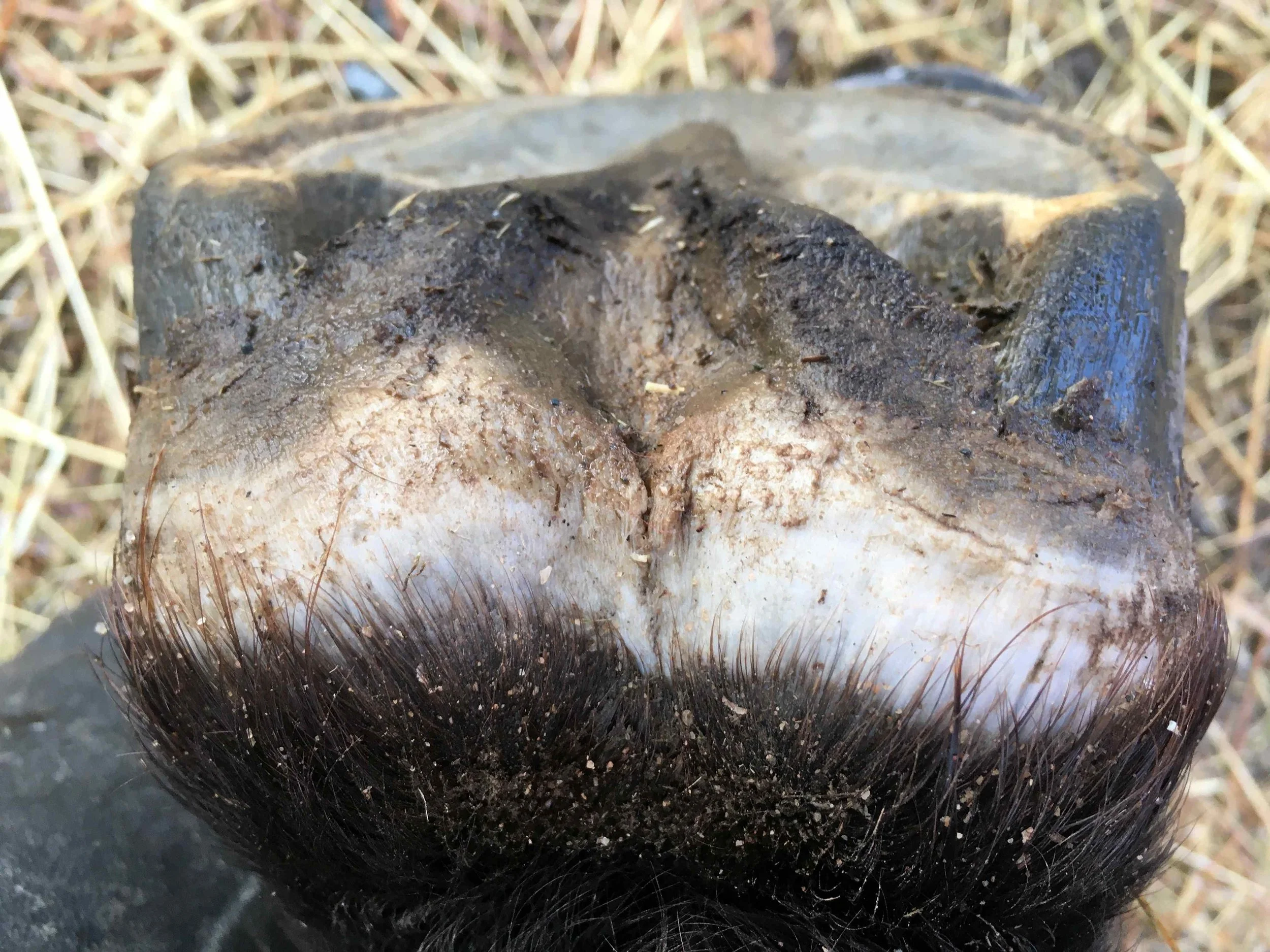 Right hind pre-trim January 2021 — the heel bulbs are atrophied = white skin