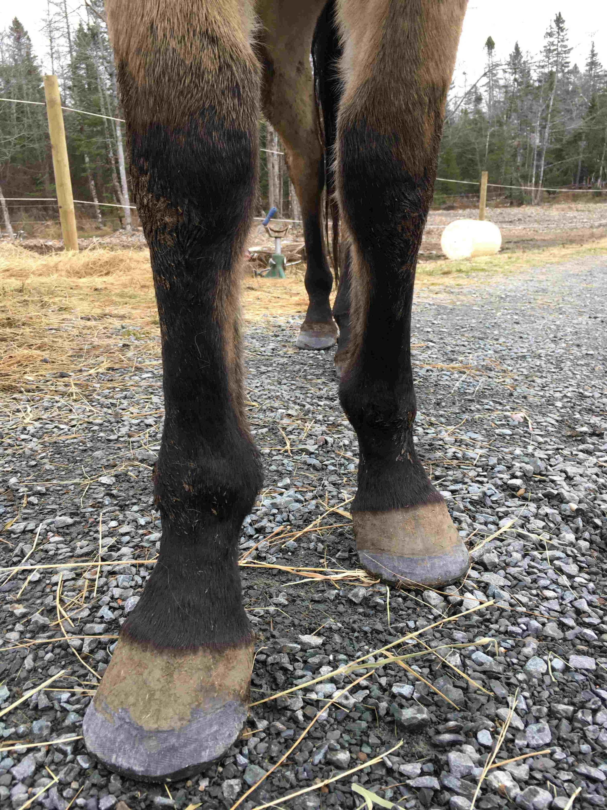 Notes from my first assessment: wearing down toe walls in both fronts; “paddling” over the toe with both fronts; camping out with the hinds and standing on his tiptoes (wearing down his toe walls as well); hind hooves deformed; weak fetlocks; distorted pasterns; atrophy of the back of the hooves; atrophied bulb corium (white skin); bruised soles; bruised outer outside walls (blue does not exist as a hoof colour; blue is bruising); oversized chest muscles; weak croup; tight behind the shoulder blades; tension in the tail bone (reflecting in the poor quality of his tail hair).