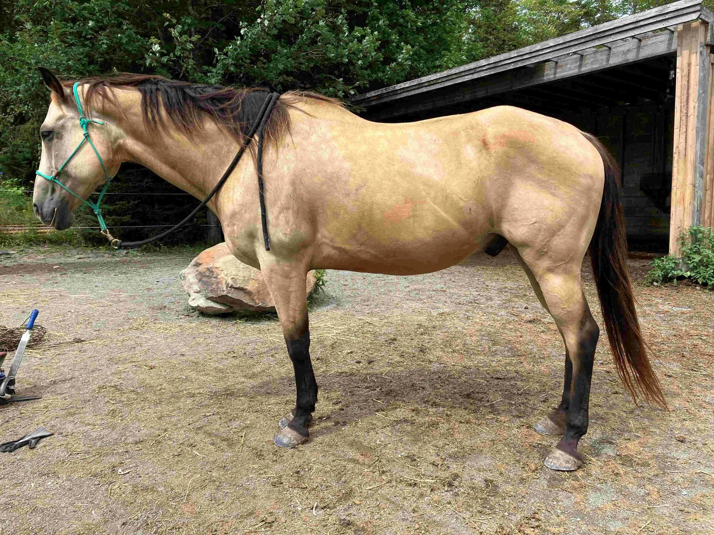 The Quarter Horse gelding clearly expressed that something was profoundly wrong with him at the age of five. He started bucking and frankly scared his owner. Eventually he was taken out of training and riding. I met and started trimming him at the age of ten in December 2020.