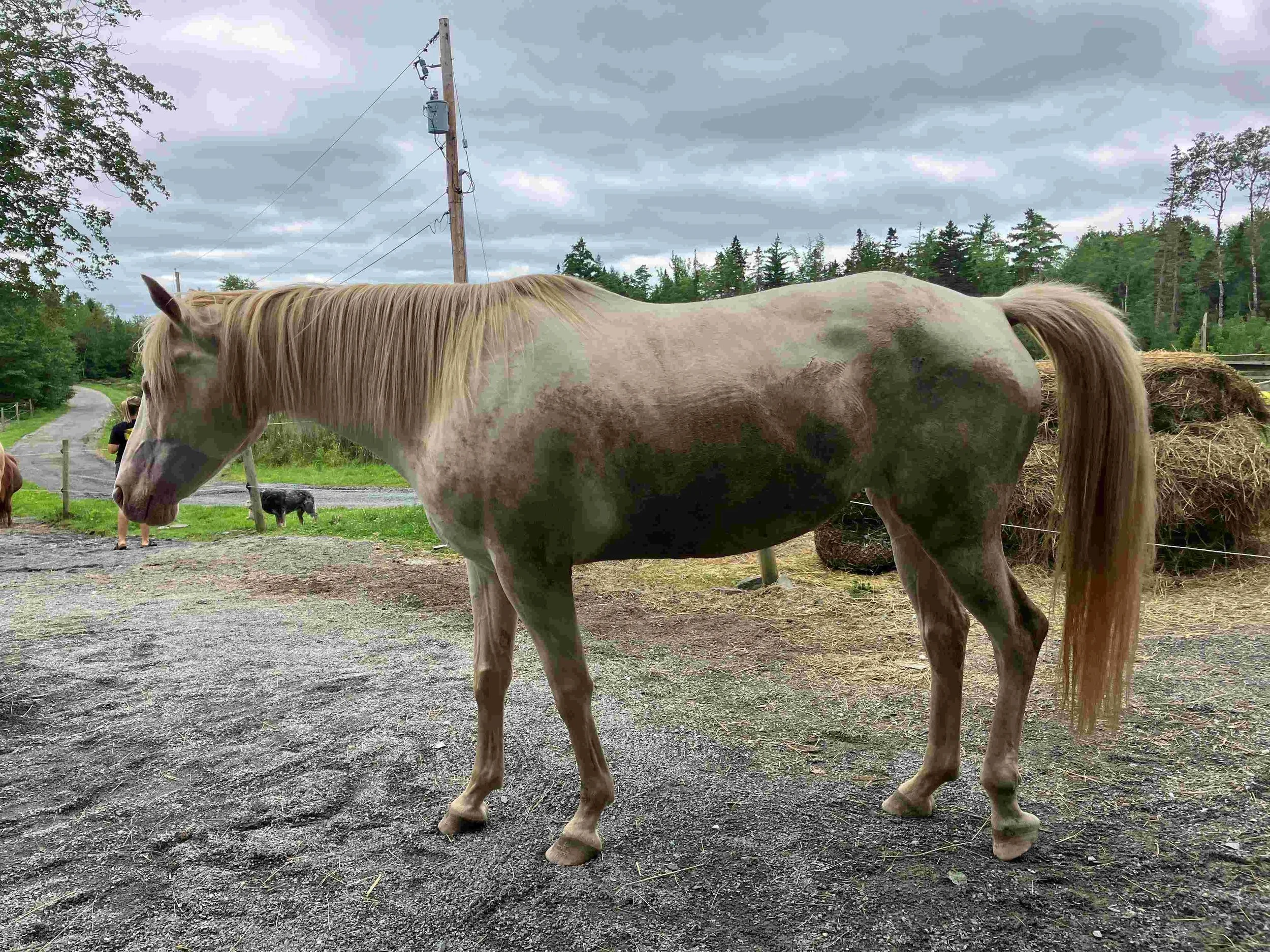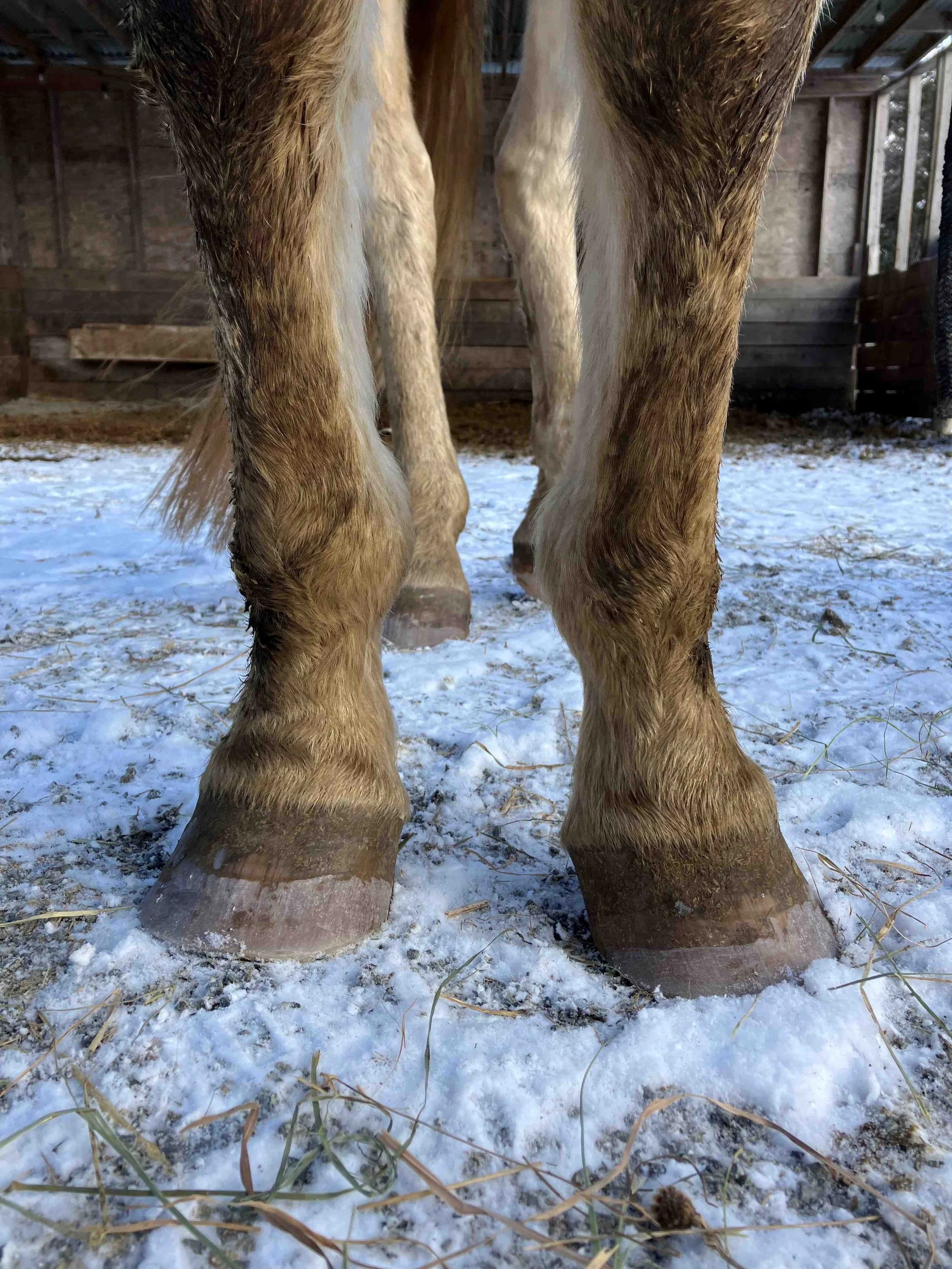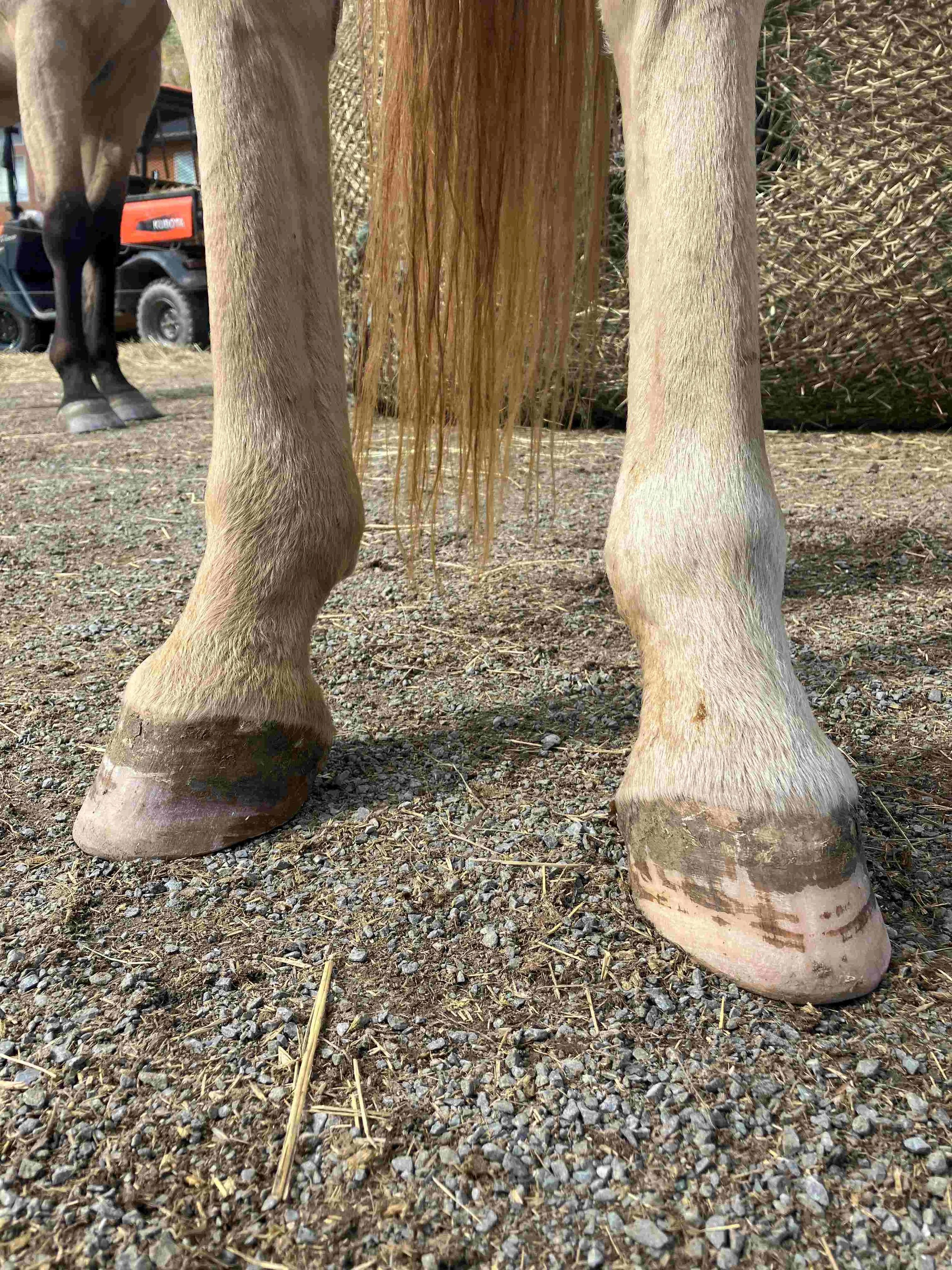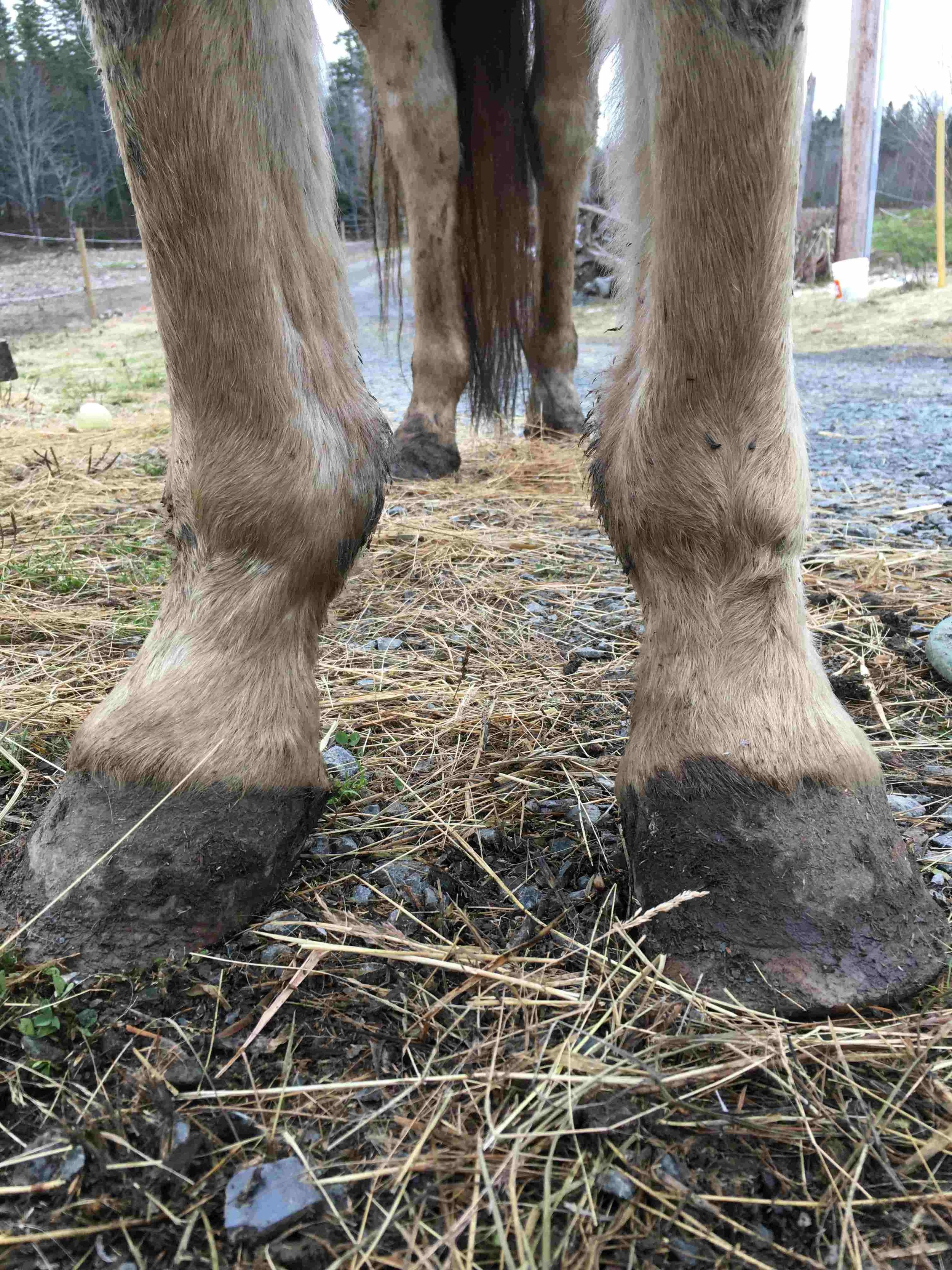 December 2020 — the hooves are not supporting the bone column of the legs; she is placing the right hind under the body, counter balancing with the left front; the pasterns in the front are still straight (like they are when a foal is born)