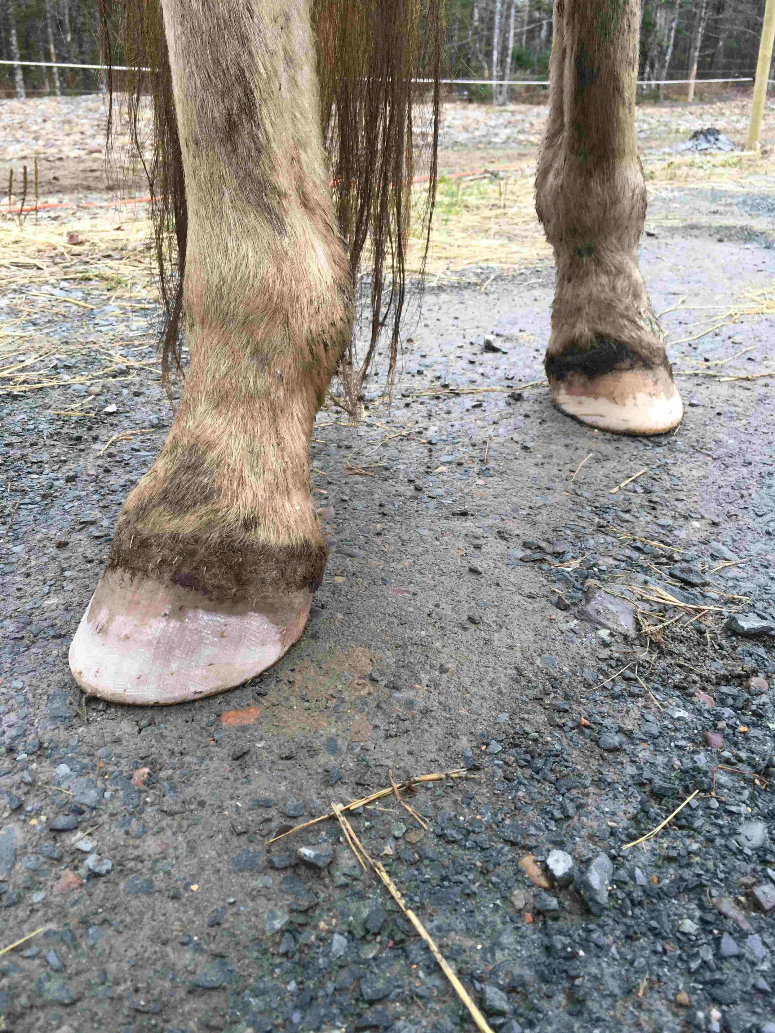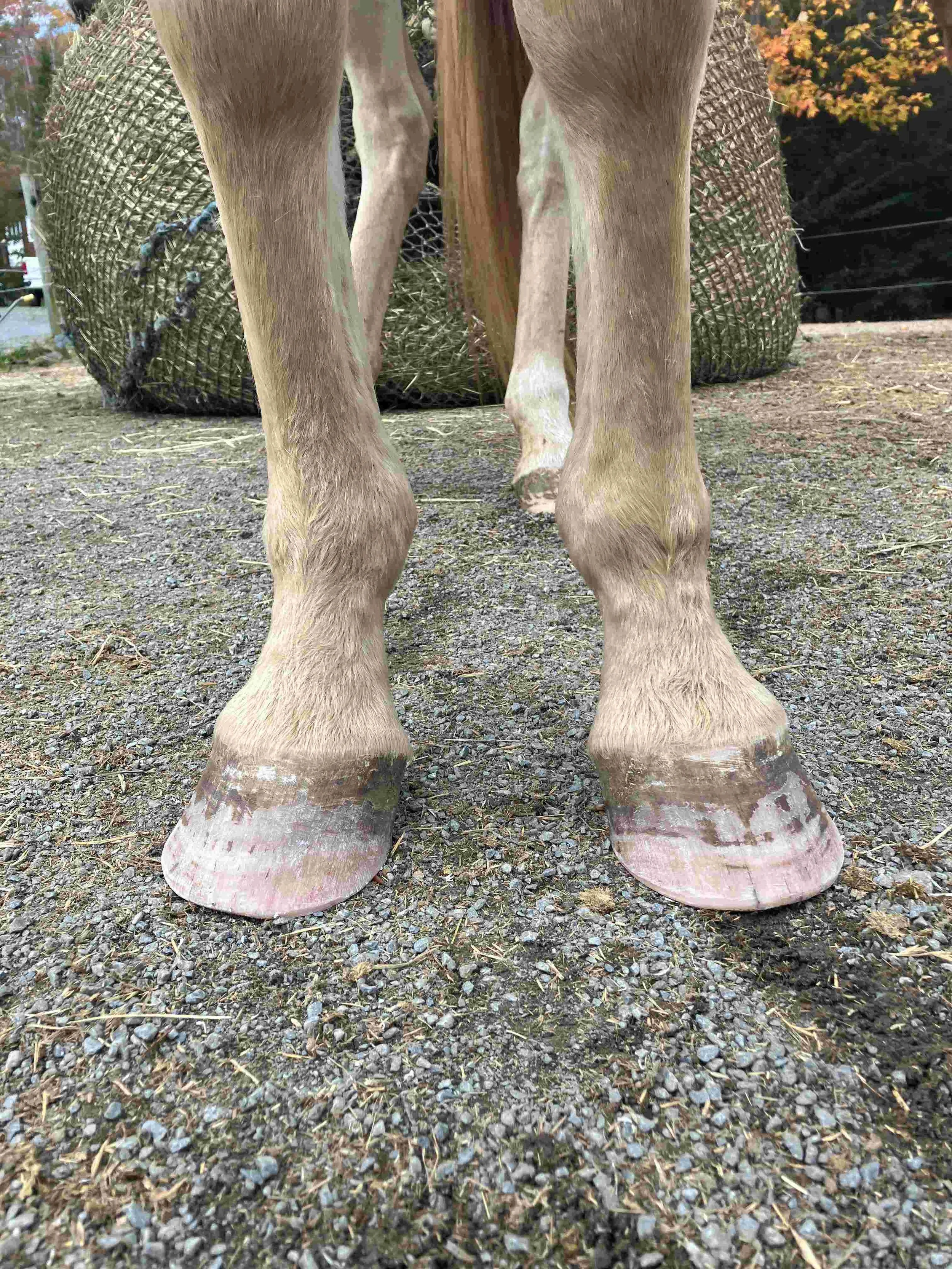 Notes from my first assessment: hooves not supporting the bone column; hooves turned out (more severe with the right front and the right hind and placing the right hind under the belly); atrophy of the back of the feet; atrophy of the white line; distortion in the outer outside wall; stress cracks in the wall from leaning on one side of the hoof capsule and from imbalance; difficulties to pick up hooves and stand for trimming; weak hind end; weak fetlock joints in all four (more severe in the hinds); distorted pasterns; muscle tension; bruised outer outside walls in the fronts (blue does not exist as a hoof colour; blue is bruising).