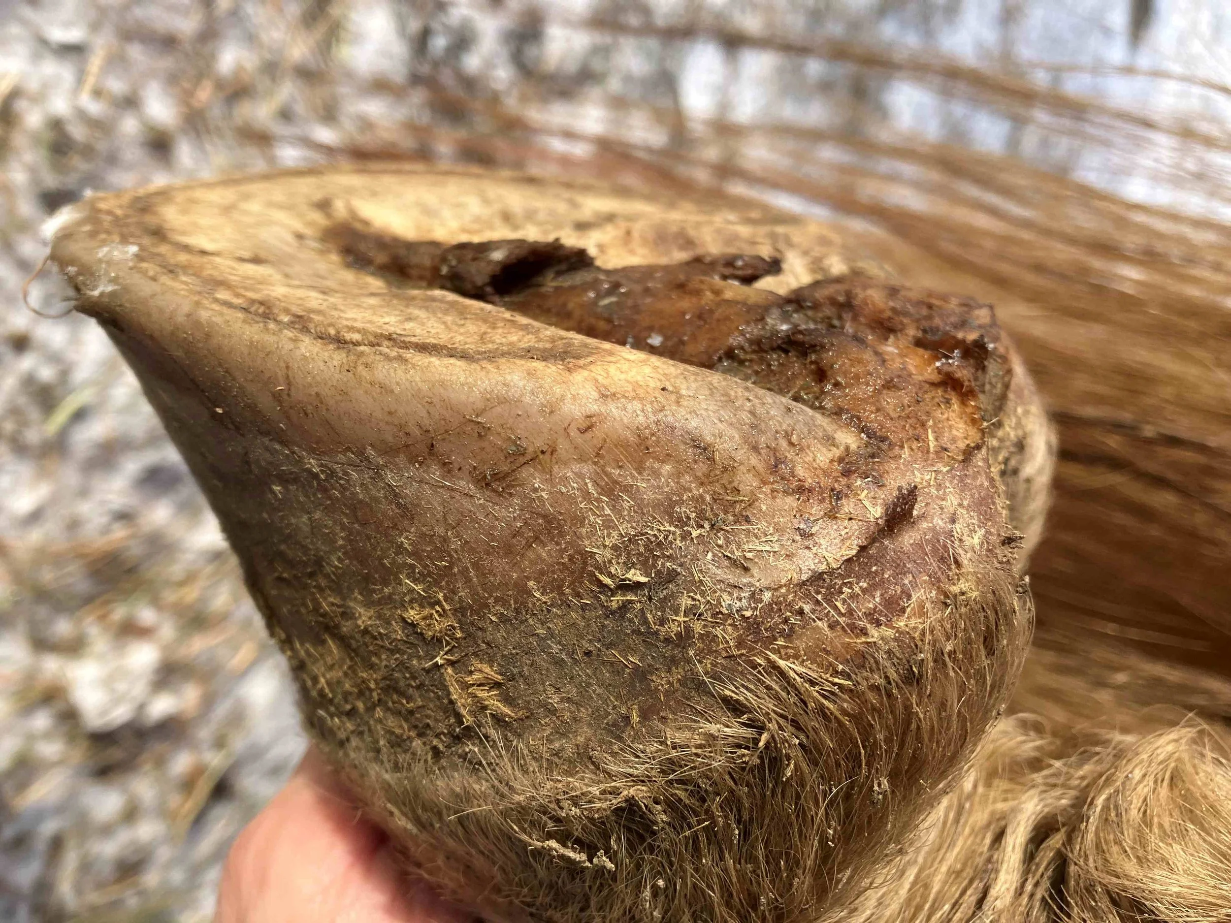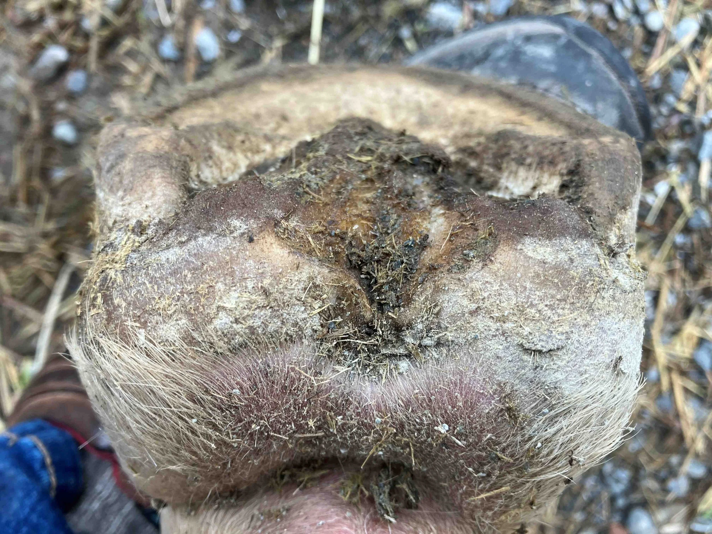 Right hind pre-trim August 2023 — six weeks after the last trim