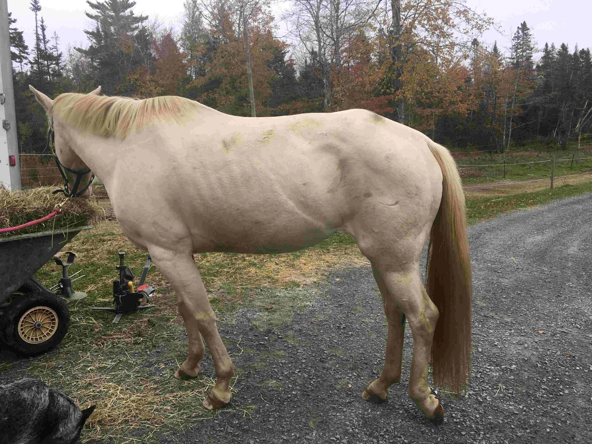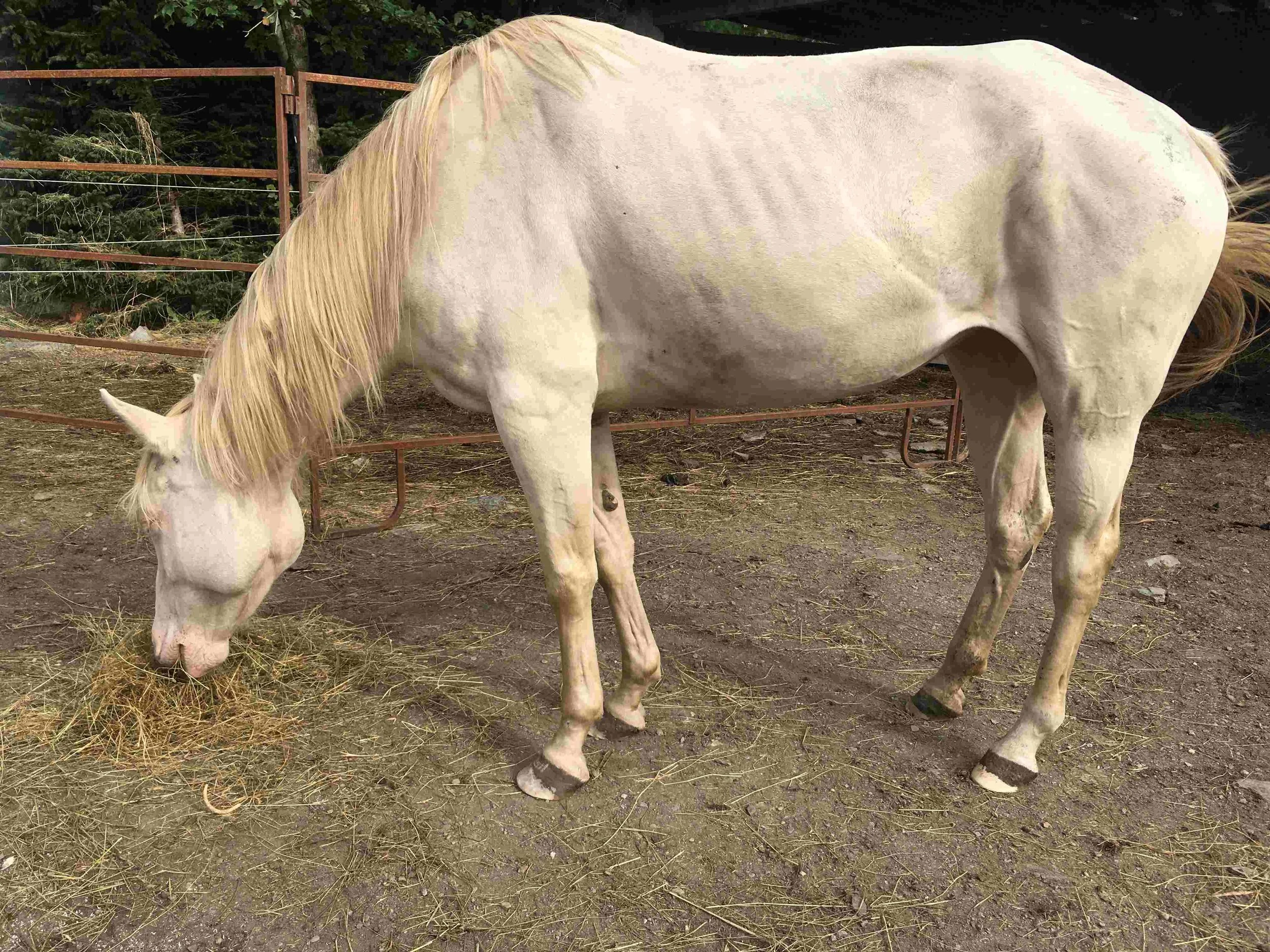 In the first year, after I met her, the mare lost a lot of body mass. It looked like her body was literally folding together (like a pocket knife). She had massage therapy but it took a while for her to fill out again. Unfortunately, lack of movement and standing around a feeder over the winter interfered with the healing.
