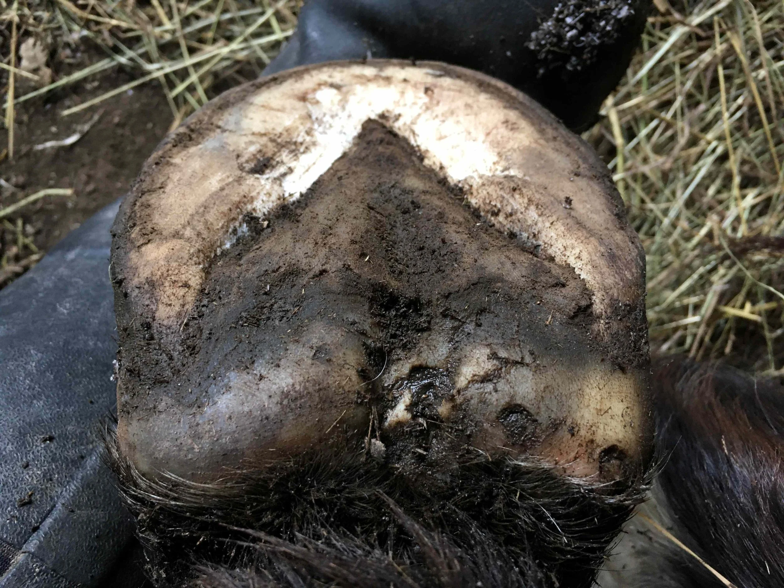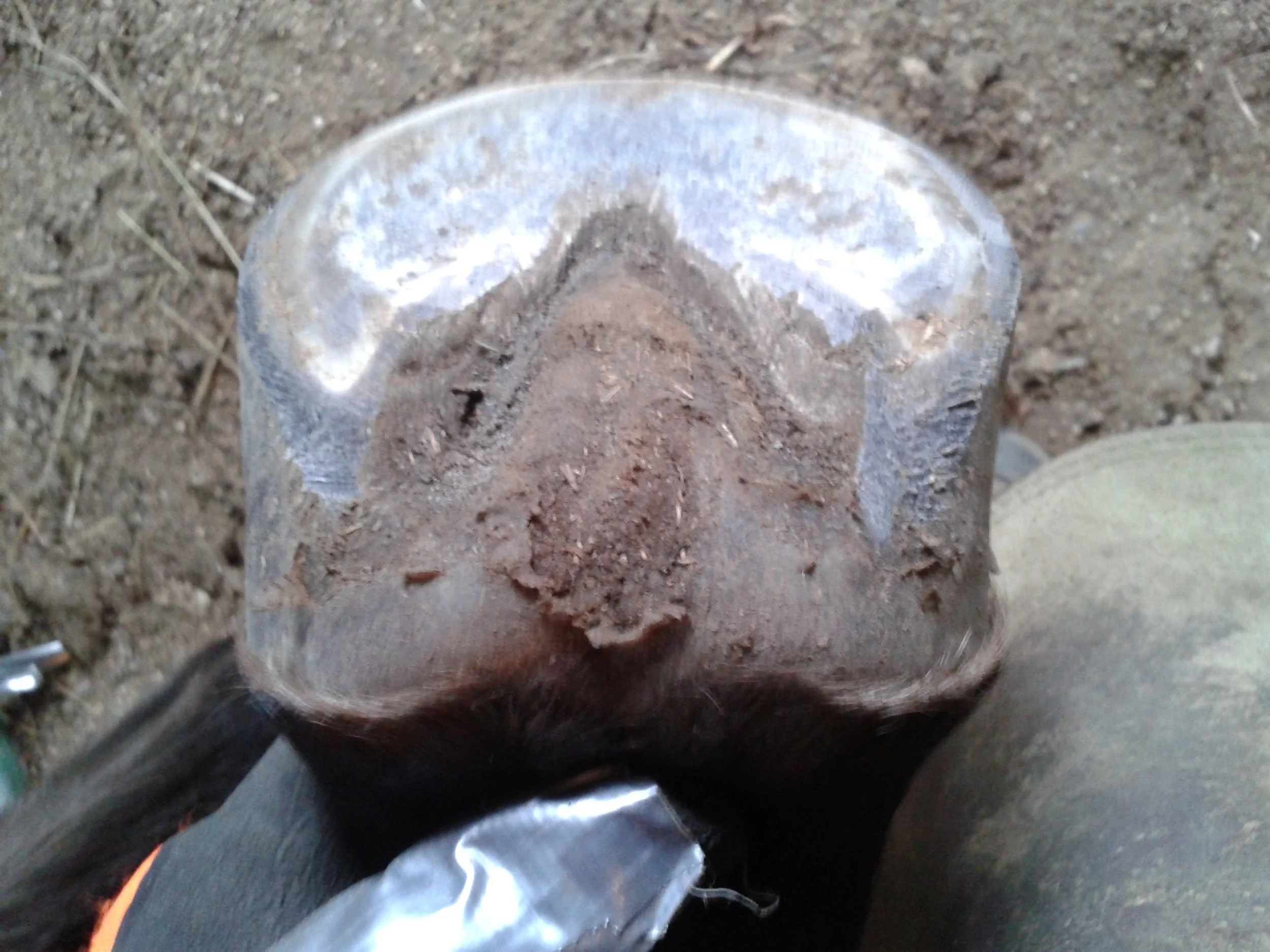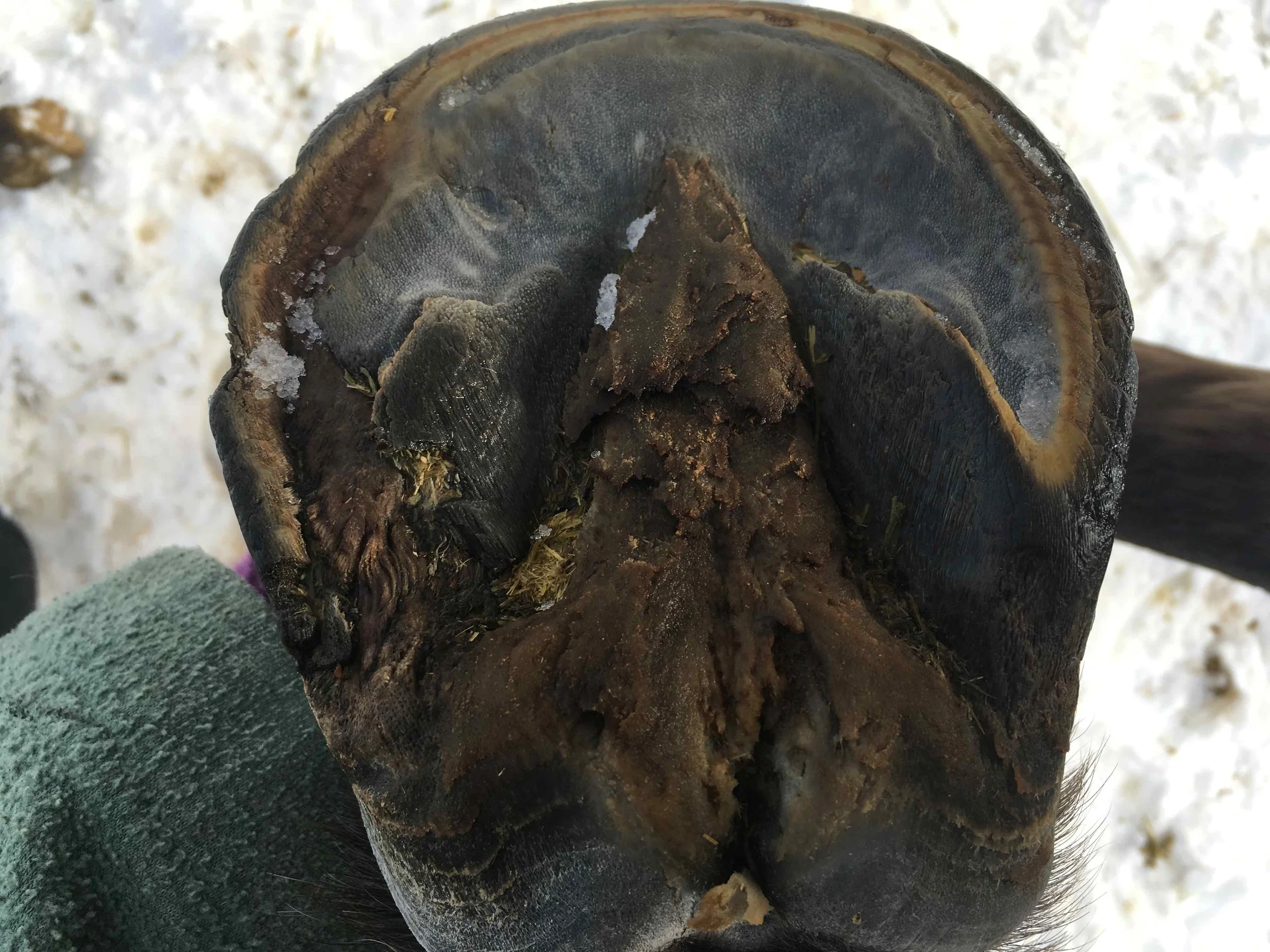 Left hind pre-trim January 2020 — frog and bulbs are increasing in mass; this step should have happened in the first weeks and months of his life; soft tissue bruising and bruising of the heels; the outside wall is still pretty thin