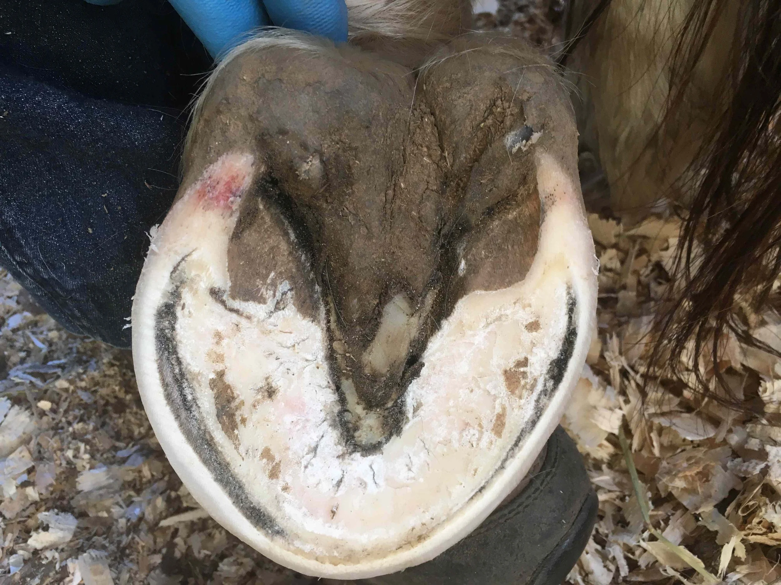 Right front post-trim February 2017 — there was a cut like injury from the sharp and flared tip of the false heel on the medial side