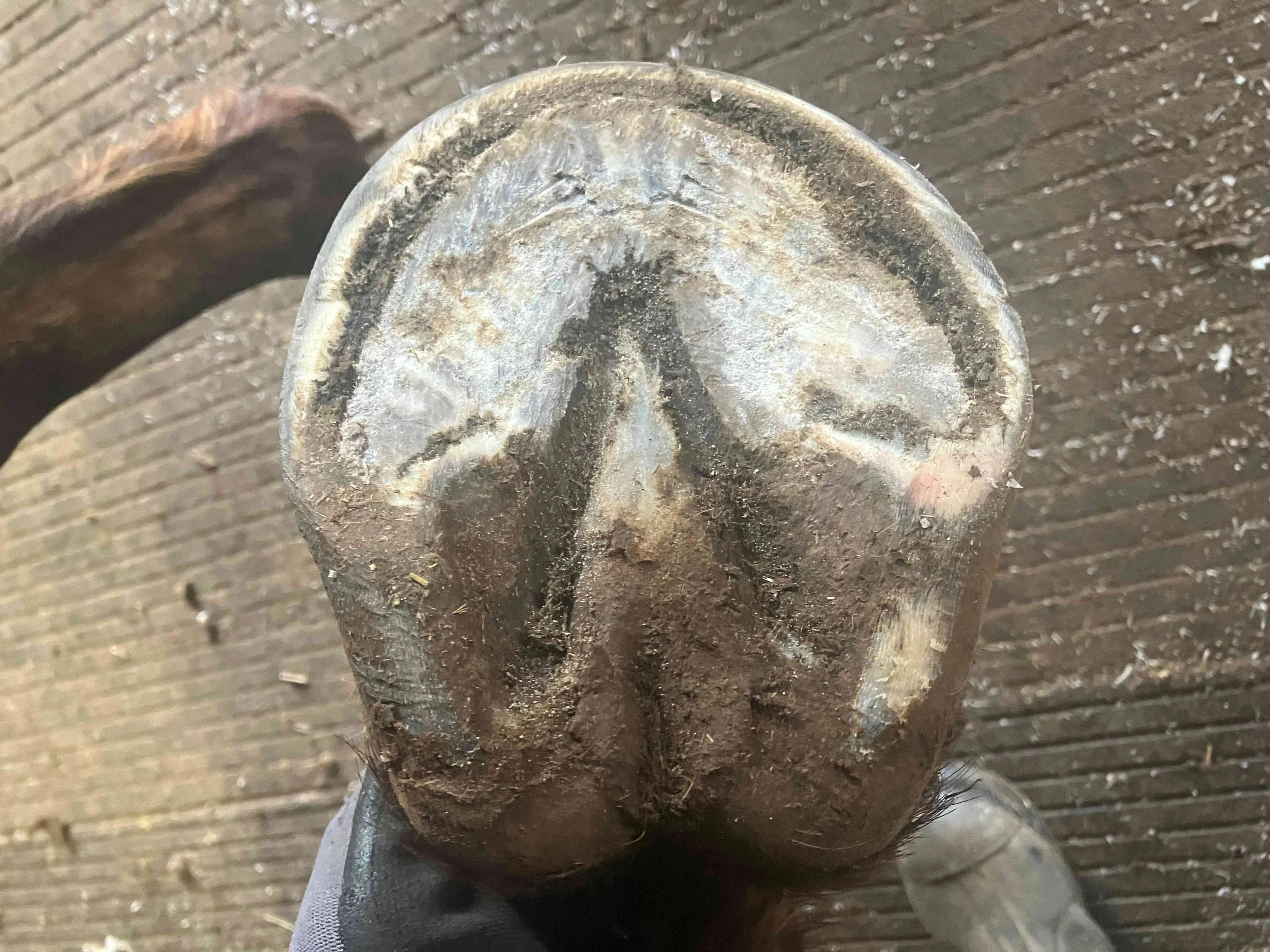 Left hind pre-trim October 2022 — internal structures are increasing; the coffin bone is in a healthier position; I am able to shorten the entire hoof capsule with this trim